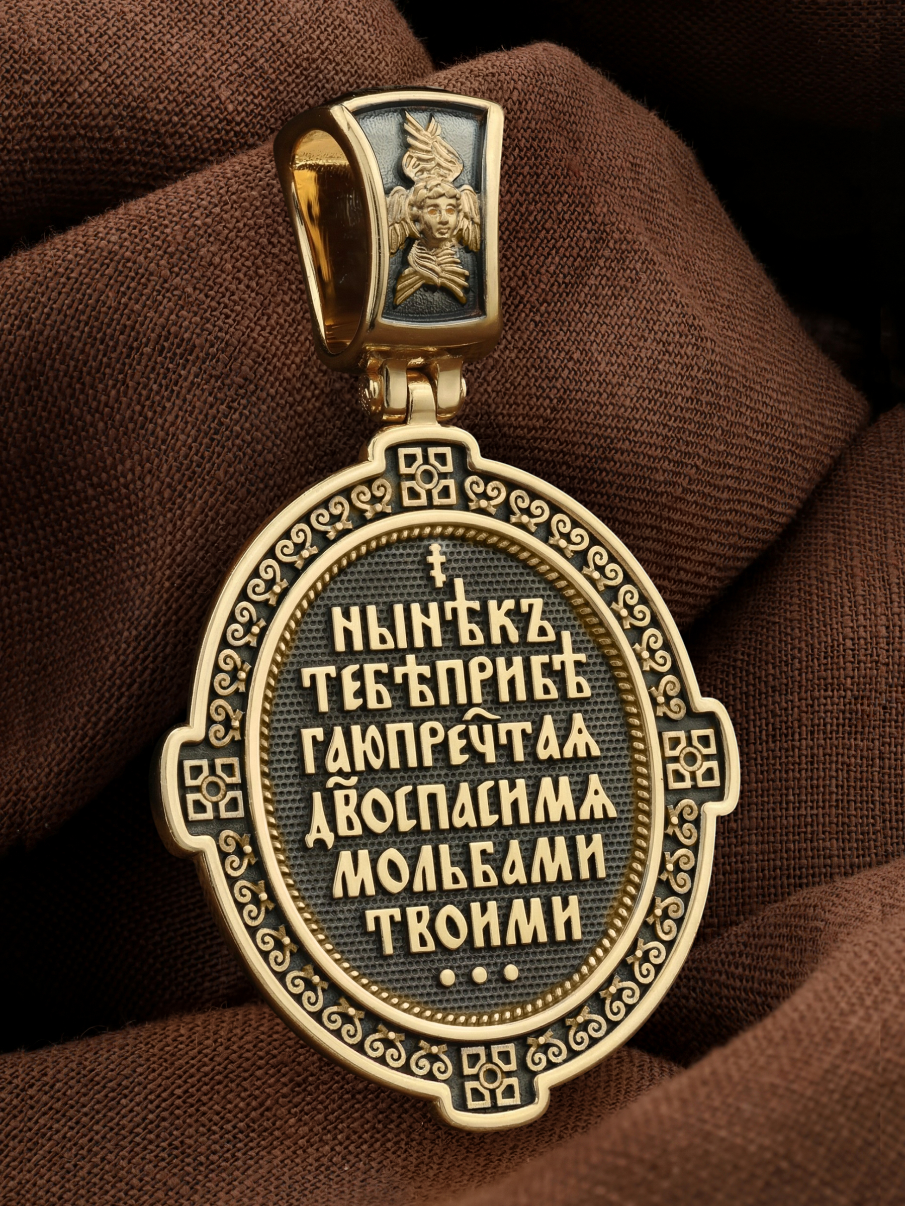 На кулонном кольце изображен Спас Нерукотворный — Символ вочеловечившегося Божества и шестикрылый Серафим — самый приближенный к Господу Ангел.