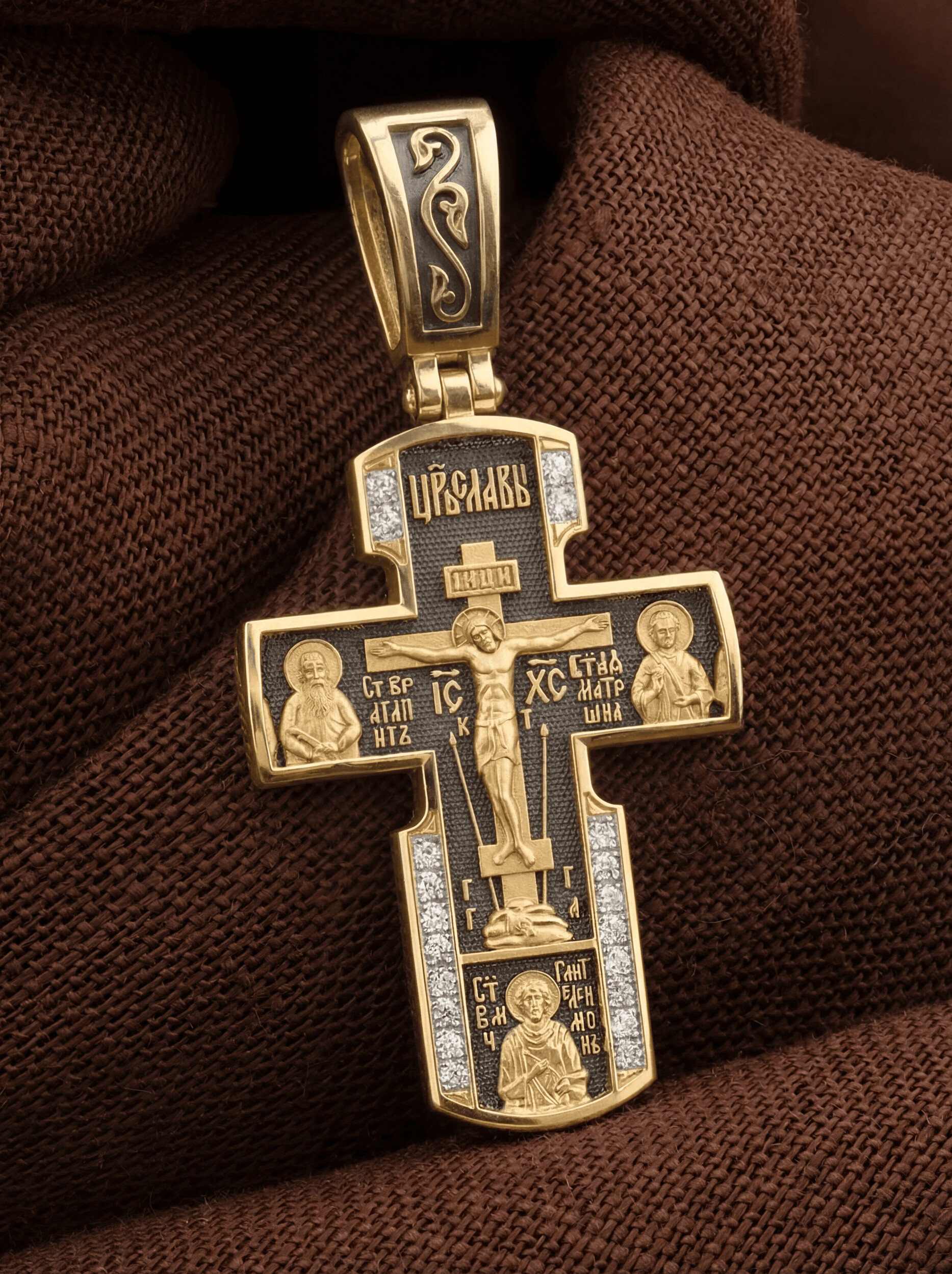 На лицевой стороне креста изображено Распятие Иисуса Христа на Голгофском Кресте, над вершиной которого помещена надпись «Царь Славы». Справа от Распятия помещен образ прославленной святой блаженной Матроны. «Матронушка», — ласково называют эту святую православные за удивительную любовь и помощь, которую она подает всем нуждающимся в ее поддержке. Слева — икона прп. Агапита. Этот святой жил в пещерах Киево-Печерского монастыря в XI веке и бескорыстно врачевал мирян и монахов.