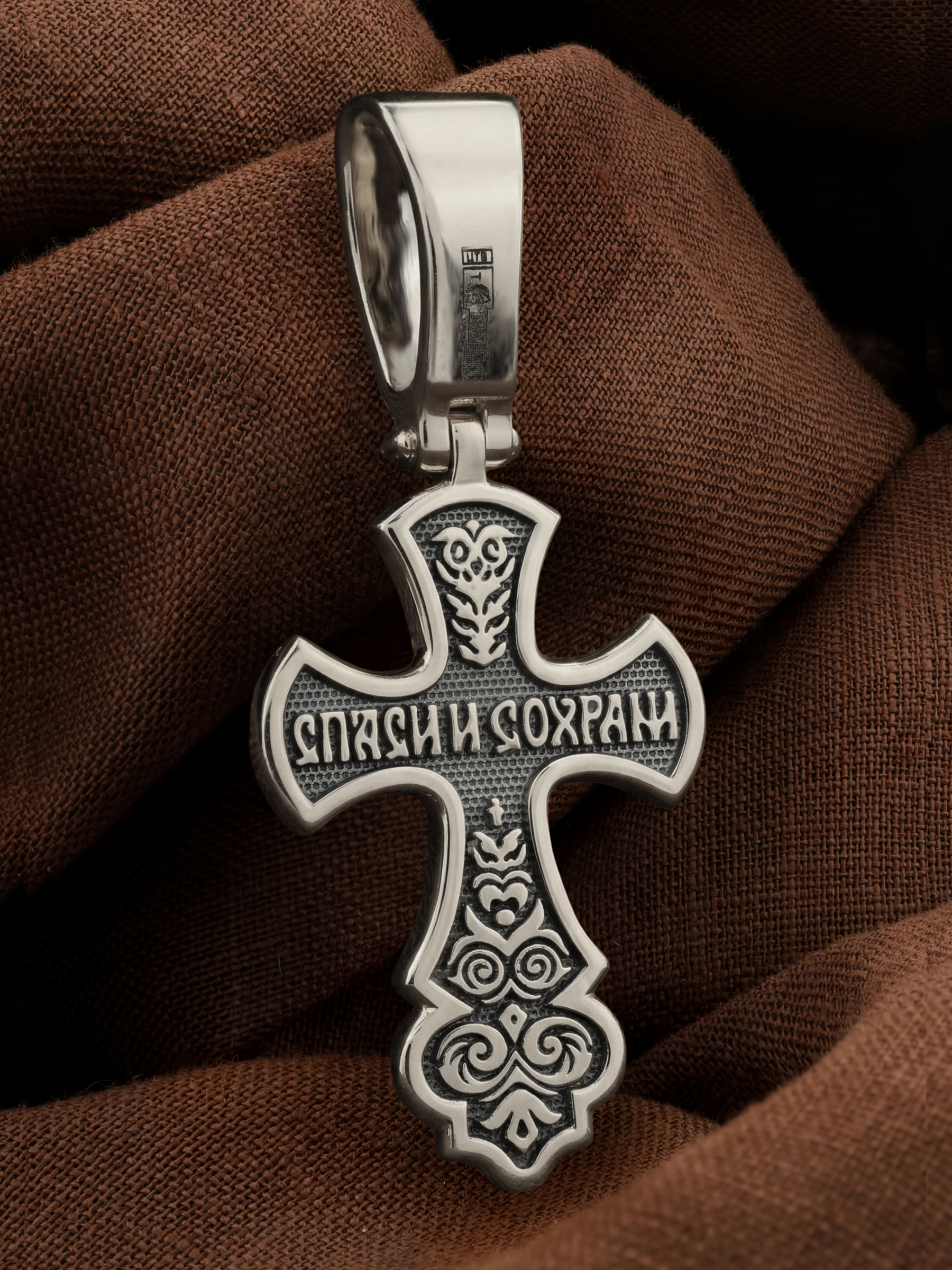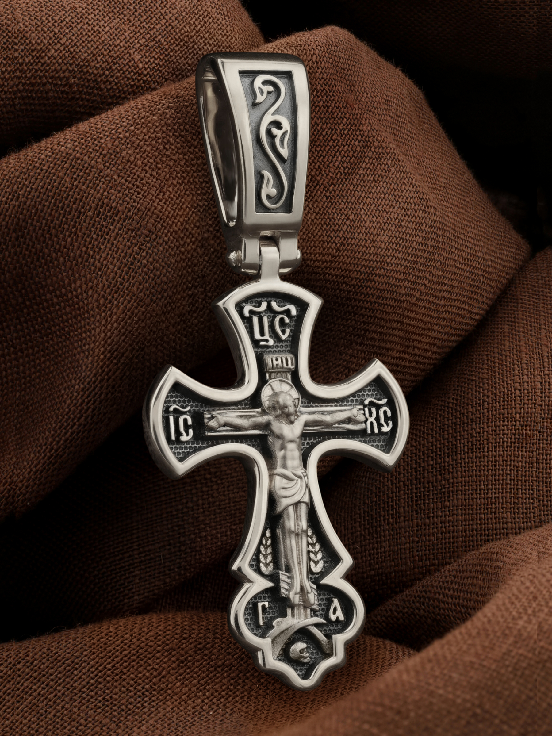 На лицевой стороне креста изображено Распятие, потому что это орудие казни Иисус Христос сделал орудием победы над грехом и смертью. Своими страданиями Он искупил грехи человечества, умерев и сошествовав во ад, победил сатану, освободил души праведников от вечной смерти и открыл им небесные врата рая. Жертва Христа сделала возможным спасение для каждого человека. На православном кресте Христос не умирает, а свободно простирает руки, ладони Иисуса открыты, будто он хочет обнять все человечество, даря им свою любовь и открывая путь к вечной жизни. Над титлом видим буквы «Ц» «С» — Царь Славы. Верхняя перекладина символизирует собой табличку с надписью «IHЦI» — Иисус Назарянин Царь Иудейский. По бокам поперечной перекладины сокращенно написано святое имя Христа «IС ХС». Буквы «Г» и «А» обозначают «Голова Адама». Возвышение, на котором стоит Крест, символизирует гору Голгофу, на которой произошло Распятие. У подножия Креста изображают прах Адама, обозначенный черепом.