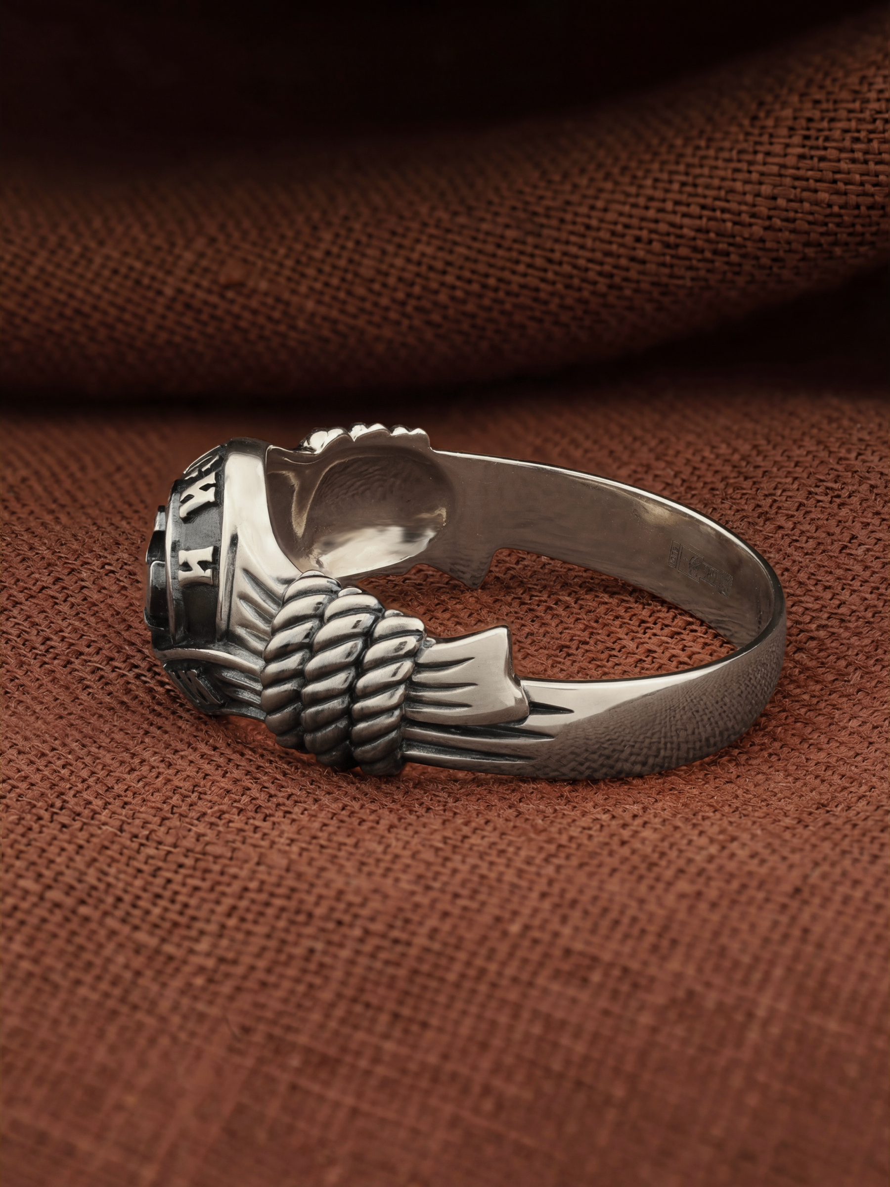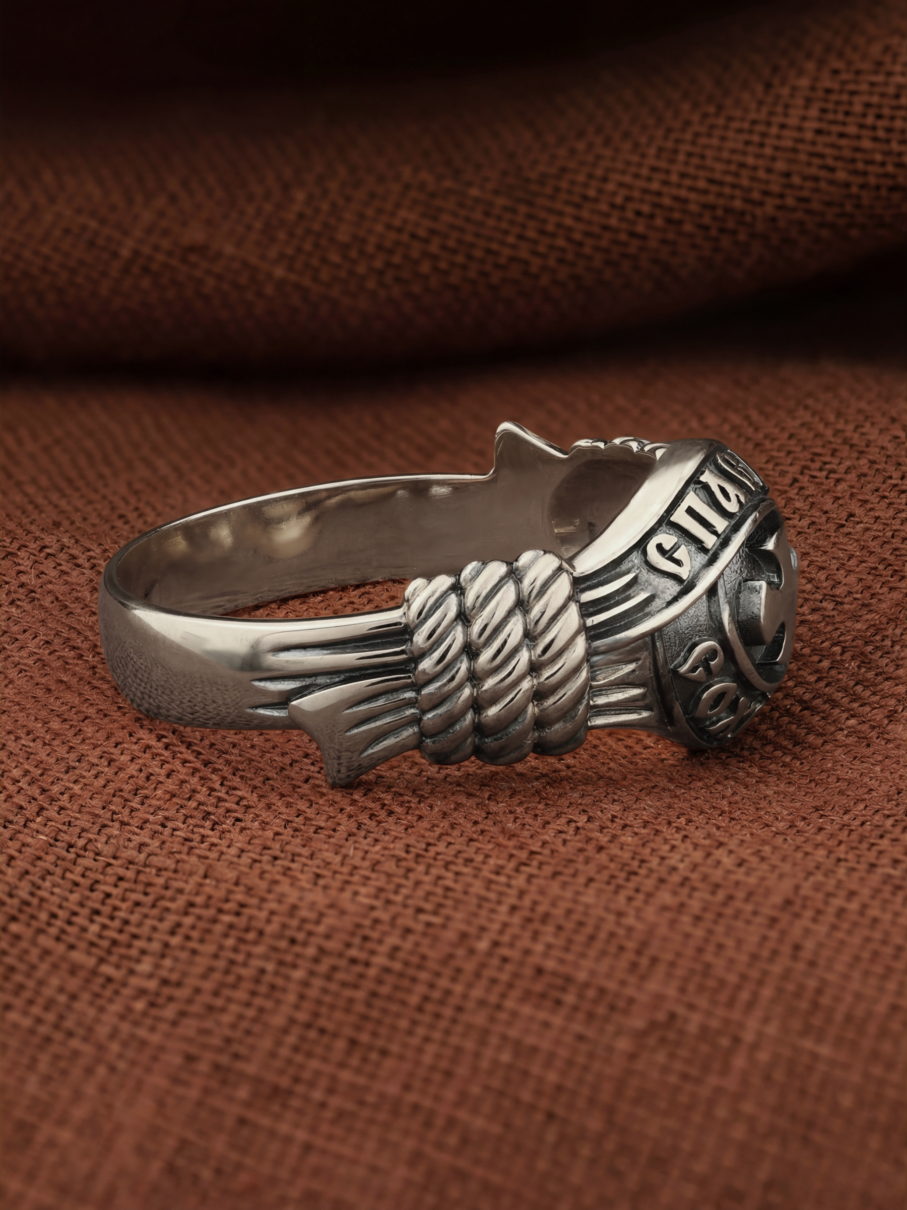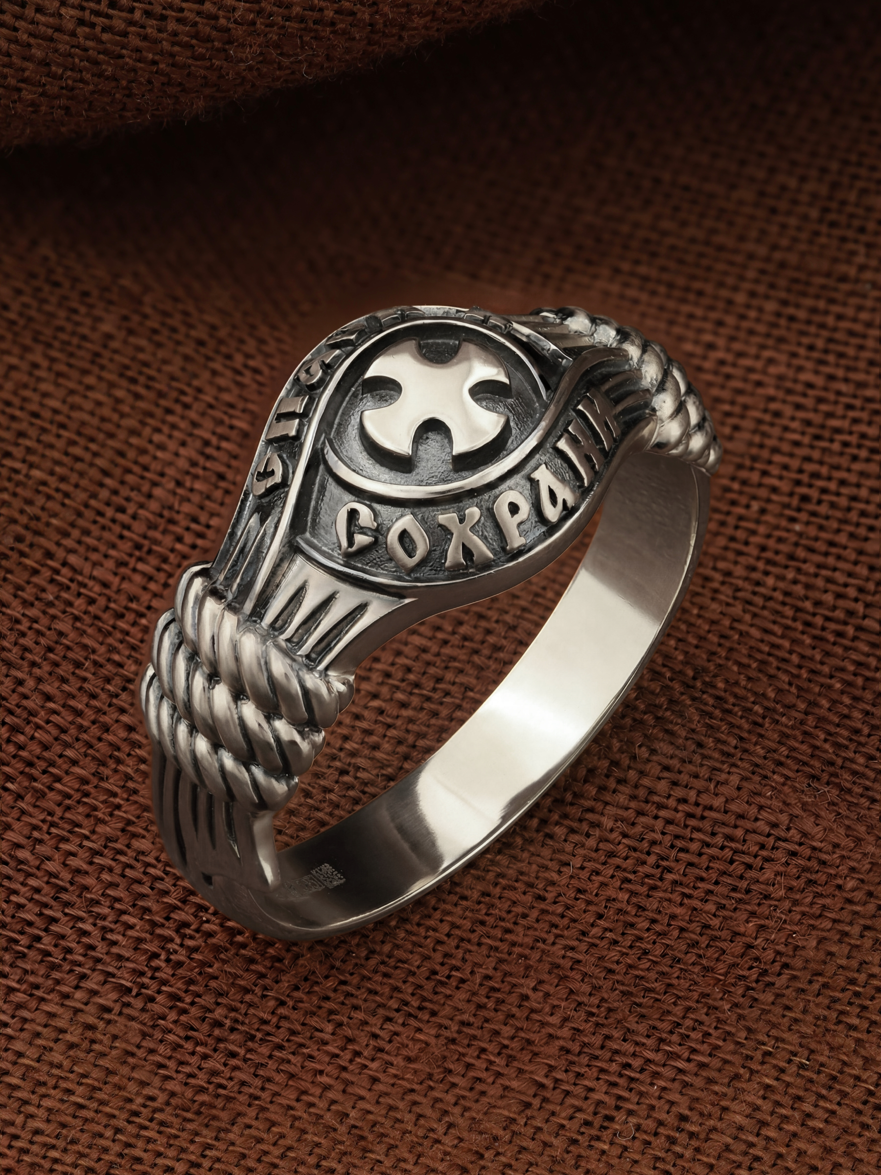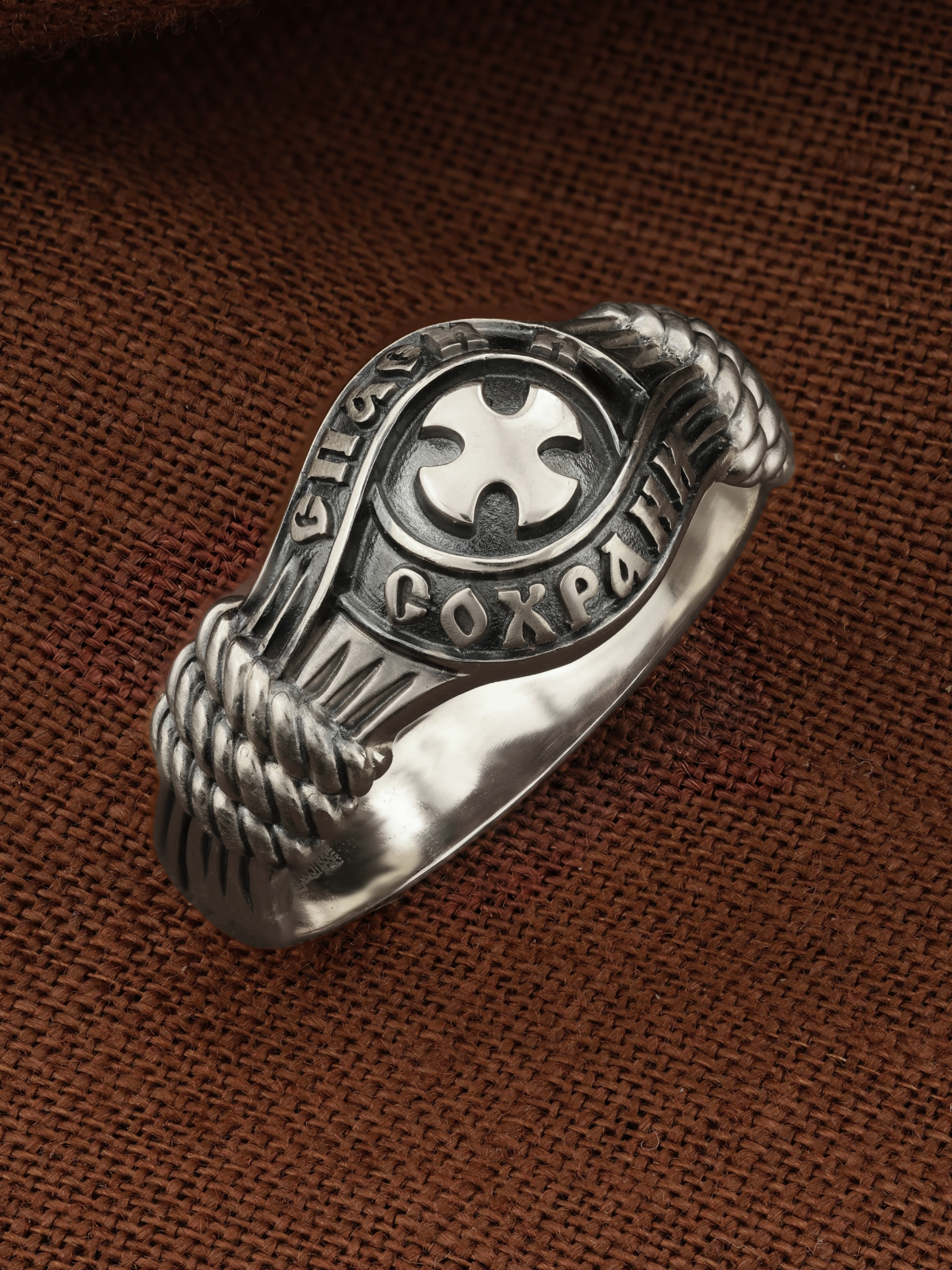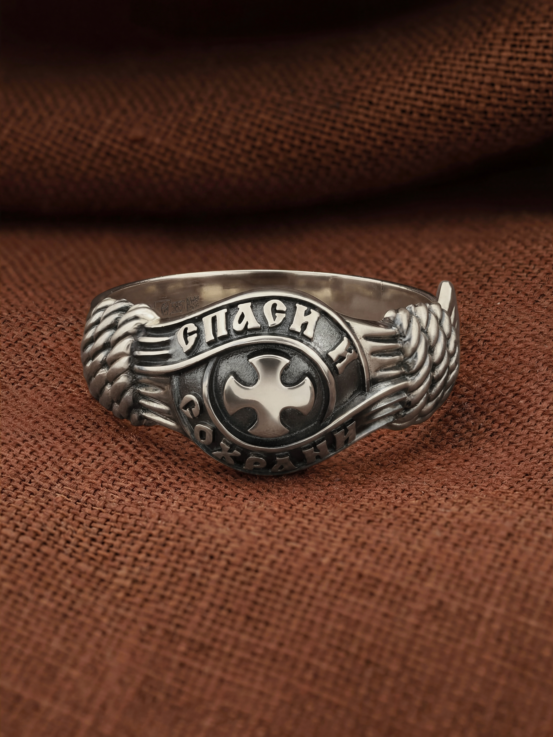 В центральной части лицевой стороны кольца изображен Крест. Господь сказал: кто хочет идти за Мною, отвергнись себя, и возьми крест свой, и следуй за Мною. Крест является символом жертвенной любви Всеблагого Бога к падшим людям, всепобеждающим духовным оружием христиан, основанием и средоточием церковной жизни. Иисус Христос, как искупительная жертва освобождения человечества от власти греха, умер крестной смертью и в третий день воскрес. Крест имеет четырехконечную форму с равными балками. Такого типа кресты существовали во многих дохристианских культурах и были в первую очередь использованы Церковью для выражения идеи христианского преобразования мира. Вокруг креста помещена молитва: «Спаси и Сохрани».