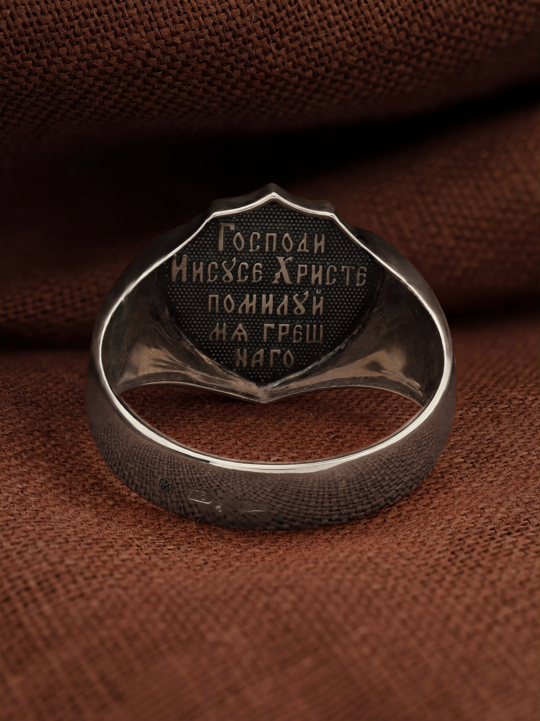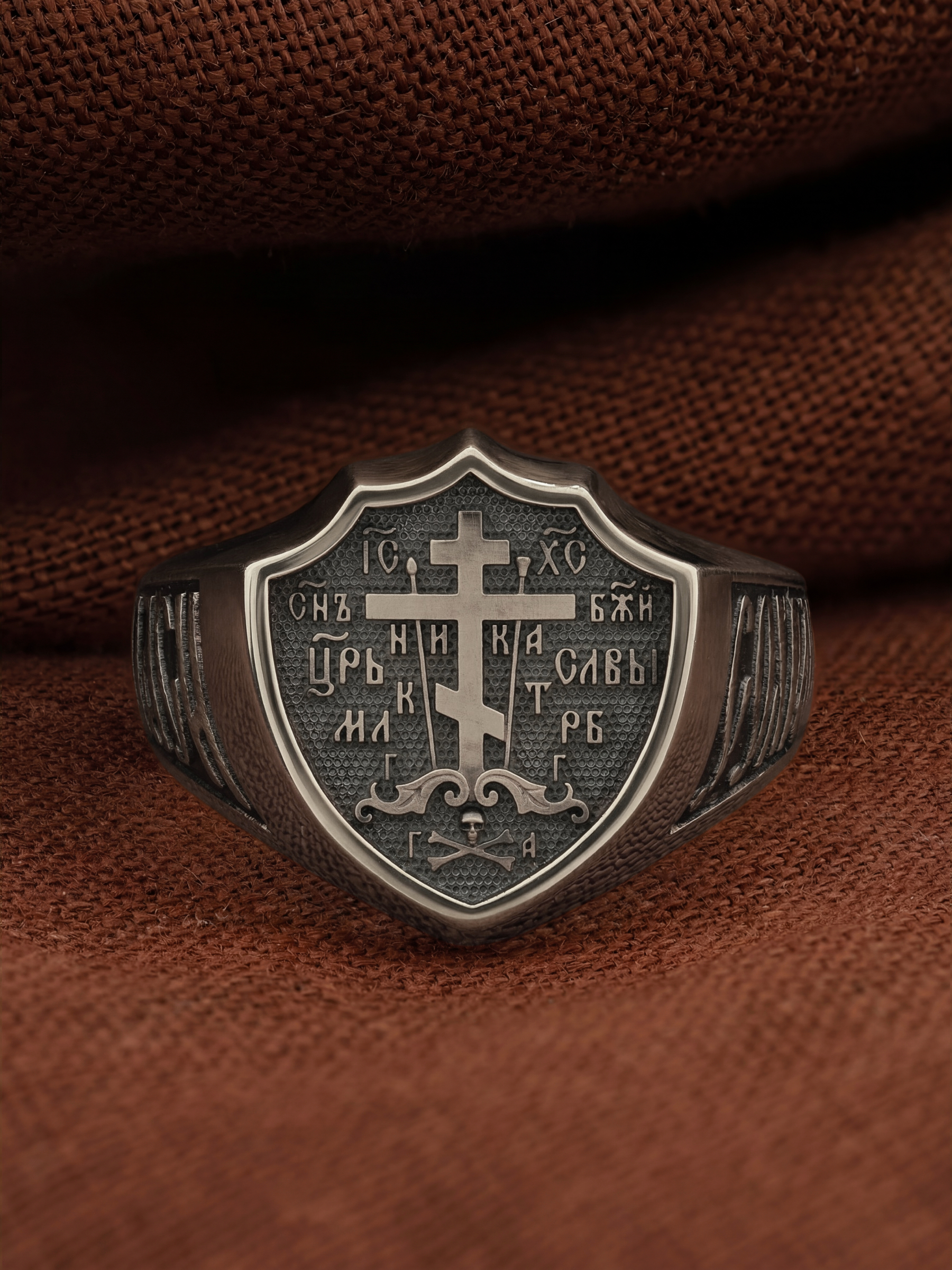 На перстне изображен «Голгофский крест». Центральным и главным элементом композиции лицевой стороны является восьмиконечный крест — образ Честного и Животворящего Креста Господня, установленного на горе Голгофе. В основании креста изображена гора Голгофа, на которой был распят Спаситель и череп Адама, чьи кости по приданию омыла кровь Иисуса Христа. Перед головой располагаются лежащие кости рук, изображаются правая на левой, как при погребении или причащении. В XVI веке на Руси около изображения Голгофы появились обозначения «М.Л.Р.Б.» — Место Лобное Рай Бысть (Голгофа в переводе с еврейского — Лобное место). Чуть ниже справа и слева буквы «Г.Г.» — гора Голгофа.
