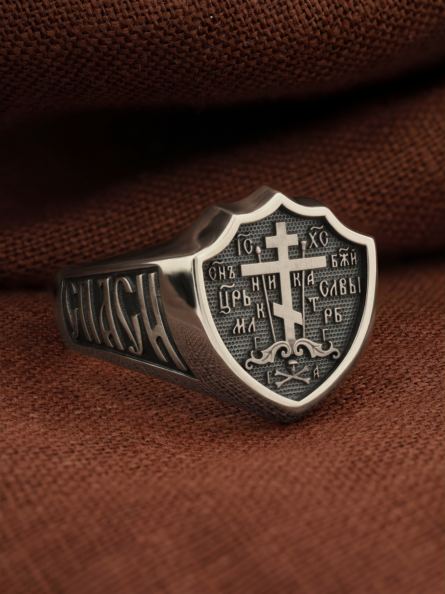 Вдоль креста располагаются буквы «К» и «Т» — означают копье и трость с губкой, пропитанной уксусом, которую подали жаждущему Иисусу Христу. Над средней перекладиной видны слова «ЦРЬ СЛВЫ», что означает Царь Славы. Под ней помещено слово «Ника» — что означает Победитель. Над средней перекладиной видна надпись «СНЪ БЖIЙ», что означает Сын Божий. А над верхней перекладиной надписи «IC» «ХС» — имя Иисуса Христа.