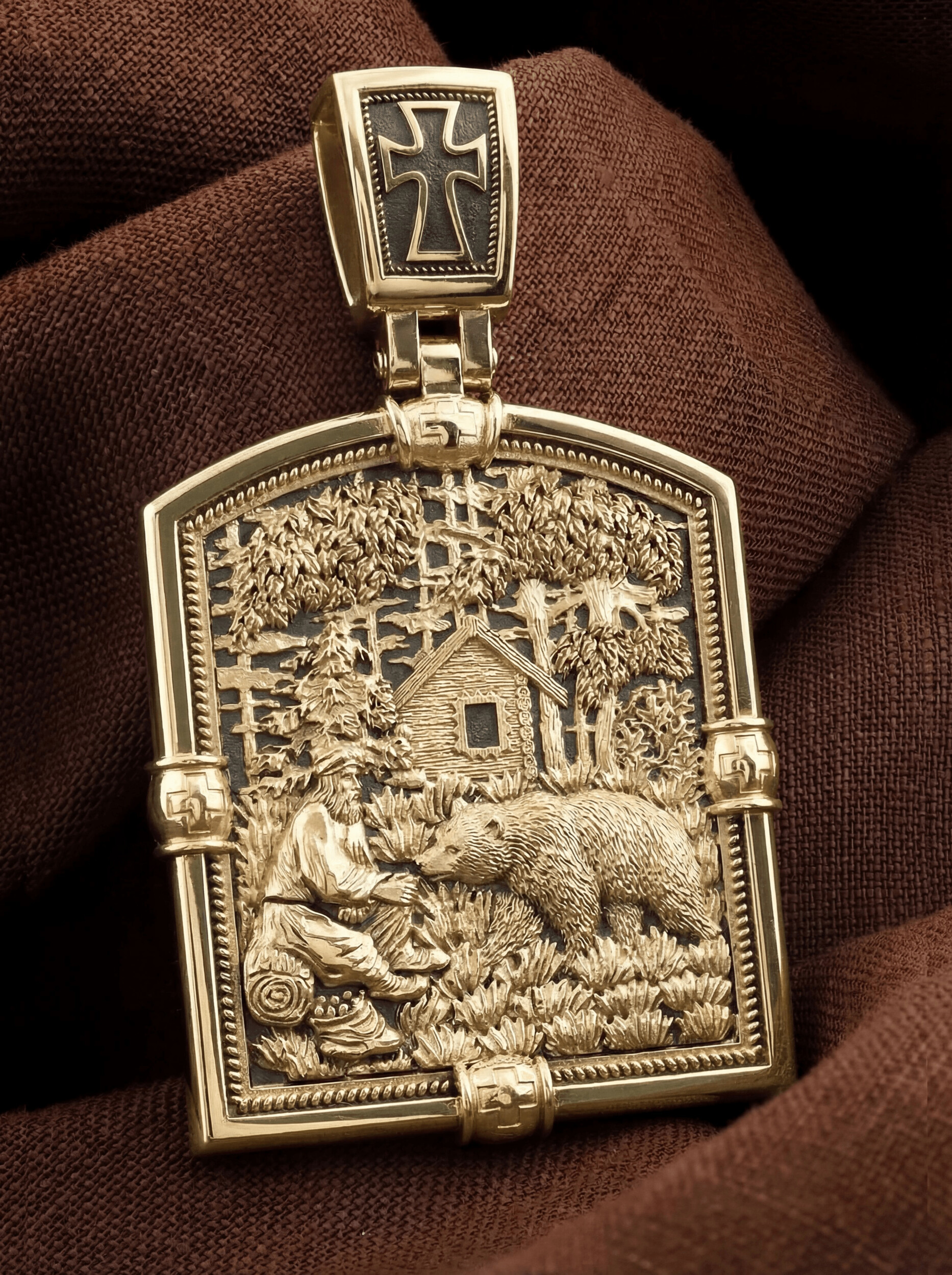 На образке изображен один из самых узнаваемых моментов жития преподобного: Тысячу дней и тысячу ночей Серафим провел в подвиге столпничества на каменном валуне. Узнав о строгой жизни преподобного отца Серафима, многие приходили к нему за советом и наставлениями. Умея узнавать и различать людей, старец от некоторых уклонялся, сохраняя молчание. Но тех, кто имел до него действительную духовную нужду, он охотно принимал и с любовью руководил их своими советами, наставлениями и духовными беседами. Даже диким зверям преподобный Серафим внушал благоговение: многие, посещавшие его в дальней пустыне, видели около него громадного медведя, которого он кормил из рук.