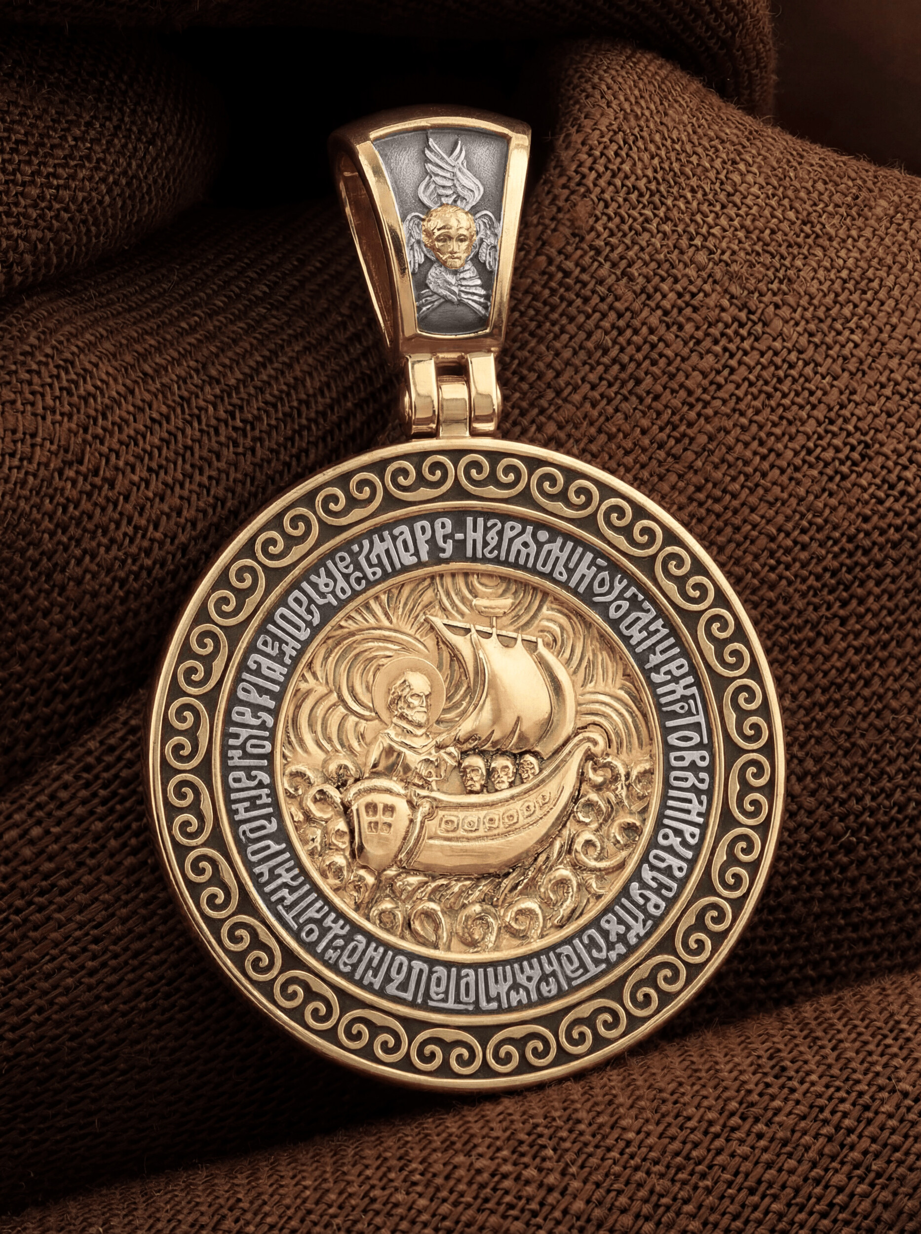 На обороте изображена икона «Чудо спасения трех корабельщиков». Вокруг — слова молитвы. Они просты и одновременно исполнены глубокого символического смысла: «Изрядный угодниче Христов, миру всему источай многоценное милости миро и неисчерпаемое чудес море. Многоценное милости миро — это образ милосердной помощи, которую оказывает Святой Николай Угодник всем обращающимся к нему с молитвой.