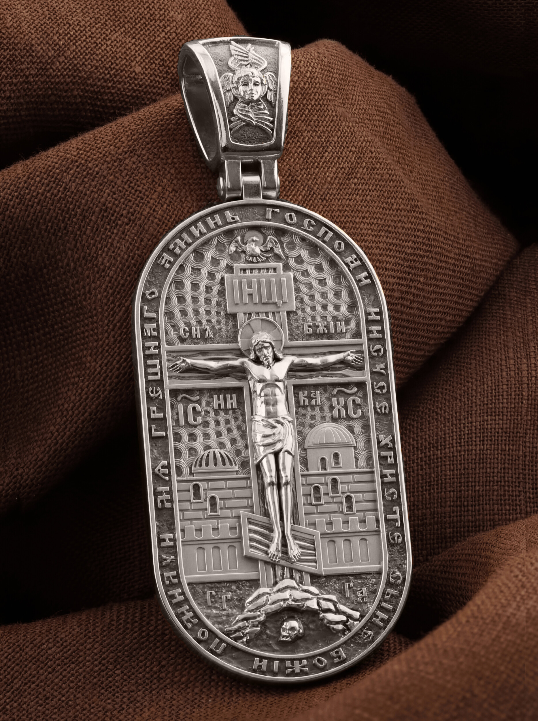 Центральную часть лицевой стороны занимает Распятие Христа — образ жертвы, принесенной Господом за грехи людей. Именно ко Христу, сошедшему на землю ради нашего спасения, возносятся все молитвы. Рядом с Его образом помещены слова — «НИКА» (греч. — Победитель) и «СЫН БОЖИЙ». Эти слова характеризуют Господа как Великого Архиерея, победителя смерти. Также Распятие сопровождается надписями, олицетворяющими Христа — это святое имя Христа «IC» (Иисус) «ХС» (Христос). Верхняя перекладина символизирует собой табличку с надписью «IHЦI» — Иисус Назарянин Царь Иудейский. Возвышение, на котором стоит Крест, символизирует гору Голгофу, на которой произошло Распятие. У подножия Креста изображают прах Адама, обозначенный черепом. На кулонном кольце изображен шестикрылый Серафим — самый приближенный к Господу Ангел. По контуру образка написана молитва: «Господи Иисусе Христе, Сыне Божий, помилуй мя грешного. Аминь»