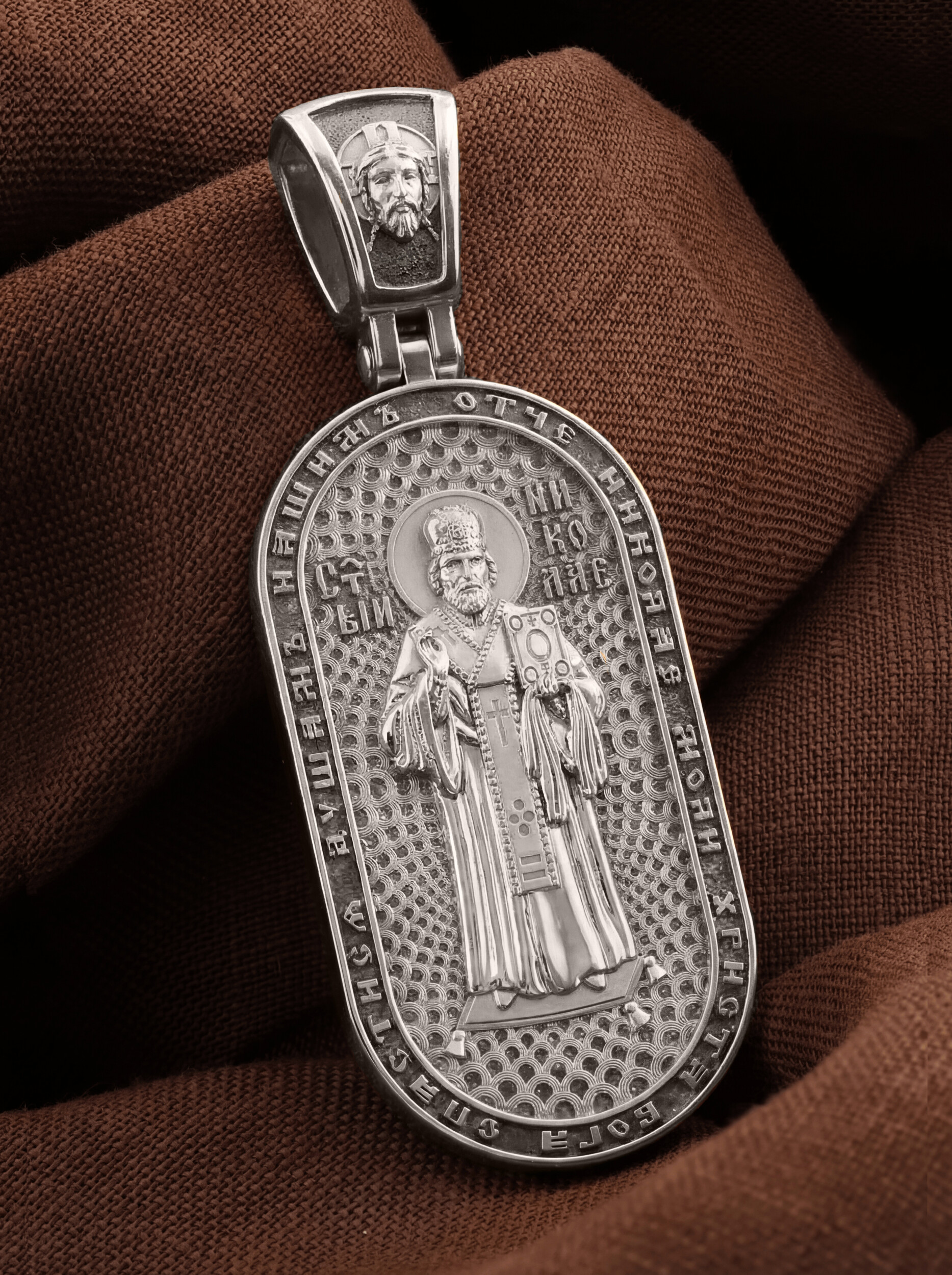 На оборотной стороне изображен Святой Николай Чудотворец, которого еще называют Николай Угодник — помощник в делах, покровитель учащихся, утешитель обиженных и нуждающихся, целитель самых страшных и тяжелых недугов, предстатель и молитвенник за людей перед Богом. Также Святитель Николай Чудотворец известен своими молитвами за путешественников, когда непрестанный ветер и бушующие волны утихают и корабль заходит в спокойную гавань. По контуру написана молитва: «Отче, Николай, моли Христа Бога спастися душам нашим». На кулонном кольце помещено изображение Спаса Нерукотворного.