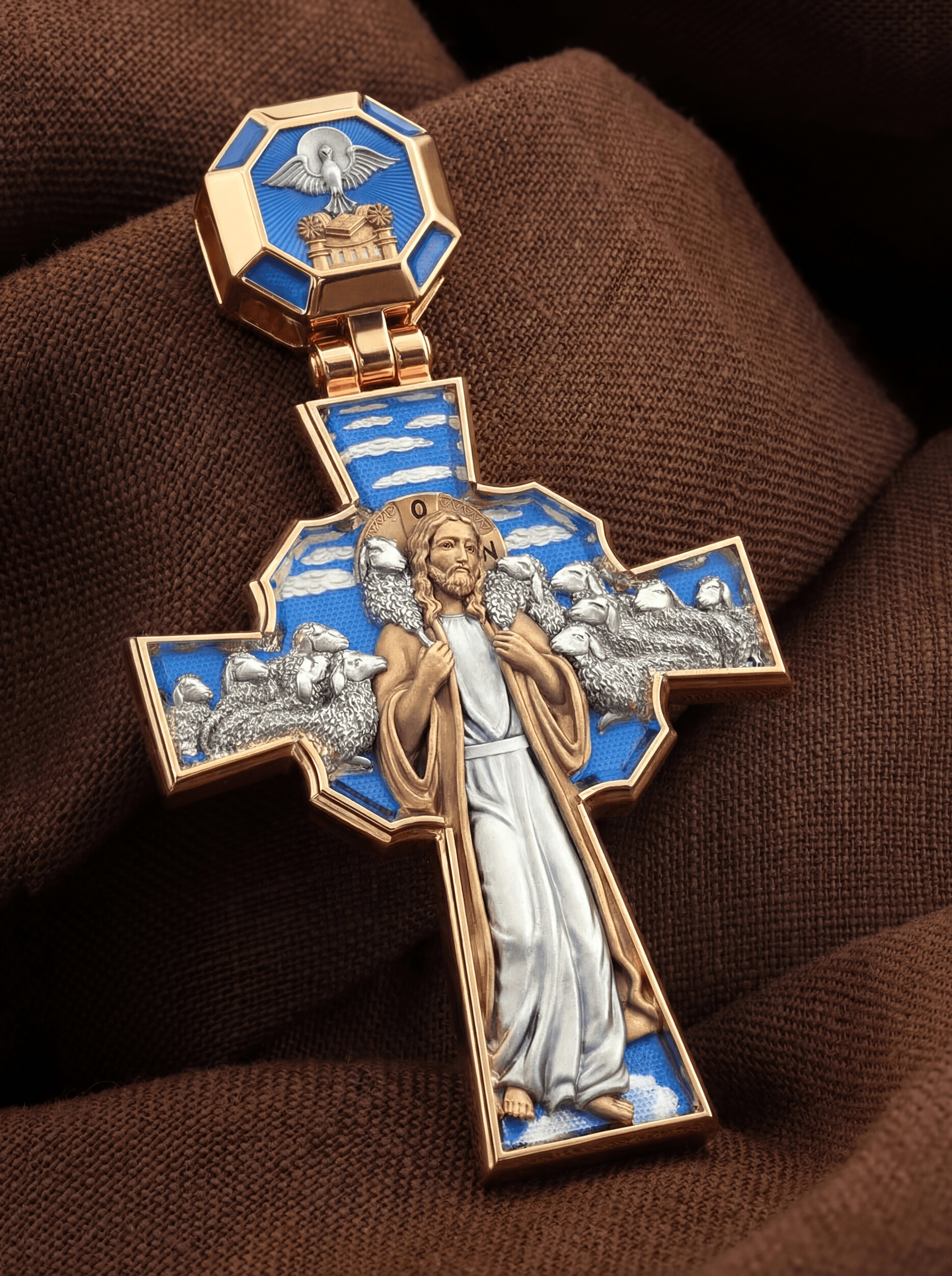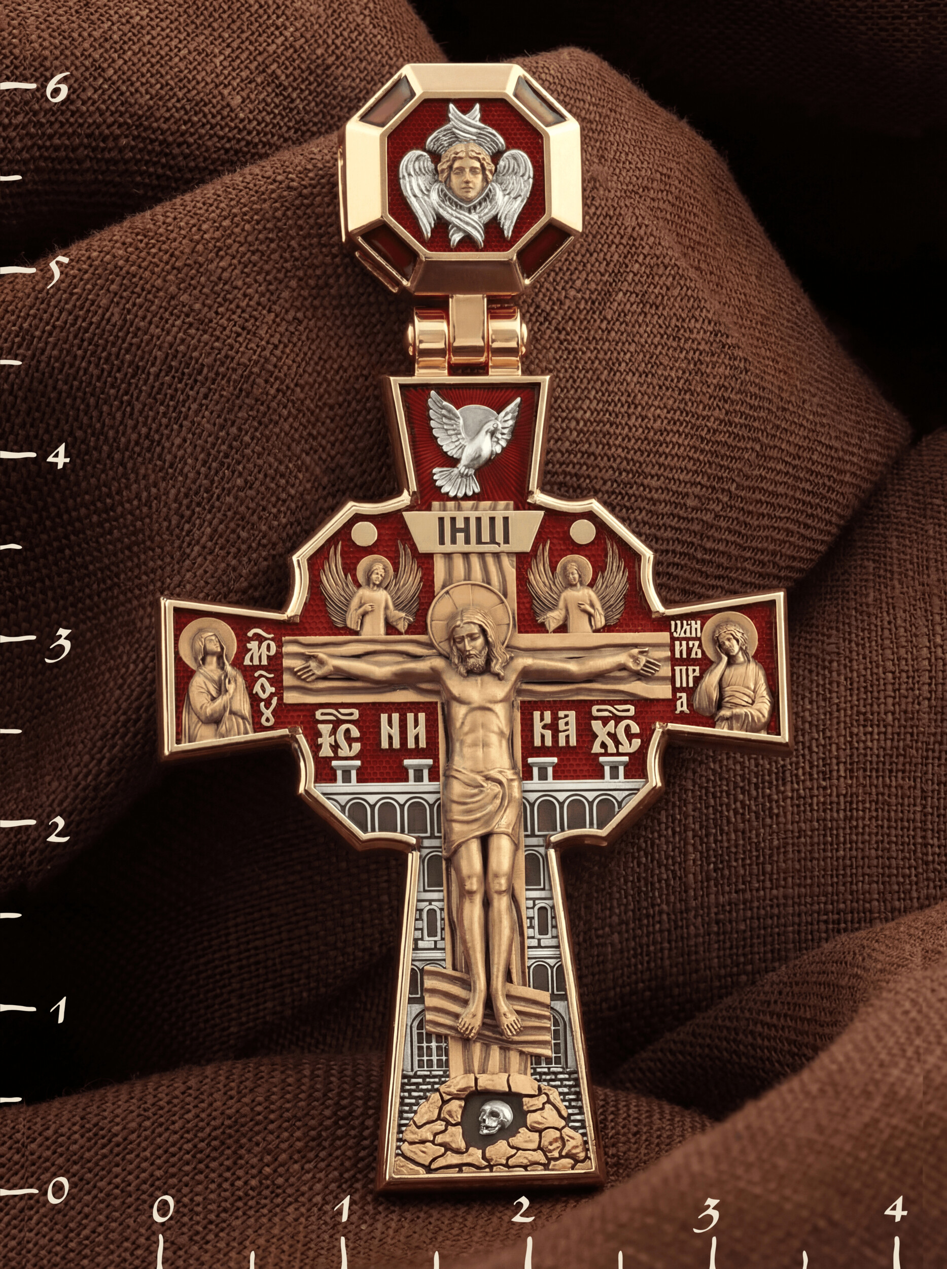 Над Распятием изображен парящий голубь — символ Святого Духа и Его благодати. На кулонном кольце изображен шестикрылый Серафим — самый приближенный к Господу Ангел.