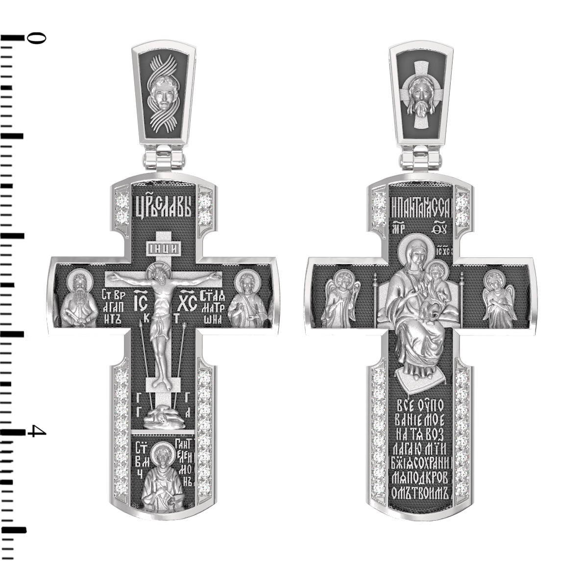 На лицевой стороне креста изображено Распятие Иисуса Христа на Голгофском Кресте, над вершиной которого помещена надпись «Царь Славы». Справа от Распятия помещен образ прославленной святой блаженной Матроны. «Матронушка», — ласково называют эту святую православные за удивительную любовь и помощь, которую она подает всем нуждающимся в ее поддержке. Слева — икона прп. Агапита. Этот святой жил в пещерах Киево-Печерского монастыря в XI веке и бескорыстно врачевал мирян и монахов.