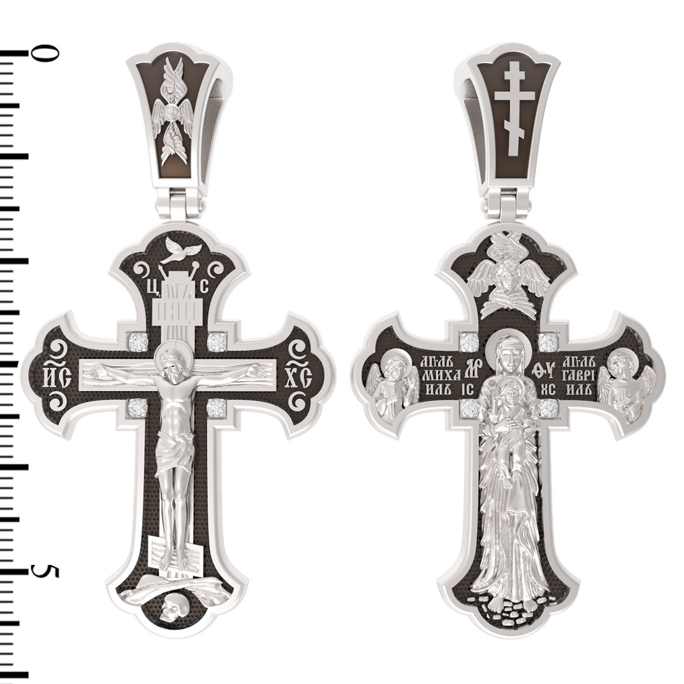 На лицевой стороне этого креста центральную часть занимает икона Распятия Христа — образ жертвы, принесенной Господом за грехи людей. Именно ко Христу, сошедшему на землю ради нашего спасения, возносятся все молитвы. Пресвятая Богородица, ангелы и святые — помощники Господа в деле спасения и заступники за людей перед Богом. «Оружием великим Христовым» именует Церковь крест, потому что, претерпев страдания и умерев, Господь победил смерть и лишил дьявола его власти над миром. Поэтому рядом с титлами Святого имени Христа написано «НИКА», что значит «победитель».