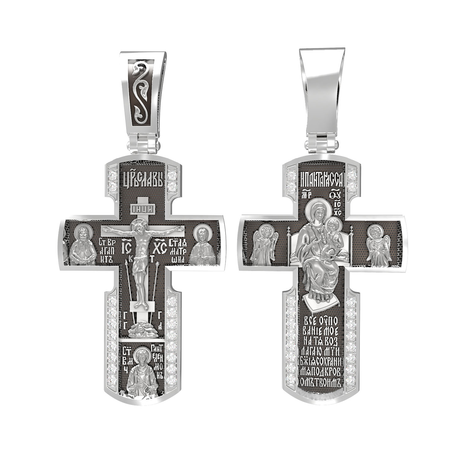 Внизу креста написана молитва обращенная к Божией Матери «Все упование мое на Тя возлагаю, Мати Божия, сохрани мя под кровом Твоим».
