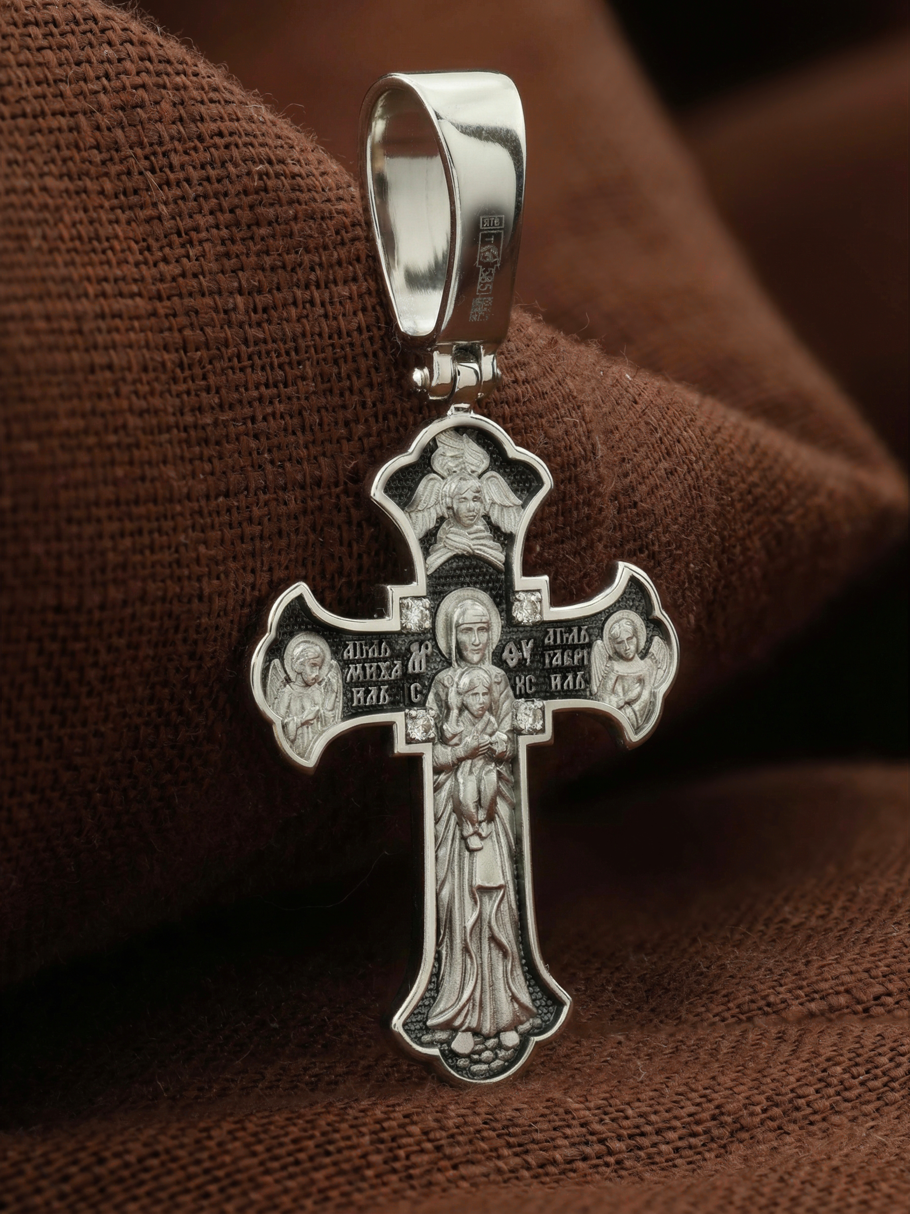 На обратной стороне креста в полный рост изображена Валаамская икона Божией Матери, над которой раскрыл свои крылья серафим. Этот образ написал в 1878 году иеромонах Валаамского монастыря о. Алипий. Валаамскую икону прославили многие чудеса, ее считают целительницей при разных недугах. Перед этим образом Богородицу молят в первую очередь об укреплении веры, просят даровать смирение, твердость в соблюдении заповедей Христовых и об исцелении. Богородице предстоят два архангела, Михаил и Гавриил.