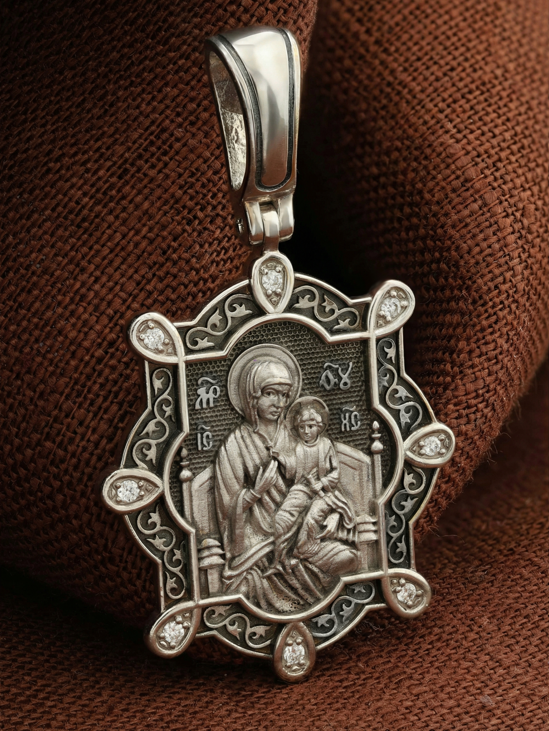 В центр образка помещен образ Божией Матери «Всецарица», восседающая на царском троне. На руках Ее — Богомладенец Иисус Христос со свитком в левой руке. Пальцы Его правой руки сложены в благословляющем жесте.