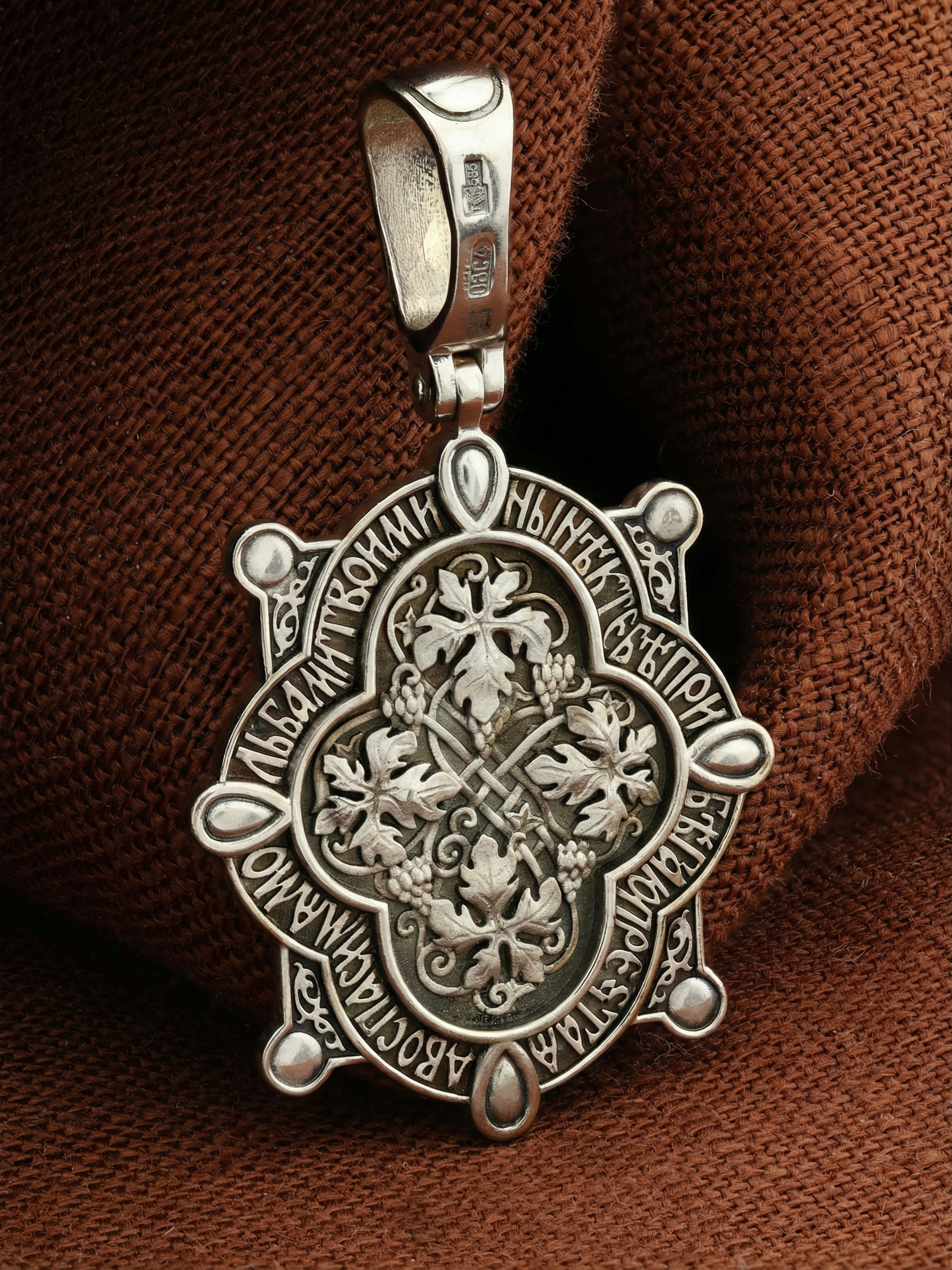 В центр образка помещен образ Божией Матери «Знамение», прославившийся многими чудесами в Новгороде в XII веке. Икона эта чтится как одна из самых великих святынь Русской земли. Молитвенно воздетые руки Богородицы означают заступничество за людей пред Богом. Рядом с Ней, на фоне круглого щита, — благословляющий Божественный Младенец — Спас-Эммануил.