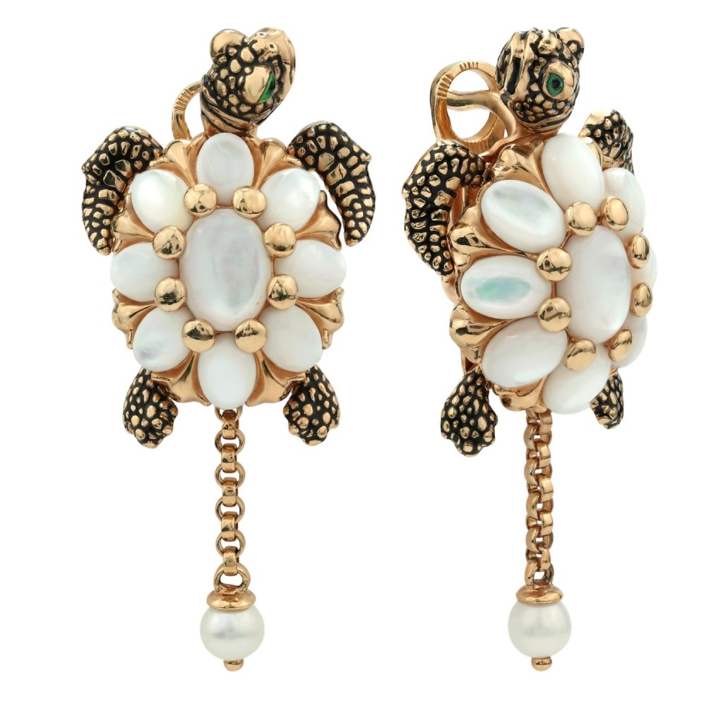 Серьги из золота c эмалью, жемчугом и перламутром