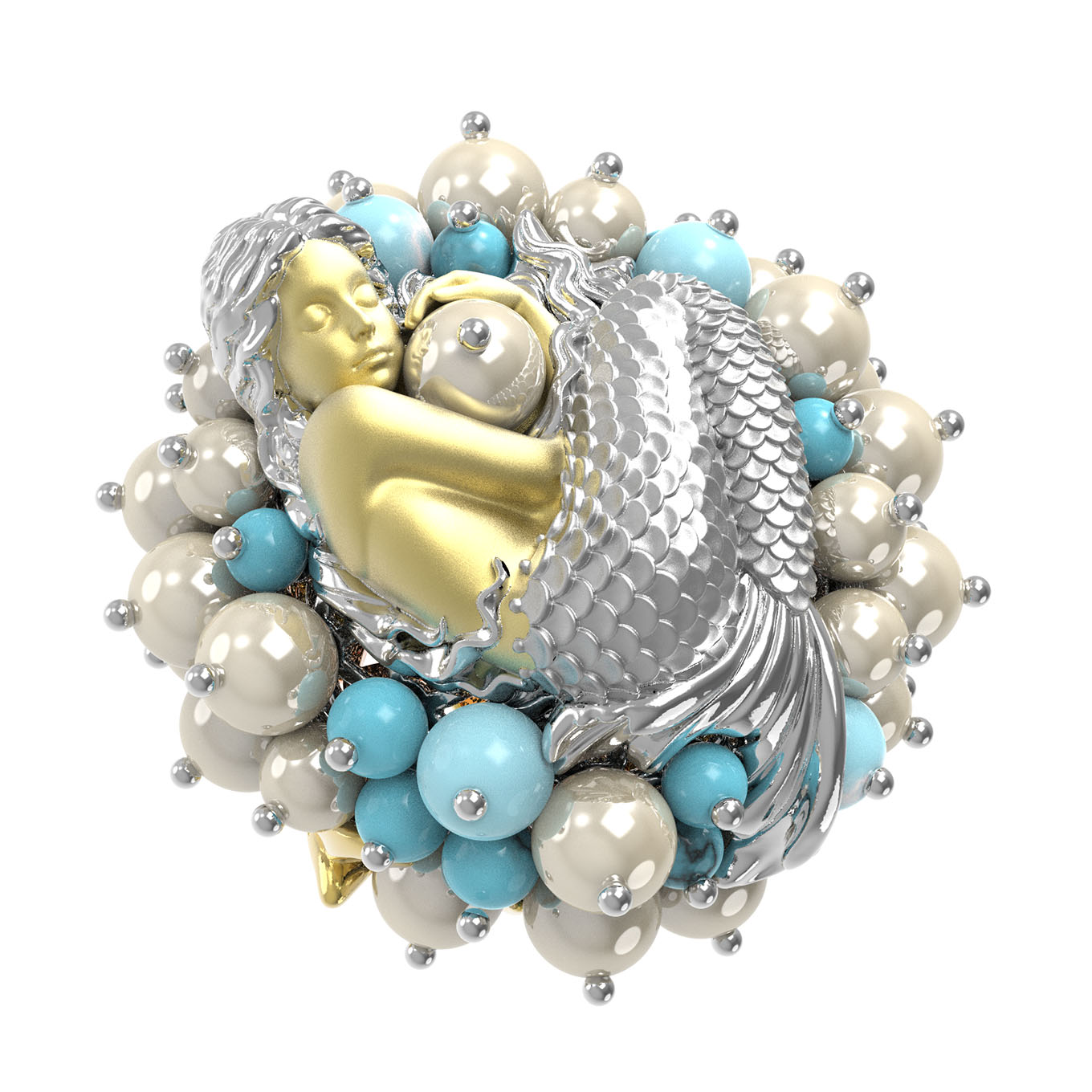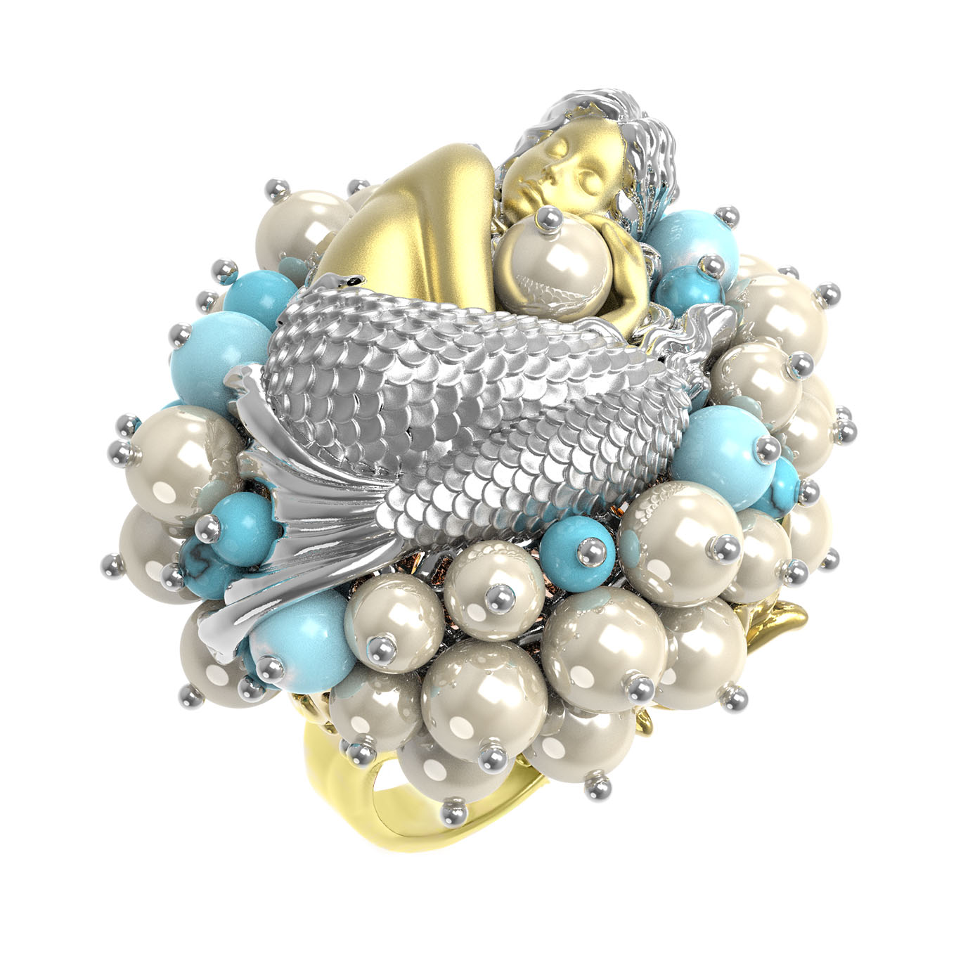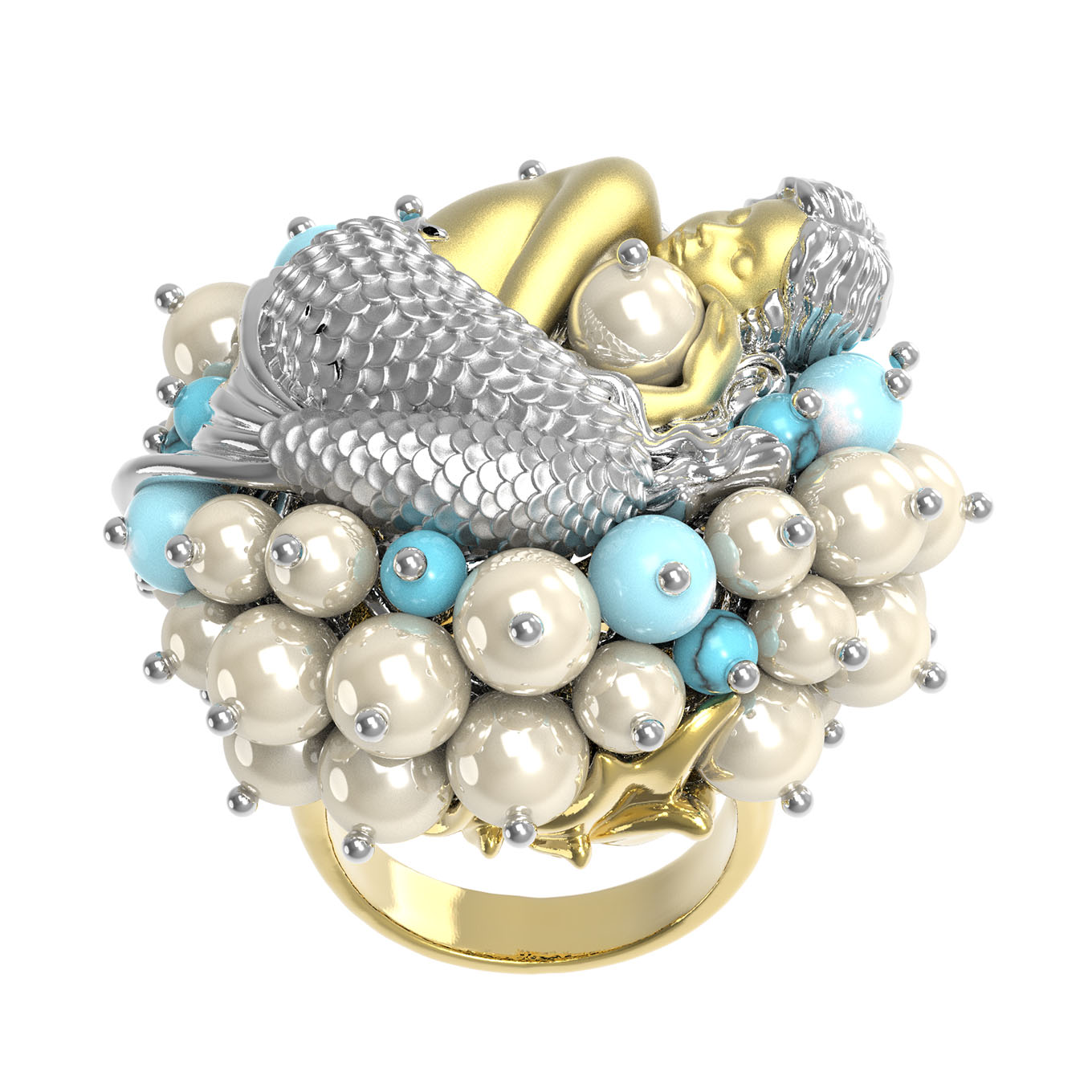Кольцо из лимонного золота c жемчугом и бирюзой
