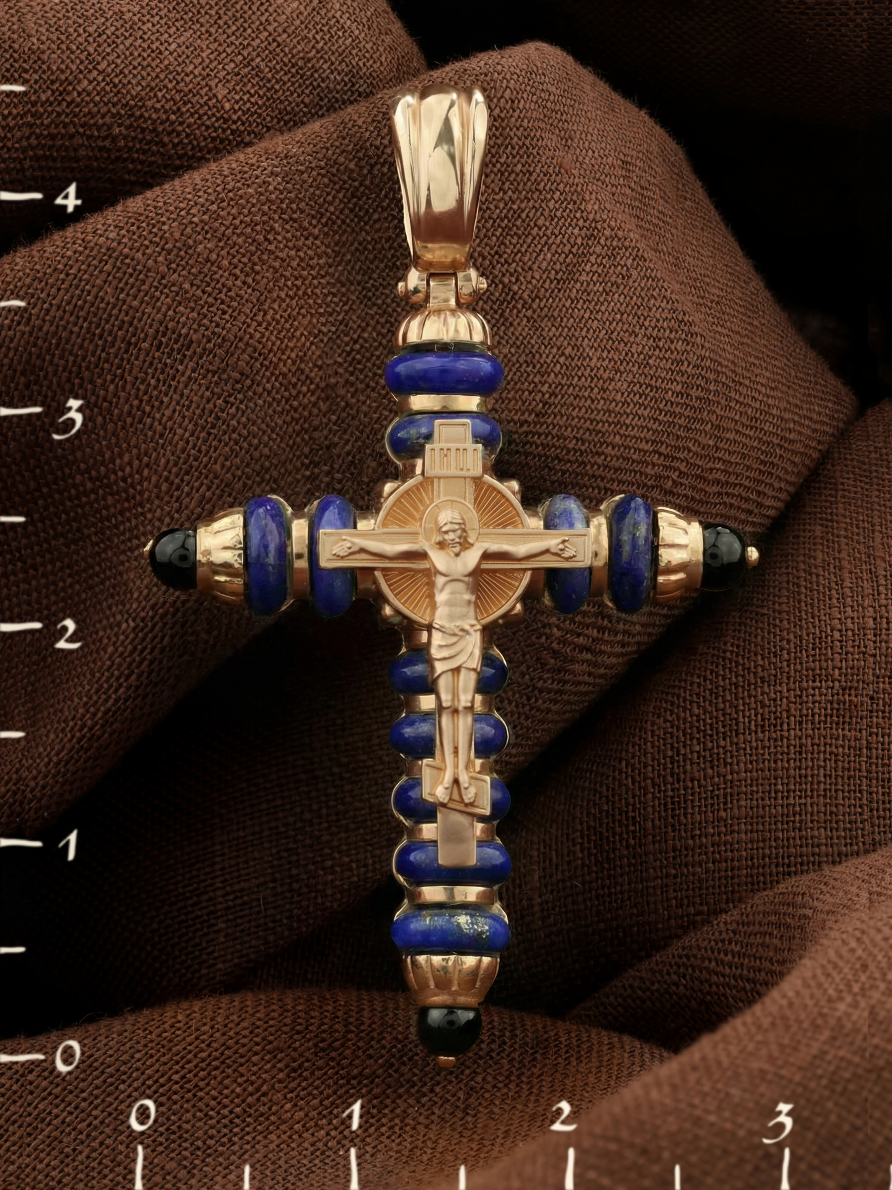 На лицевой стороне креста изображено Распятие Господа и Спасителя нашего Иисуса Христа, отдавшего Себя на смерть для искупления грехов мира. Крест является символом жертвенной любви Всеблагого Бога к падшим людям, всепобеждающим духовным оружием христиан, основанием и средоточием церковной жизни. Над вершиной Распятия помещена надпись «Царь Славы». На верхней перекладине расположена надпись «IНЦI». Она символизирует титло — табличку, на которой, согласно Евангелию, было начертано: Иисус Назорей, Царь Иудейский. Надпись «IC» «ХC»», означает Иисус Христос, помещаются на разных сторонах поперечной перекладины креста. Ниже помещена надпись «НИКА», что означает «победитель».