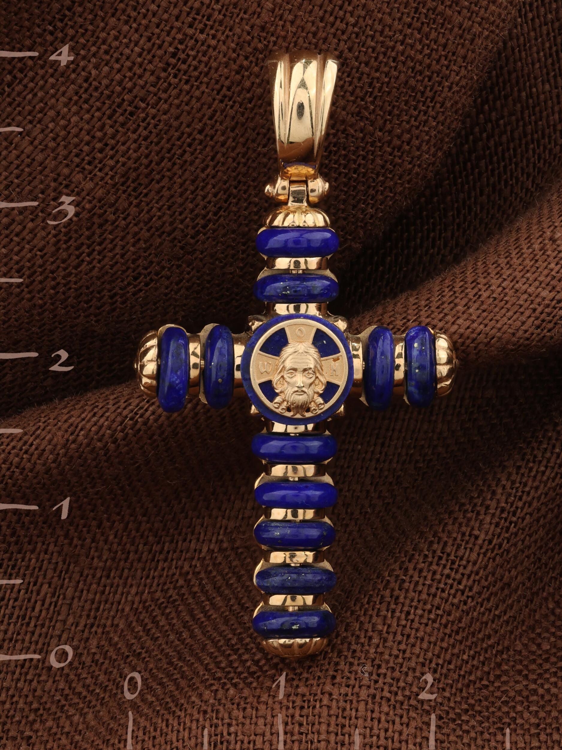 В центральной части лицевой стороны креста изображен Спас Нерукотворный — образ Господа и Спасителя нашего Иисуса Христа, чудесно отпечатавшийся на плате, котором Христос вытер свой лик. Согласно Преданию, изложенному в Четьи Минее, Авгарь V Ухама, больной проказой, послал ко Христу своего архивария Ханнана (Ананию) с письмо, в котором просил Христа прийти в Едессу и исцелить его. Ханнан же был художником, и Авгарь поручил ему, если Спаситель не сможет прийти, то написать хотя бы Его образ и принести ему. Видя, что Ханнан хочет сделать Его портрет, Христос потребовал воды, умылся, вытер Свой лик платом, и на этом плате отпечатался Его образ. Спаситель передал этот плат Ханнану с повелением отнести с ответным письмом пославшему его. Получив портрет, Авгарь исцелился от главного своего недуга, но лицо его оставалось еще поврежденным. После Пятидесятницы в Едессу пошёл святой апостол Фаддей, один из 70-ти, закончил исцеление Авгаря и обратил его в христианство. Авгарь прикрепил образ к доске и поместил в нише над городскими воротами, убрав оттуда находившегося там идола.