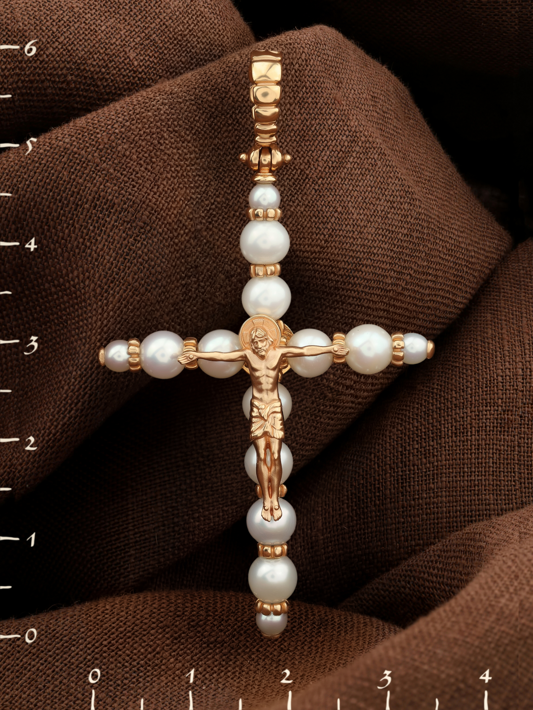 На лицевой стороне креста изображено Распятие Господа и Спасителя нашего Иисуса Христа. Своими крестными страданиями Господь смыл наши грехи, покрыл наш долг перед Богом или, на языке Писания, нас «искупил». В Голгофе сокрыта непостижимая тайна бесконечной правды и любви Бога. Крест стал символом победы добра над злом, жизни над смертью, напоминанием бесконечной Божьей любви, предметом радости. Воплотившийся Сын Божий Своею кровью освятил крест и сделал его проводником Своей благодати, источником освящения верующих. На верхней табличке, выше головы Иисуса, расположена надпись, составленная Понтием Пилатом — «IНЦI». Она означает «Иисус Назорей, Царь Иудейский». Надпись «IC» «ХC», означает Иисус Христос, помещаются на разных сторонах поперечной перекладины креста. Христос в Своей Божественной любви, над которой смерть не властна и которая, страдая, и не страдает в обычном смысле, простирает к людям со Креста Свои объятия, в которые призывается и привлекается весь мир. Поэтому Тело Его не висит, а торжественно покоится на Кресте.