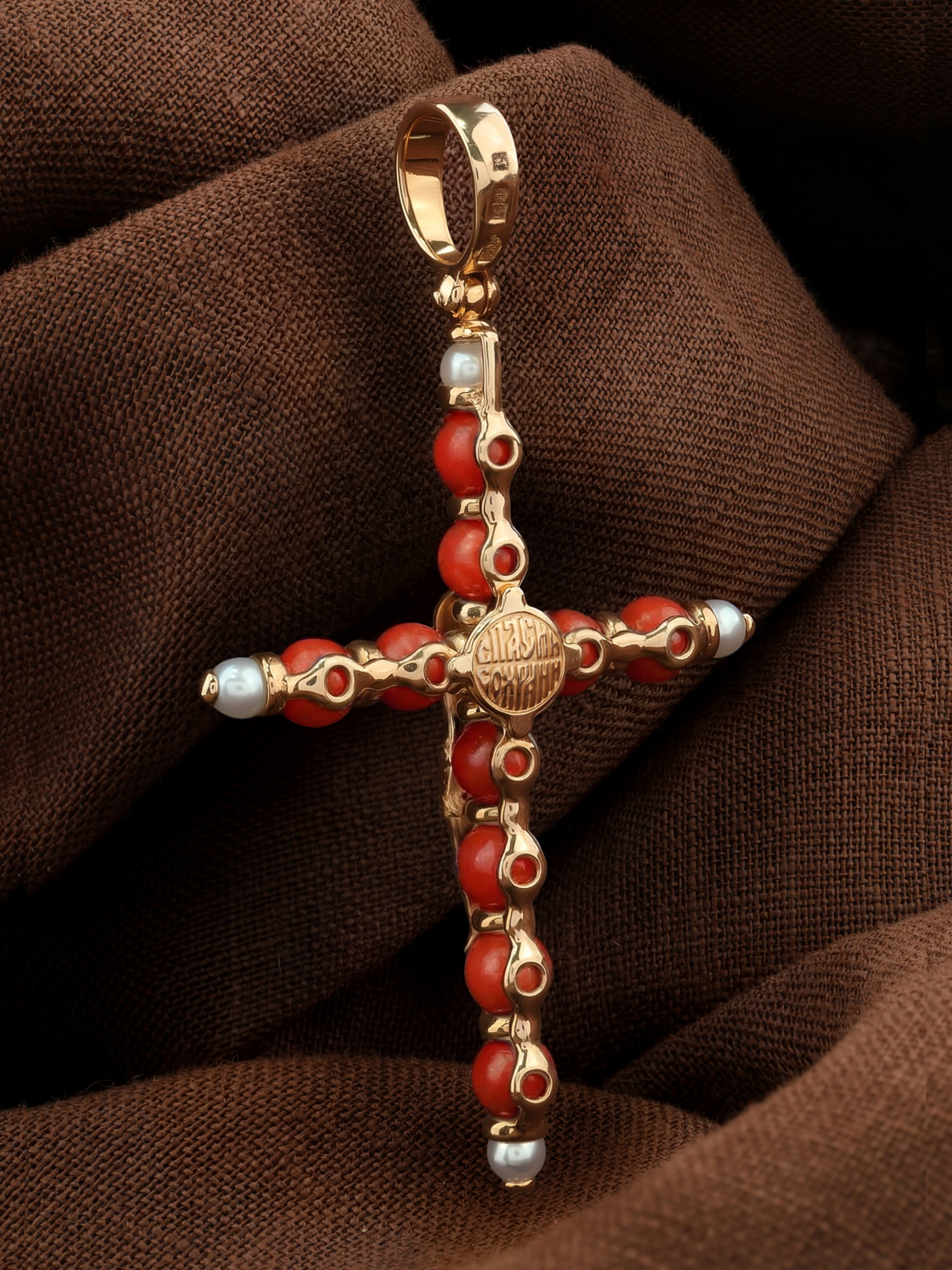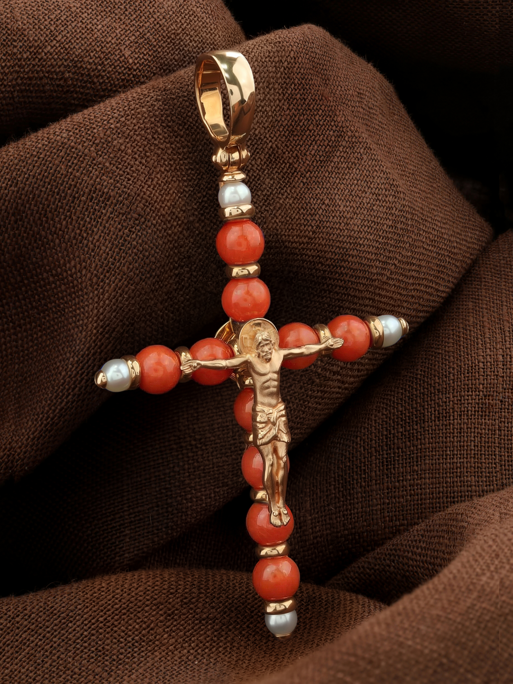 На лицевой стороне креста изображено Распятие Господа и Спасителя нашего Иисуса Христа. Своими крестными страданиями Господь смыл наши грехи, покрыл наш долг перед Богом или, на языке Писания, нас «искупил». В Голгофе сокрыта непостижимая тайна бесконечной правды и любви Бога. Крест стал символом победы добра над злом, жизни над смертью, напоминанием бесконечной Божьей любви, предметом радости. Воплотившийся Сын Божий Своею кровью освятил крест и сделал его проводником Своей благодати, источником освящения верующих. На верхней табличке, выше головы Иисуса, расположена надпись, составленная Понтием Пилатом — «IНЦI». Она означает «Иисус Назорей, Царь Иудейский». Надпись «IC» «ХC», означает Иисус Христос, помещаются на разных сторонах поперечной перекладины креста. Христос в Своей Божественной любви, над которой смерть не властна и которая, страдая, и не страдает в обычном смысле, простирает к людям со Креста Свои объятия, в которые призывается и привлекается весь мир. Поэтому Тело Его не висит, а торжественно покоится на Кресте.