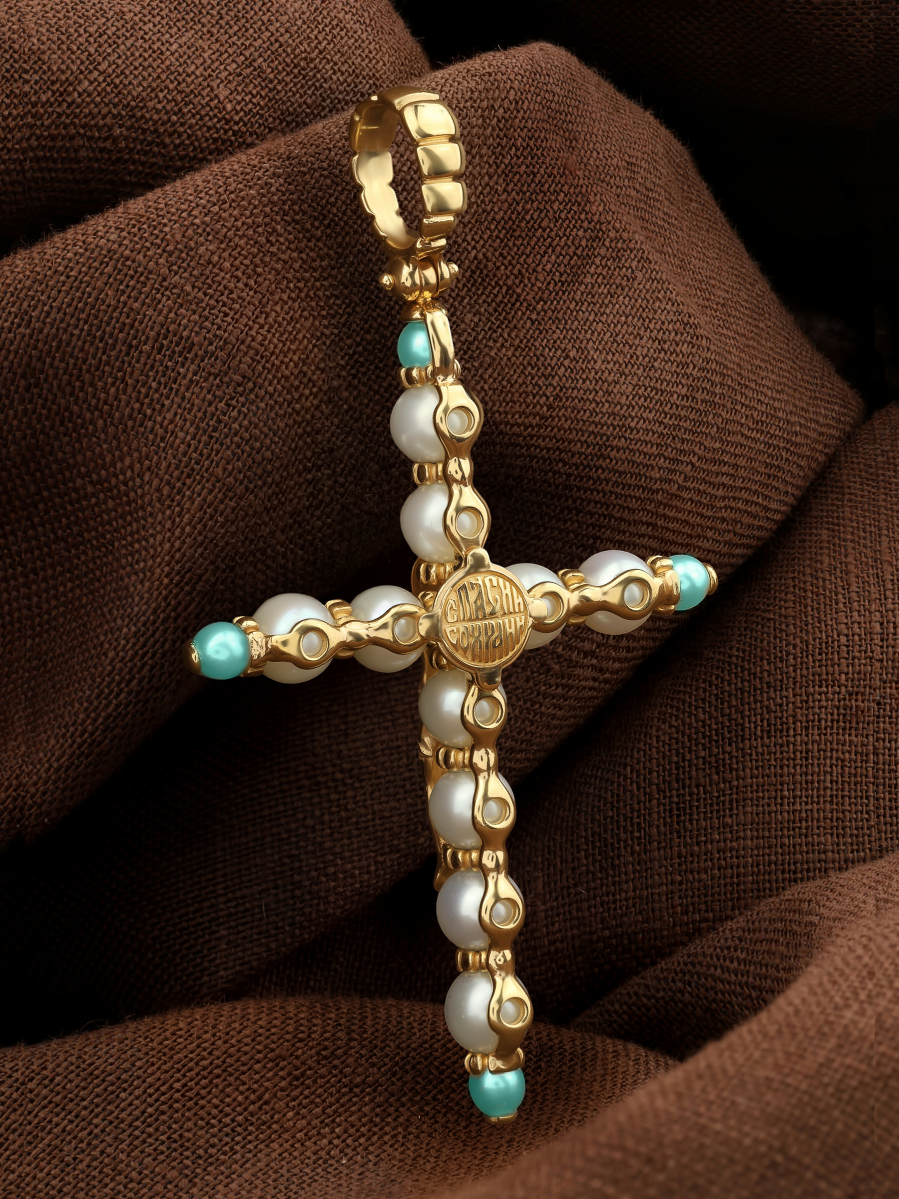 Крест из лимонного золота c жемчугом и бирюзой
