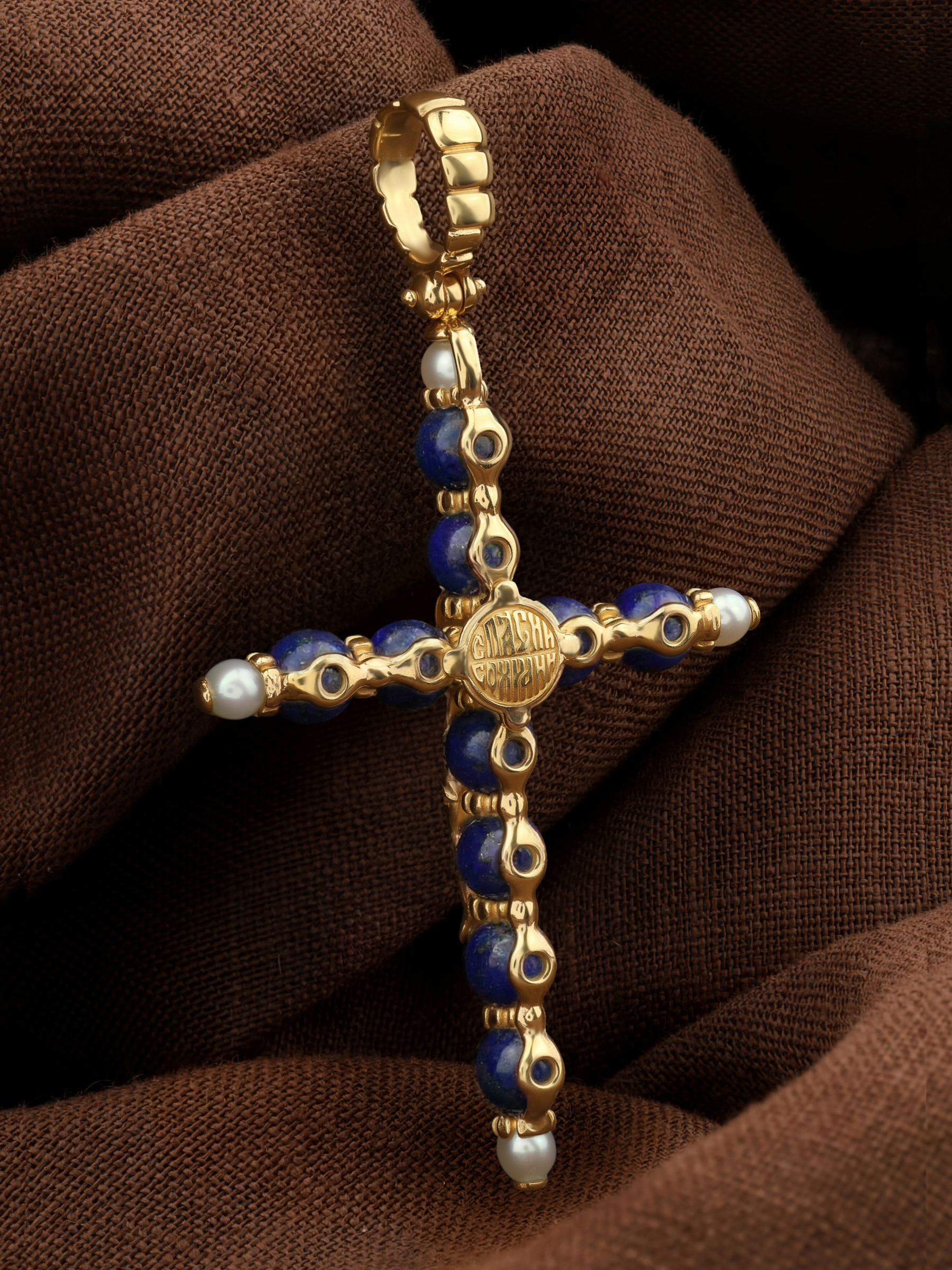 Крест из лимонного золота c жемчугом и лазуритом