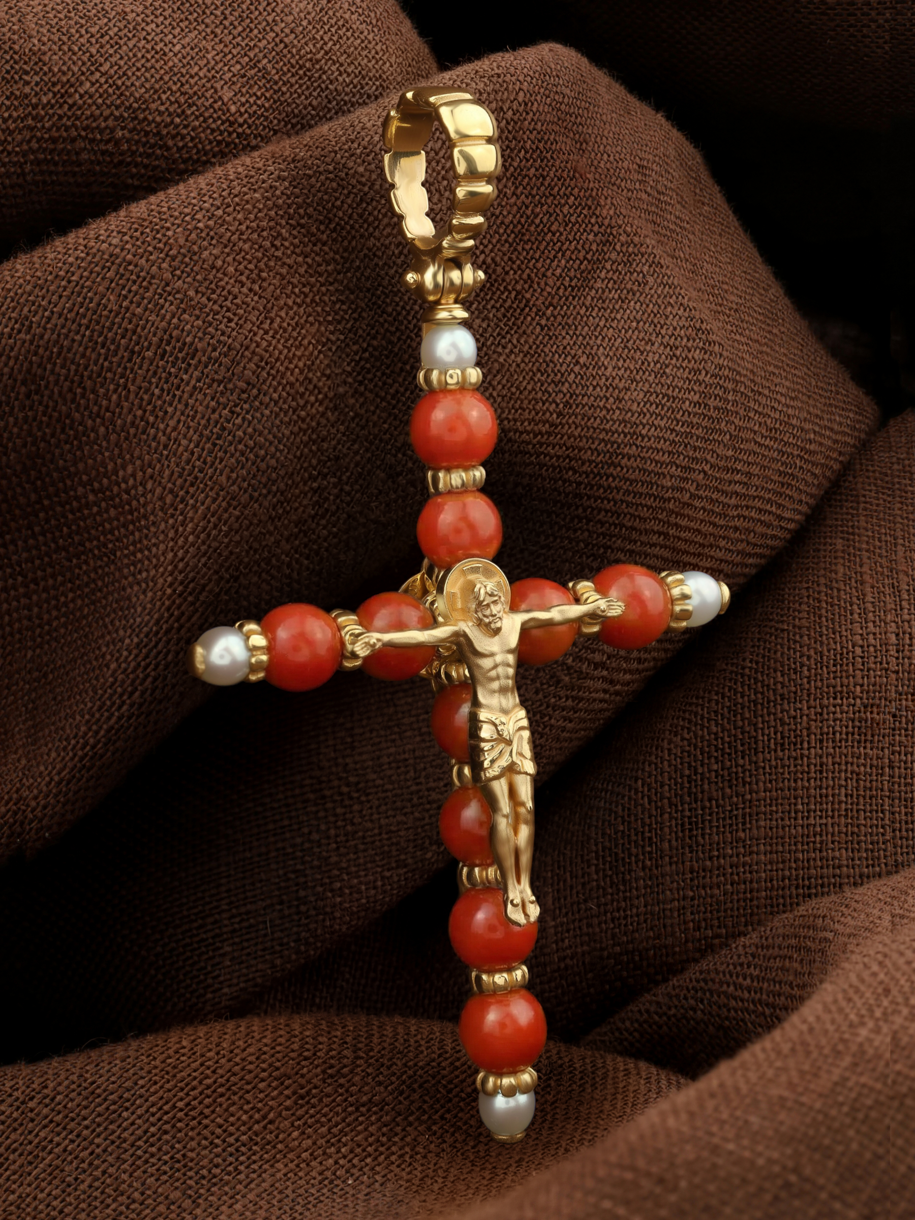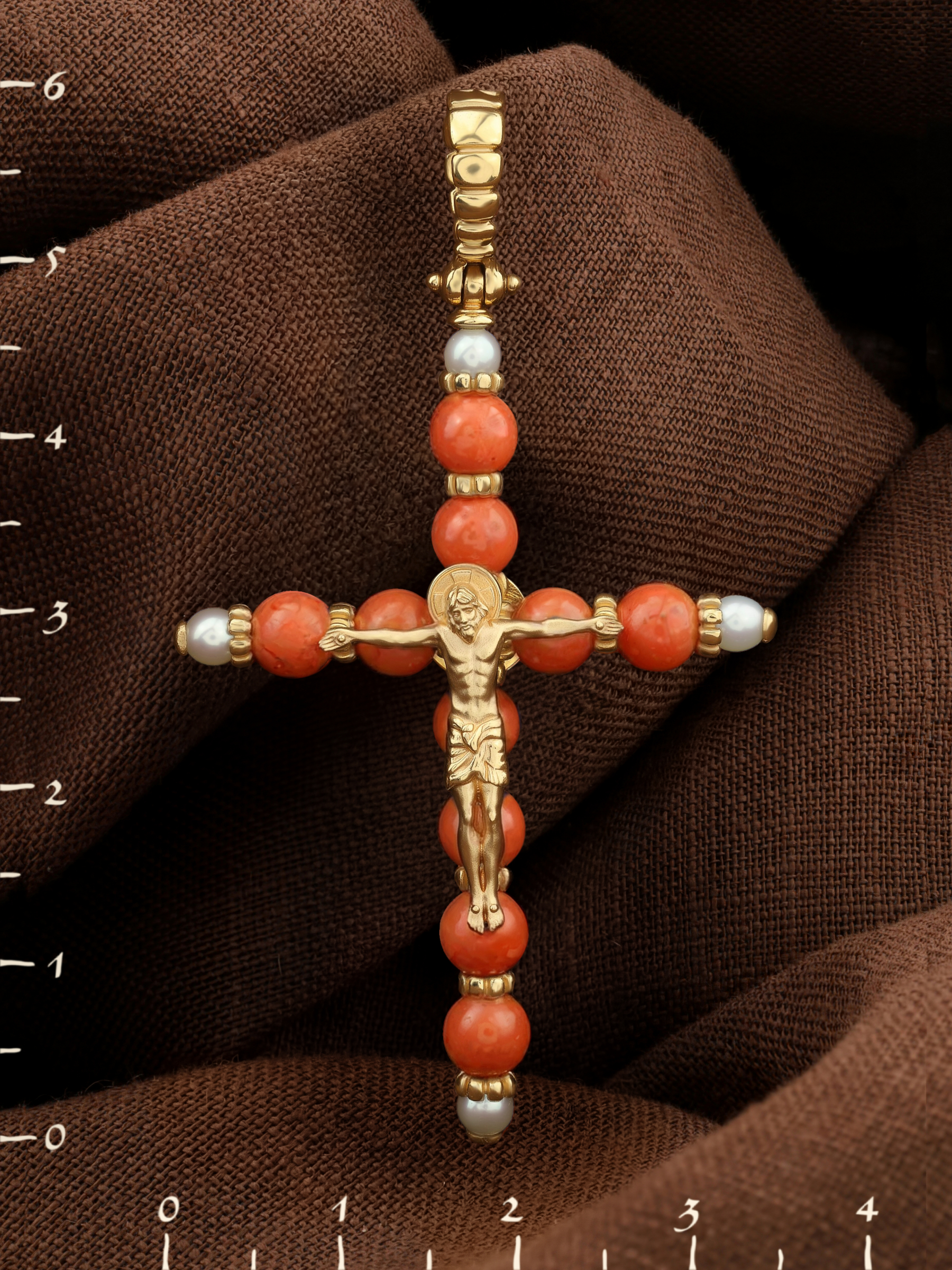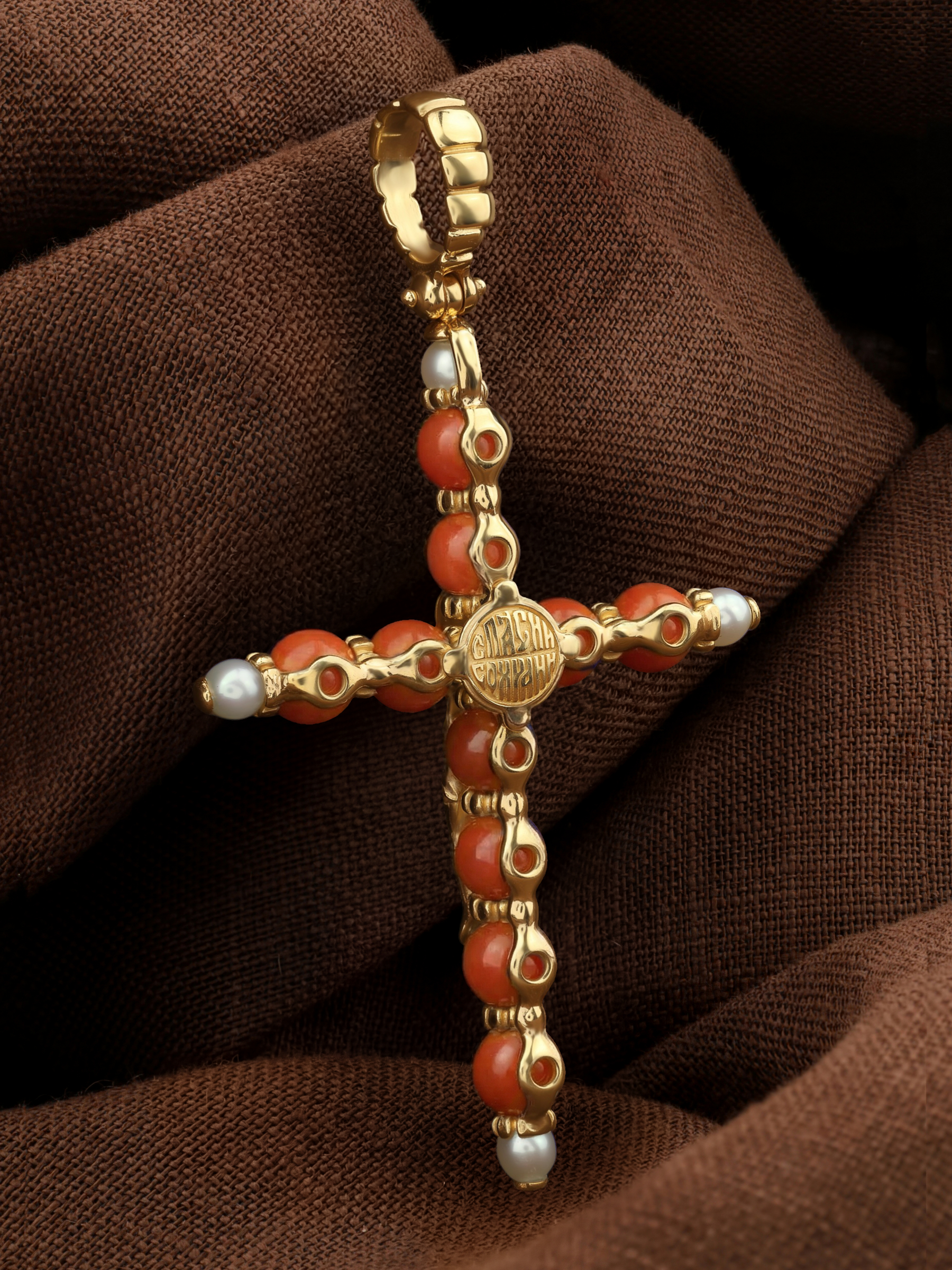 Крест из лимонного золота c жемчугом и кораллом