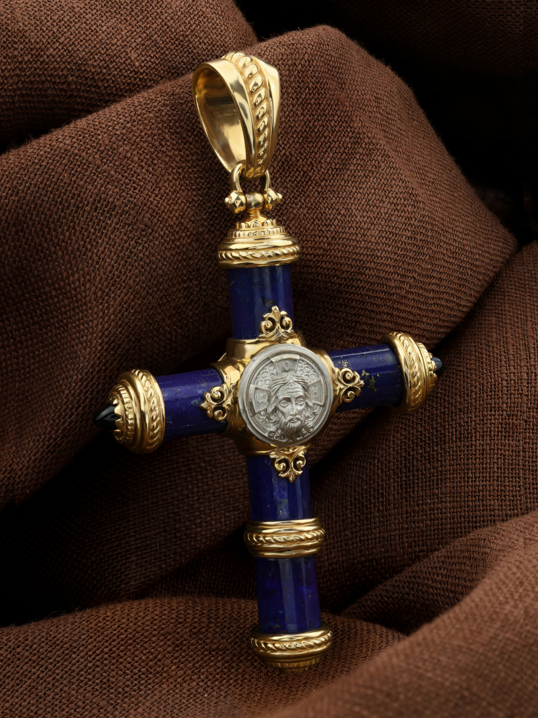 Крест из лимонного золота c ониксом и лазуритом