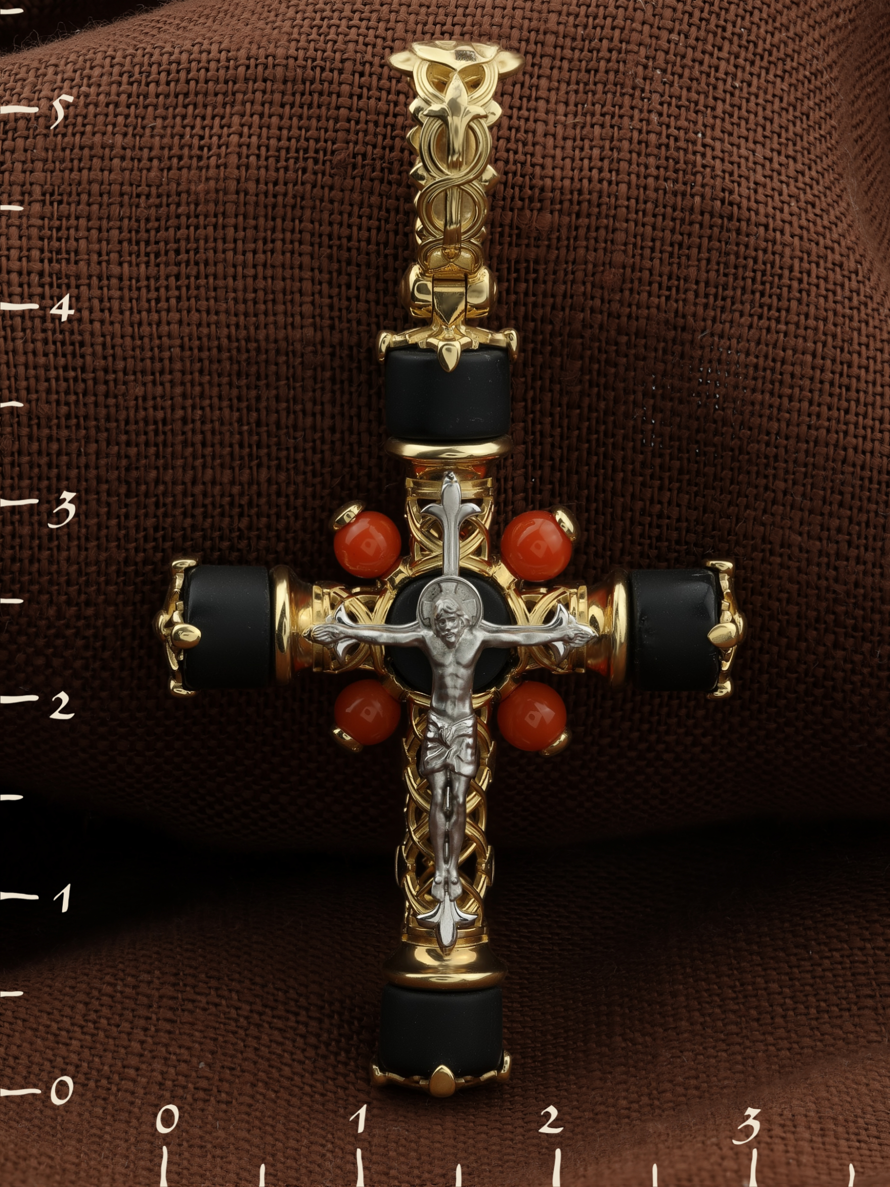 На лицевой стороне креста изображено Распятие Господа и Спасителя нашего Иисуса Христа. Своими крестными страданиями Господь смыл наши грехи, покрыл наш долг перед Богом или, на языке Писания, нас «искупил». В Голгофе сокрыта непостижимая тайна бесконечной правды и любви Бога. Крест стал символом победы добра над злом, жизни над смертью, напоминанием бесконечной Божьей любви, предметом радости. Воплотившийся Сын Божий Своею кровью освятил крест и сделал его проводником Своей благодати, источником освящения верующих. Господь сказал: кто хочет идти за Мною, отвергнись себя, и возьми крест свой, и следуй за Мною. (Мк. 8: 34). На православном кресте Христос не умирает, а свободно простирает руки, ладони Иисуса открыты, будто он хочет обнять все человечество, даря им свою любовь и открывая путь к вечной жизни.