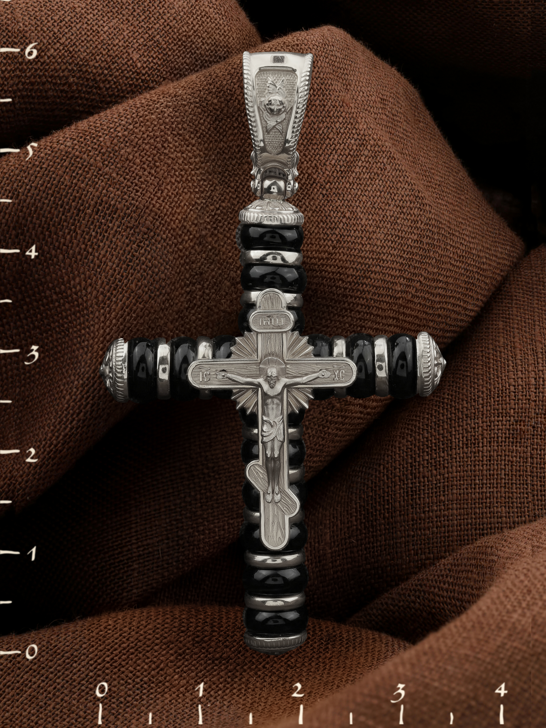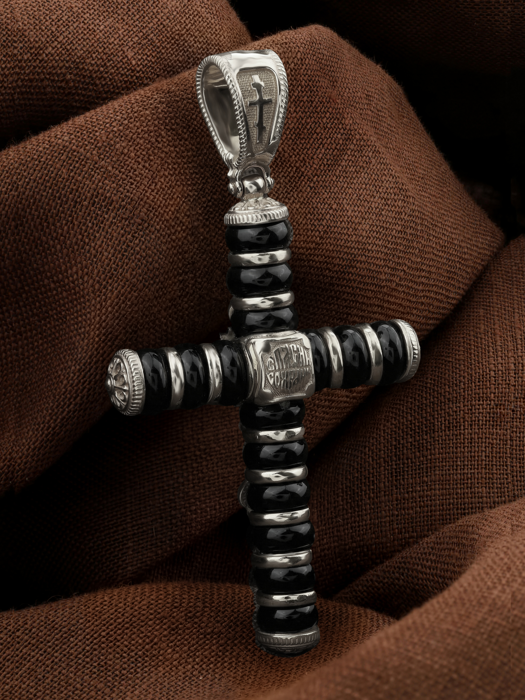 На лицевой стороне креста изображено Распятие Господа и Спасителя нашего Иисуса Христа. Своими крестными страданиями Господь смыл наши грехи, покрыл наш долг перед Богом или, на языке Писания, нас «искупил». В Голгофе сокрыта непостижимая тайна бесконечной правды и любви Бога. Крест стал символом победы добра над злом, жизни над смертью, напоминанием бесконечной Божьей любви, предметом радости. Воплотившийся Сын Божий Своею кровью освятил крест и сделал его проводником Своей благодати, источником освящения верующих. Господь сказал: кто хочет идти за Мною, отвергнись себя, и возьми крест свой, и следуй за Мною. (Мк. 8: 34). На верхней табличке, выше головы Иисуса, расположена надпись, составленная Понтием Пилатом — «IНЦI». Она означает «Иисус Назорей, Царь Иудейский». Надпись «IC» «ХC», означает Иисус Христос, помещается на разных сторонах поперечной перекладины креста. На православном кресте Христос не умирает, а свободно простирает руки, ладони Иисуса открыты, будто он хочет обнять все человечество, даря им свою любовь и открывая путь к вечной жизни. На кулонном кольце изображен шестикрылый Ангел Серафим.