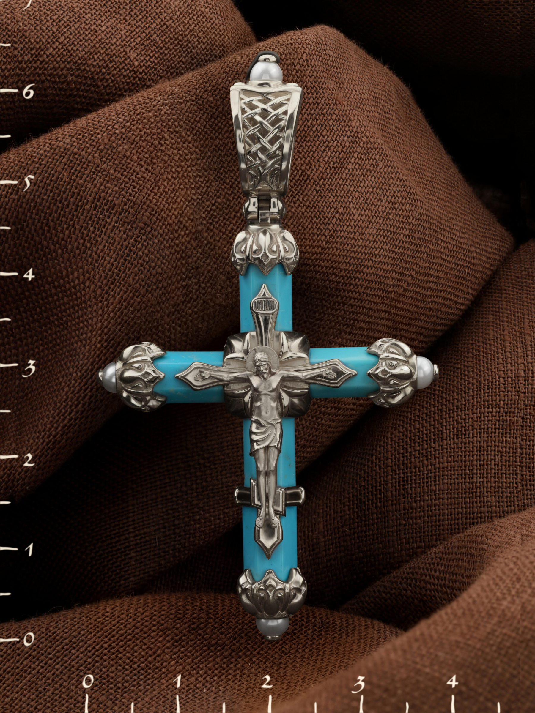 Крест из белого золота c жемчугом и бирюзой