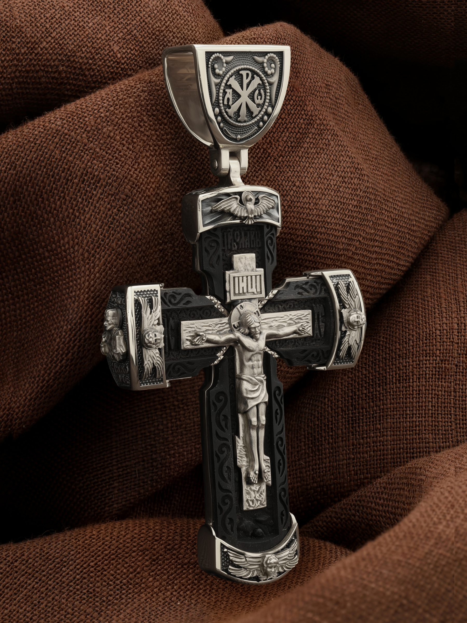 На лицевой стороне креста изображено Распятие, потому что это орудие казни Иисус Христос сделал орудием победы над грехом и смертью. Своими страданиями Он искупил грехи человечества, умерев и сошествовав во ад, победил сатану, освободил души праведников от вечной смерти и открыл им небесные врата рая. Жертва Христа сделала возможным спасение для каждого человека. На православном кресте Христос не умирает, а свободно простирает руки, ладони Иисуса открыты, будто он хочет обнять все человечество, даря им свою любовь и открывая путь к вечной жизни.