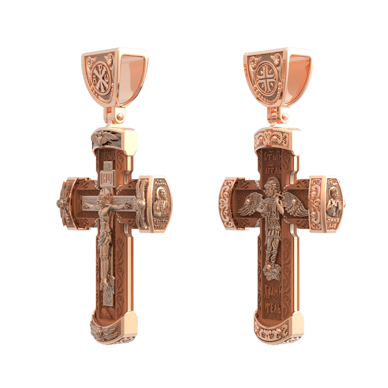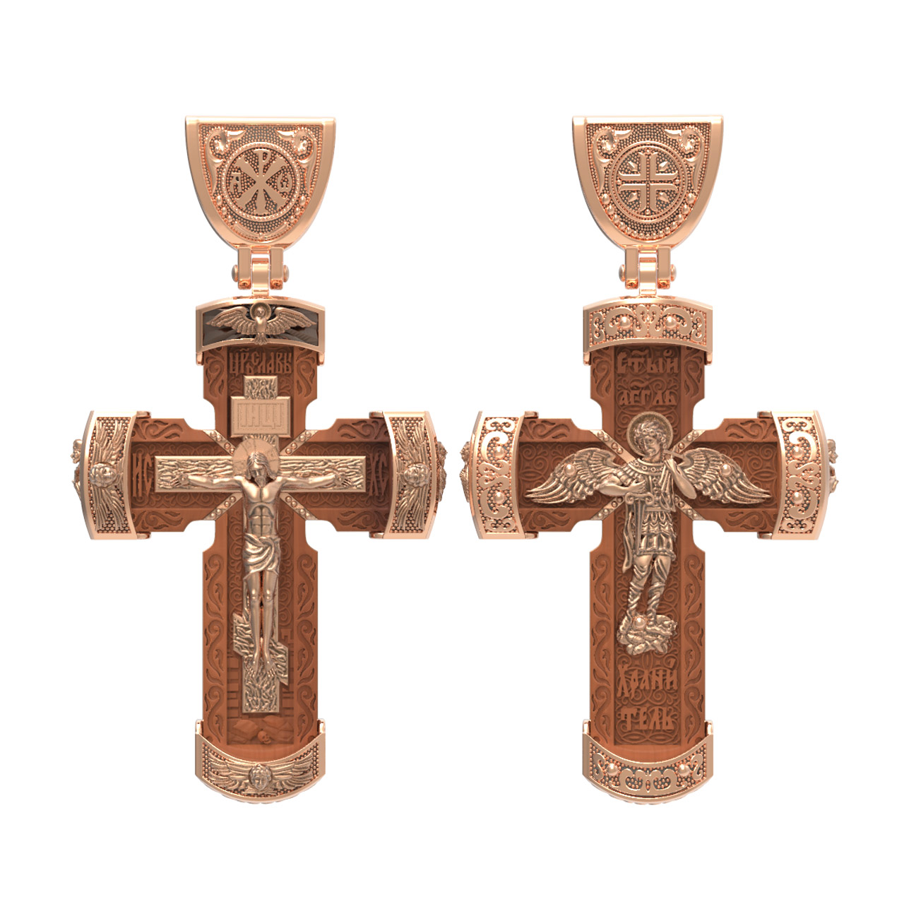 В центре оборота креста изображен Ангела Хранителя с традиционными атрибутами в руках: крестом, которым он осеняет человека, и мечом для прогнания бесов. По Православному учению, каждому, принявшему святое крещение, дается Господом Ангел Хранитель, который сопровождает человека всю его жизнь, помогая в добрых делах и охраняя от нападок злых духов. Святые отцы утверждают, что только верующий человек имеет рядом с собой Ангела Хранителя: «Тем, которые сподобились крещения и возносятся на высоту добродетелей, даны от Бога Ангелы, заботящиеся о них и содействующие им. В этом уверяет нас Господь, когда говорит, что есть Ангелы Хранители у всякого, кто верует в Него» (преп. Анастасий Синаит). Но Ангел Хранитель пребывает с христианином, если только мы не прогоним его греховными делами, поскольку «как дым разгоняет пчел, так и грех прогоняет от нас Ангела Хранителя» (свт. Василий Великий). Но и после завершения земного пути Ангел Хранитель не покидает христианина, а помогает душе преодолеть воздушные мытарства на пути в Царство Небесное.