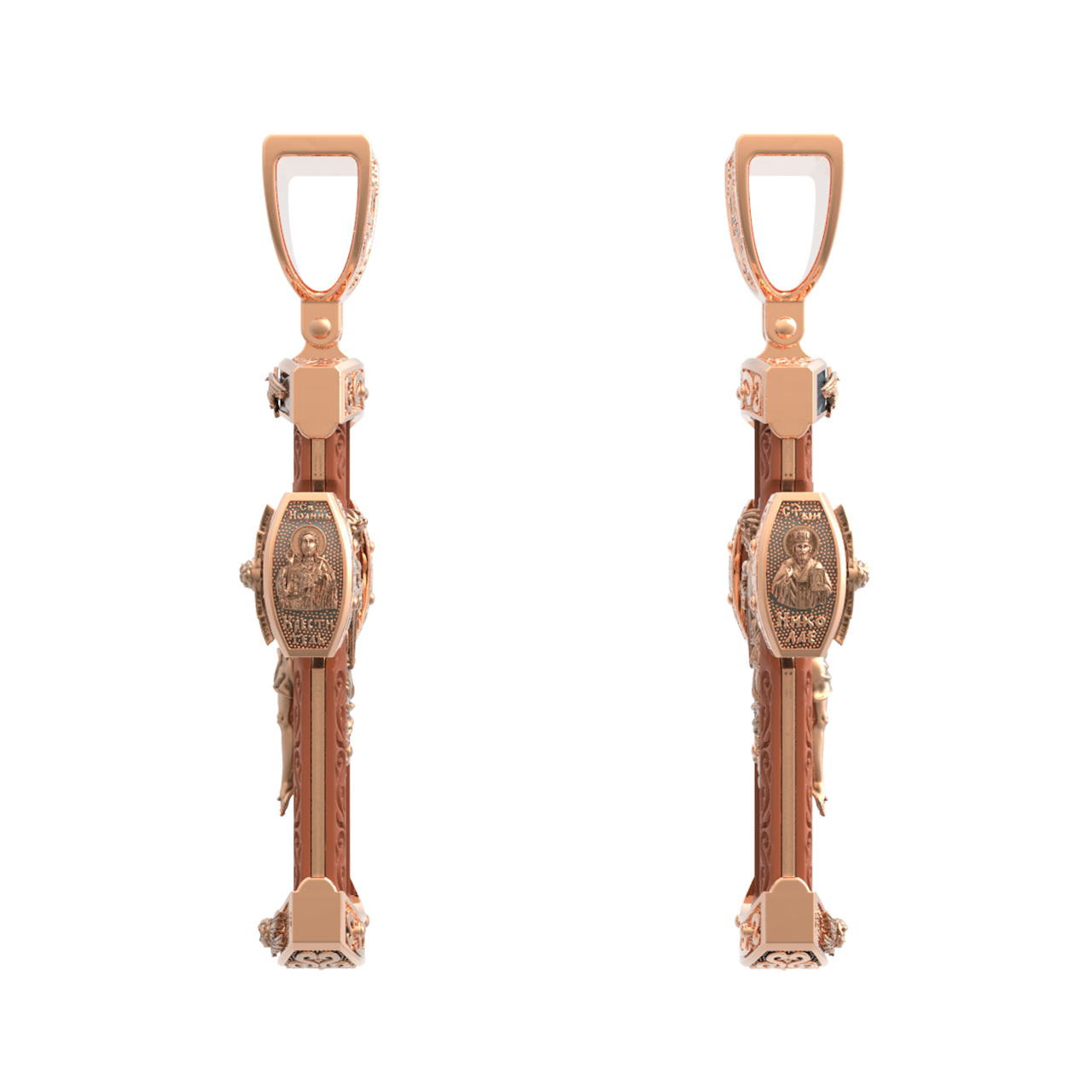 На торце изделия с левой стороны помещена икона Святого Николая Чудотворца — самый почитаемый в Православной Церкви, которого еще называют Николай Угодник за то, что он угодил своей жизнью Богу. Николай Чудотворец, помощник в делах, покровитель учащихся, утешитель обиженных и нуждающихся, целитель самых страшных и тяжелых недугов, предстатель и молитвенник за людей перед Богом. Также Святитель Николай Чудотворец известен своими молитвами за путешественников, когда непрестанный ветер и бушующие волны утихают и корабль заходит в спокойную гавань. На торце изделия с правой стороны — икона Святого Иоанна Крестителя. Святой Иоанн был последним пророком Израиля. Он призывал к покаянию, предвозвещая приближение Царствия Небесного (Мф. 3, 2), и удостоился стать Крестителем Христа. Иисус Христос говорит о нем: «Сей есть о котором написано: «Вот, Я посылаю Ангела Моего пред лицем Твоим, который приготовит путь Твой пред Тобою» (Лк. 7, 27). И еще: «Из рожденных женами нет ни одного пророка больше Иоанна Крестителя» (Лк. 7, 28).