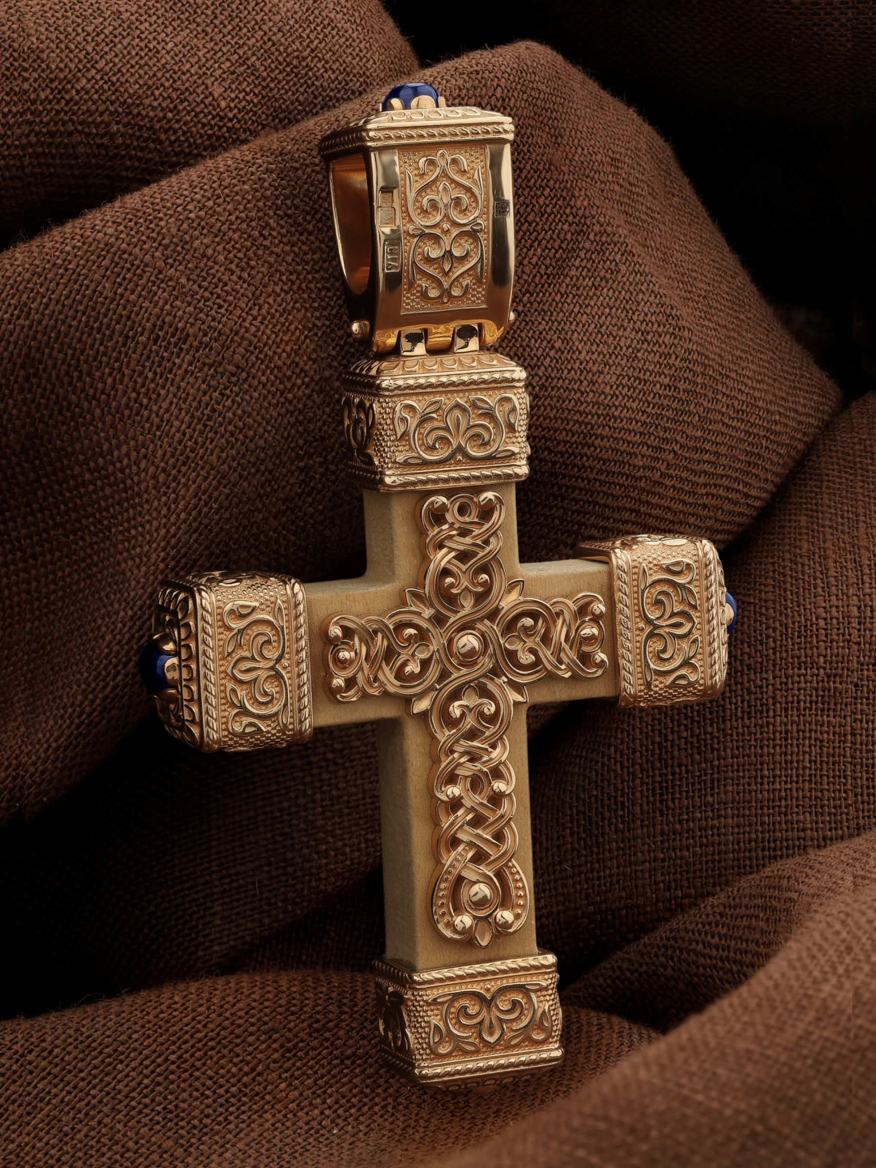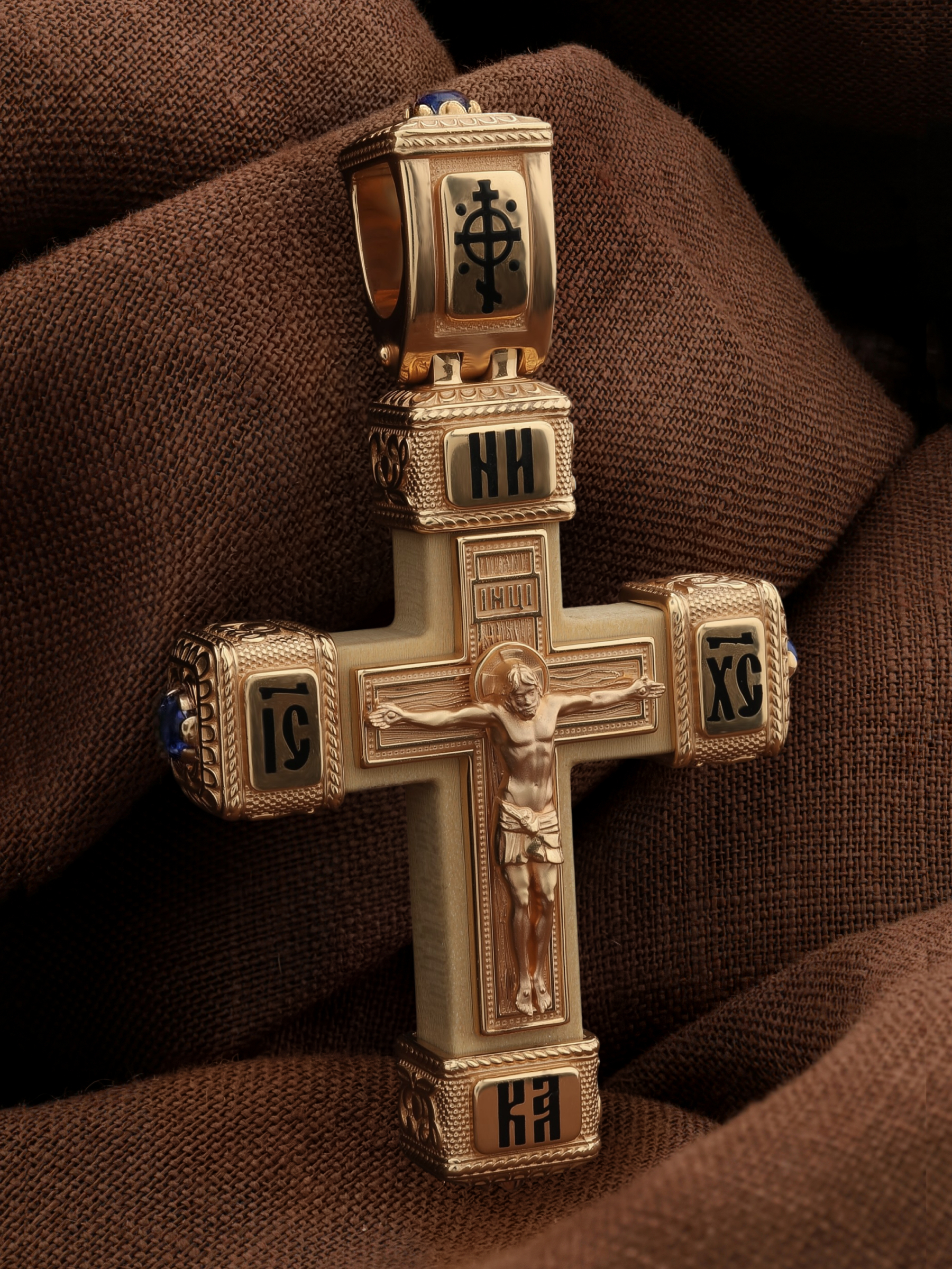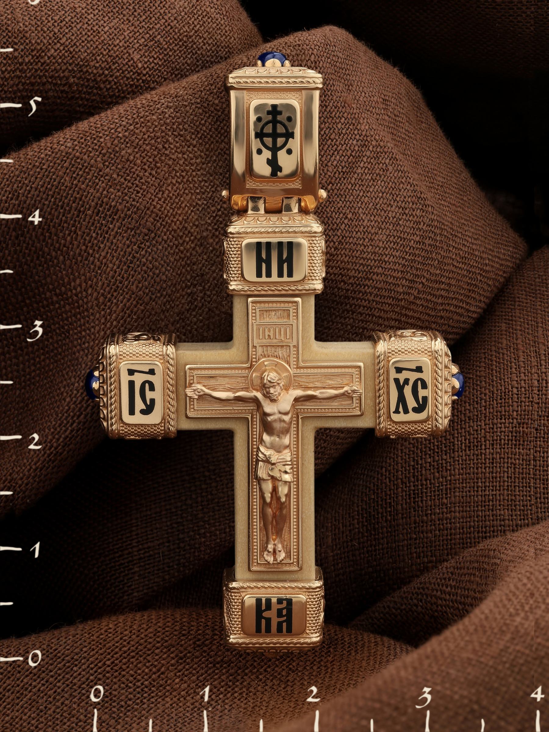 На лицевой стороне креста изображено Распятие Господа и Спасителя нашего Иисуса Христа. Крест- символ спасения и искупления рода человеческого, знамение победы над смертью и адом. Иисус Христос, как искупительная жертва освобождения человечества от власти греха, умер крестной смертью и в третий день воскрес. На верхней табличке, выше головы Иисуса, расположена надпись, составленная Понтием Пилатом — «ИНЦИ». Она означает «Иисус Назорей, Царь Иудейский». Надпись «IС ХС» означает Иисус Христос помещается на разных сторонах поперечной перекладины креста. Надпись –«НИКА» означает победитель. На кулонном кольце помещен крест «терновый венец». Этот крест имеет форму восьмиконечного креста, вторая перекладина которого в центре обведена кругом с остриями по краю, символизирующими терновый венец. «Воины, сплетши венец из терна, возложили ему на голову, — говорится в Евангелии, — и ранами Его мы исцелились» (Ис. 53, 5). Вот почему терновый венок стал для христиан символом победы и награды, «венцом правды» (2 Тим. 4, 8), «венцом славы» (1 Пет. 5, 4), «венцом жизни» (Иак. 1, 12;.Апок. 2, 10).