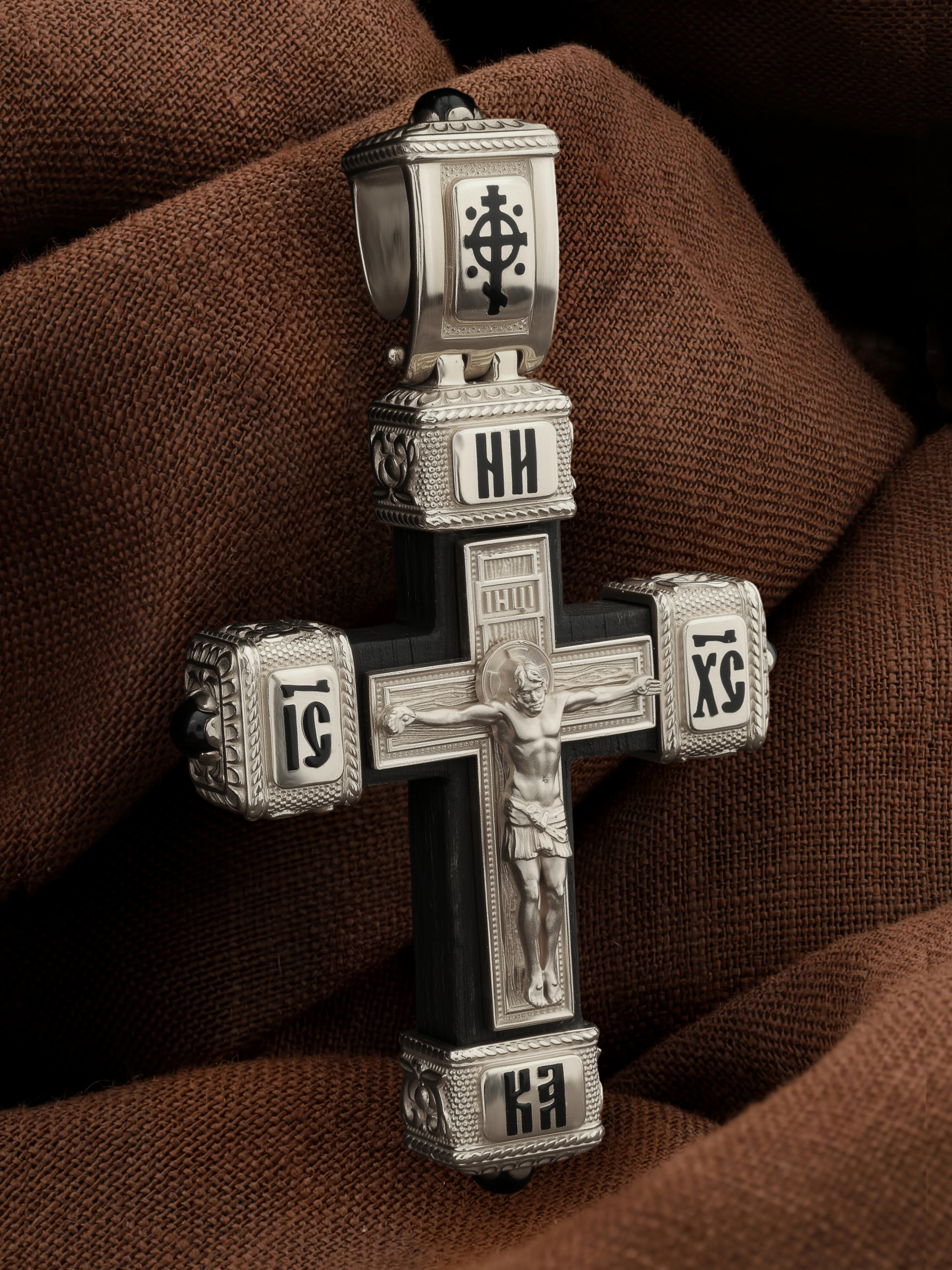 Крест из белого золота c эмалью, ониксом и эбеновым деревом