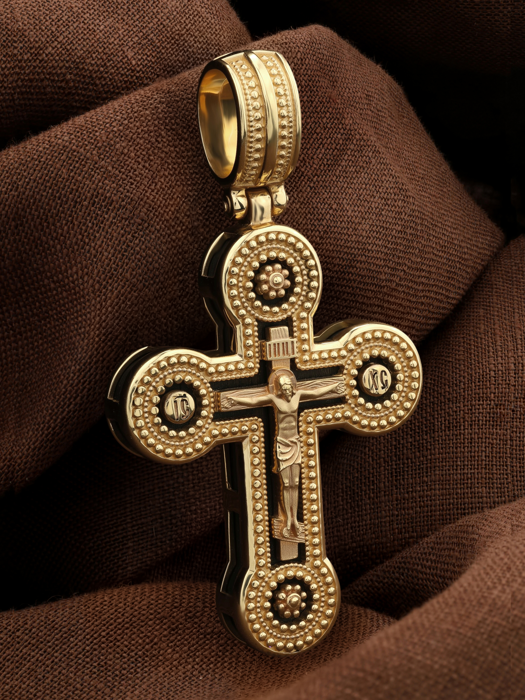На лицевой стороне креста изображено Распятие Господа и Спасителя нашего Иисуса Христа. Своими крестными страданиями Господь смыл наши грехи, покрыл наш долг перед Богом или, на языке Писания, нас «искупил». В Голгофе сокрыта непостижимая тайна бесконечной правды и любви Бога. Крест стал символом победы добра над злом, жизни над смертью, напоминанием бесконечной Божьей любви, предметом радости. Воплотившийся Сын Божий Своею кровью освятил крест и сделал его проводником Своей благодати, источником освящения верующих. На верхней табличке, выше головы Иисуса, расположена надпись, составленная Понтием Пилатом — «IНЦI». Она означает «Иисус Назорей, Царь Иудейский». Надпись «IC» «ХC», означает Иисус Христос, помещаются на разных сторонах поперечной перекладины креста. Христос в Своей Божественной любви, над которой смерть не властна и которая, страдая, и не страдает в обычном смысле, простирает к людям со Креста Свои объятия, в которые призывается и привлекается весь мир. Поэтому Тело Его не висит, а торжественно покоится на Кресте