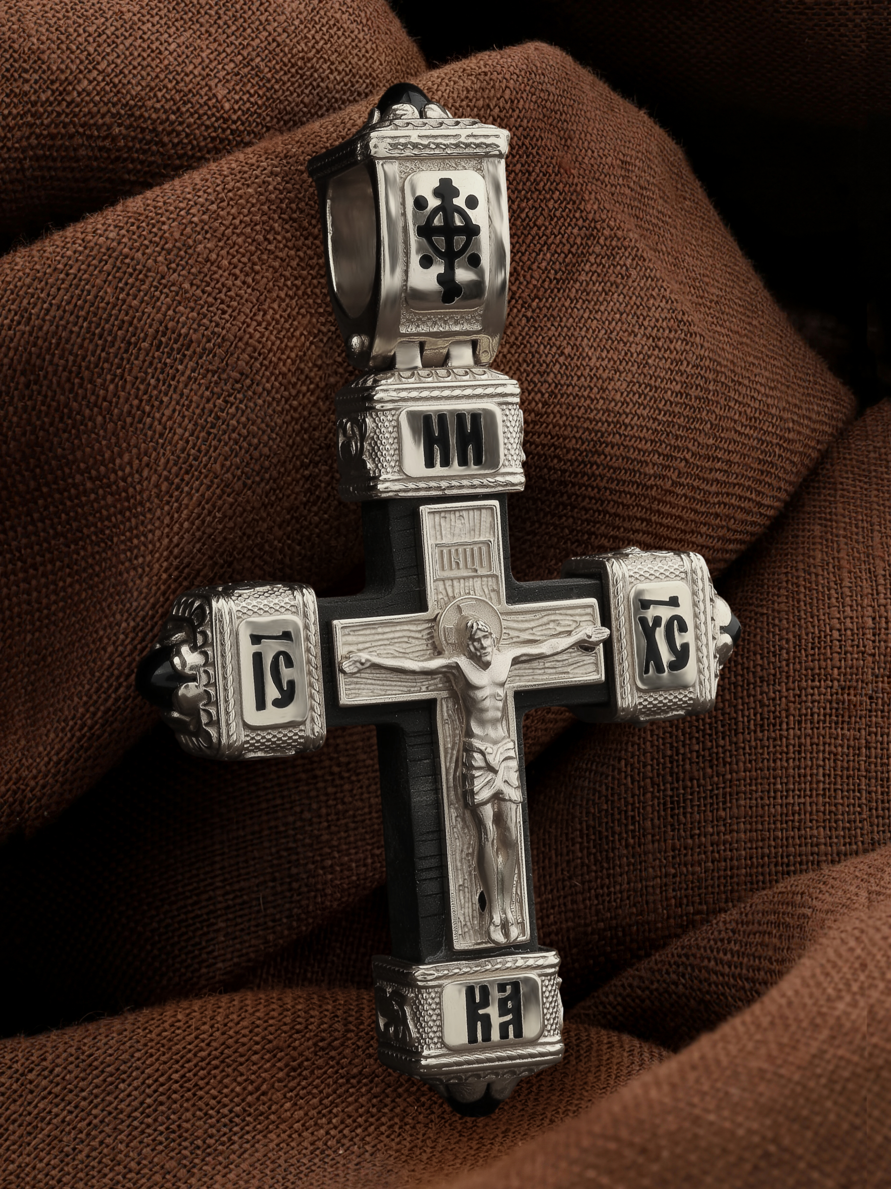 Крест из белого золота c эмалью, ониксом и эбеновым деревом