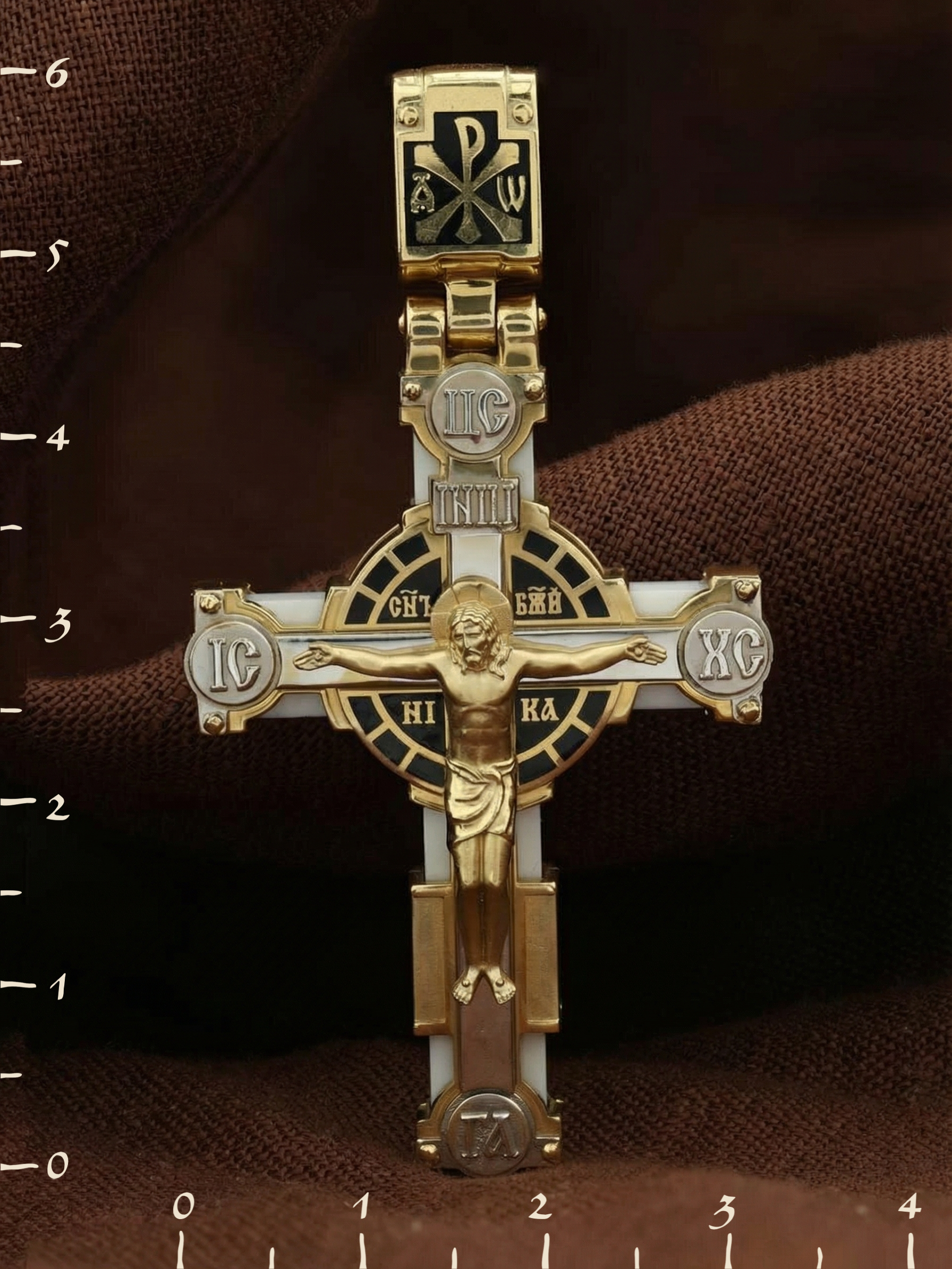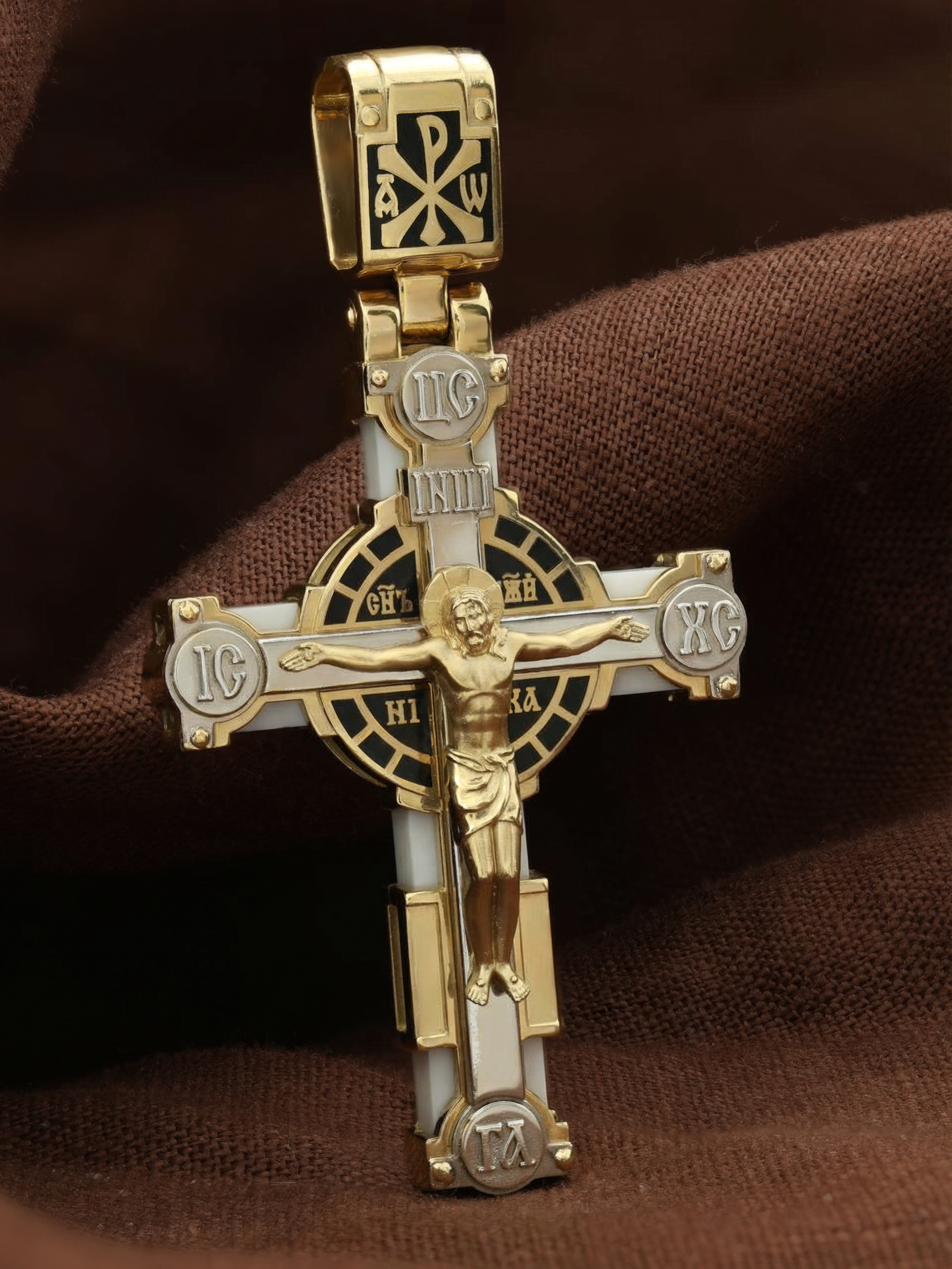 На лицевой стороне креста изображено Распятие Господа и Спасителя нашего Иисуса Христа. Христос, подвергнутый на кресте мучительной казни, своими страданиями искупил нас от древнего греха и даровал нам жизнь вечную. Без Распятия не было бы Воскресения Христова, и поэтому Крест из орудия казни обратился в святыню, в которой действует Благодать Божия. В Голгофе сокрыта непостижимая тайна бесконечной правды и любви Бога. Крест стал символом победы добра над злом, жизни над смертью, напоминанием бесконечной Божьей любви, предметом радости. Воплотившийся Сын Божий Своею кровью освятил крест и сделал его проводником Своей благодати, источником освящения верующих. Через крестную жертву Бог раскрывает нам Свою безмерную любовь и призывает к ответной любви. Над вершиной Распятия помещена надпись «Царь Славы». На верхней табличке, выше головы Иисуса, расположена надпись, составленная Понтием Пилатом — «IНЦI». Она означает «Иисус Назорей, Царь Иудейский». Надпись «IС ХС» означает Иисус Христос помещается на разных сторонах поперечной перекладины креста. Рядом помещены словосочетание «СЫН БОЖИЙ», что означает божественную природу Иисуса Христа и надпись –«НИКА», что означает победитель. Надпись «Г.А.» — голова Адама, грехи которого Христос омыл Своею Кровью, размещена под подножием креста. На православном кресте Христос не умирает, а свободно простирает руки, ладони Иисуса открыты, будто он хочет обнять все человечество, даря им свою любовь и открывая путь к вечной жизни. На кулонном кольце помещен крест Константина — монограмма, известная как «Хи-Ро» («хи» и «ро» — первые две буквы имени Христа по-гречески). Монограмма стала первым общепринятым символом христианства — как знак победы и спасения.