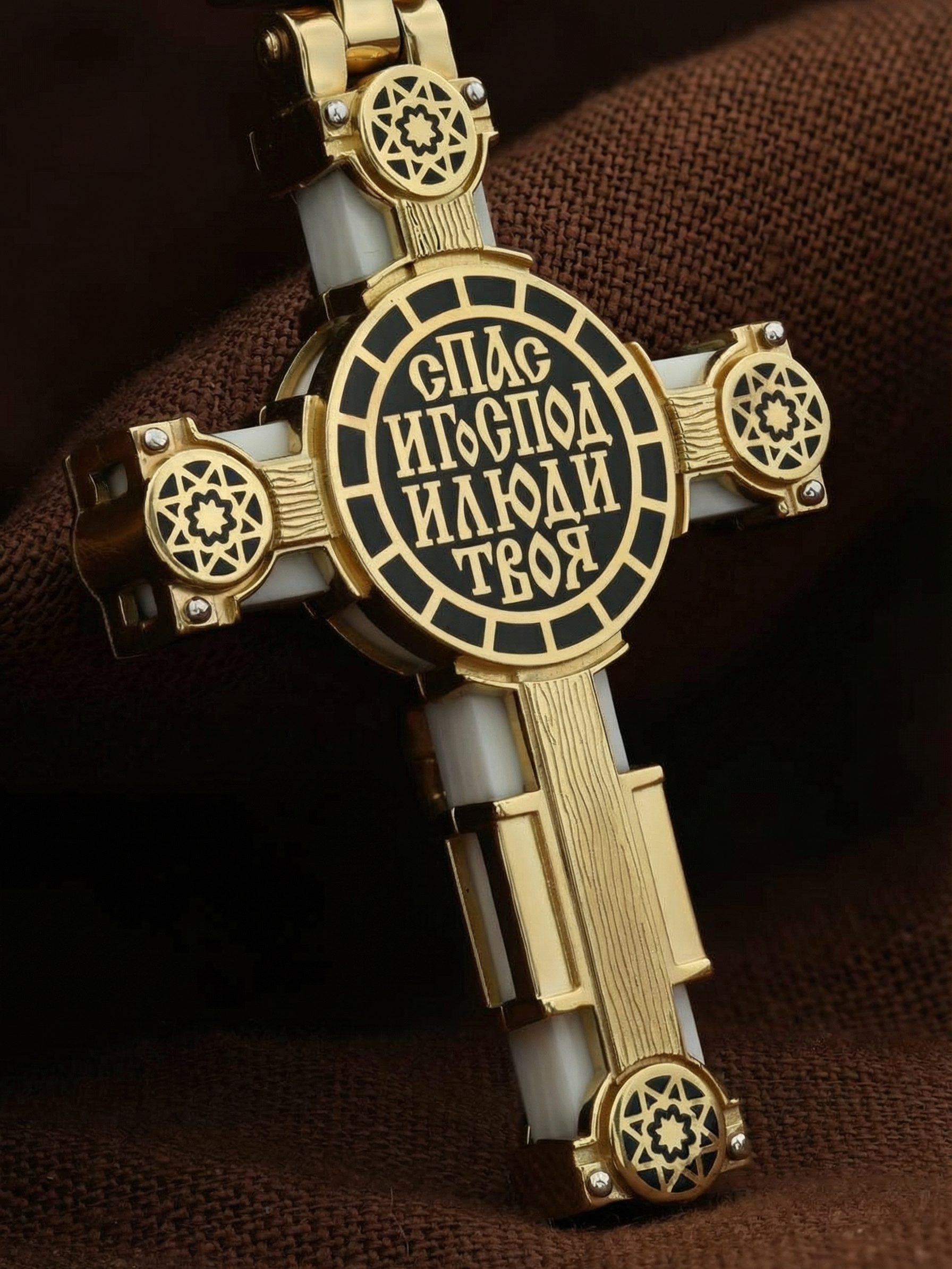На оборотной стороне креста написан начальный стих молитвы Животворящему Кресту Господню: «Спаси, Господи, люди Твоя…»