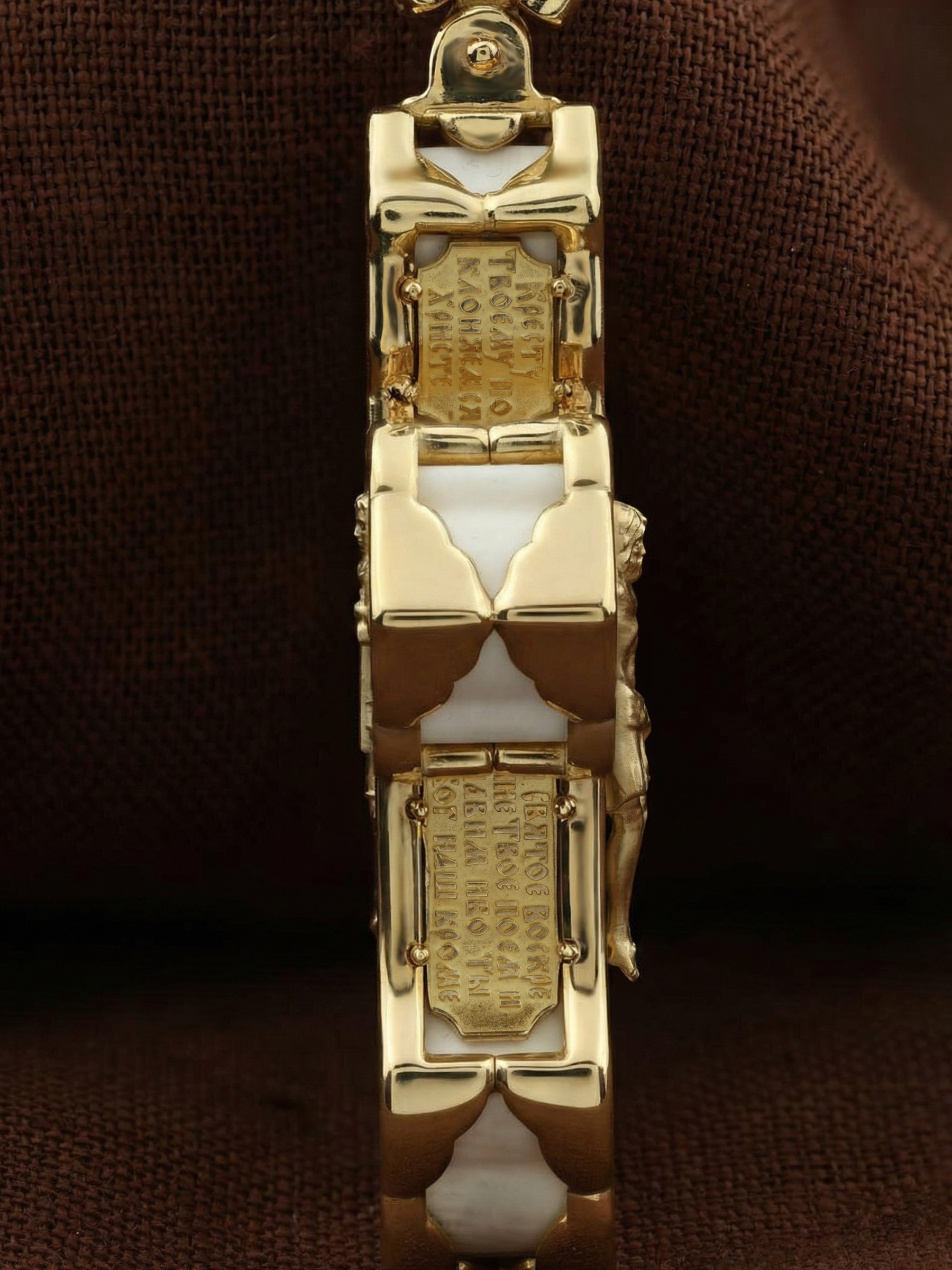 В центре оборотной стороне креста изображен Святой Агнгел-Хранитель в виде юноши держащего в правой руке крест, а в левой — мечь. Агнгел-Хранитель — это Ангел приставляемый Богом к человеку при крещении для охраны и помощи в добрых делах. Он невидимо находится при человеке на протяжении всей его жизни, если человек сохраняет в себе любовь к Богу и истинную веру перед Ним. По сторонам от изображения помещена молитва: «Ангеле Божий, хранителю мой святый, на соблюдение мне от Бога с небесе данный! Прилежно молю тя: ты мя днесь просвети, и от всякаго зла сохрани, ко благому деянию настави…». На кулонном кольце изображена икона Божией Матери «Покров Пресвятой Богородицы».