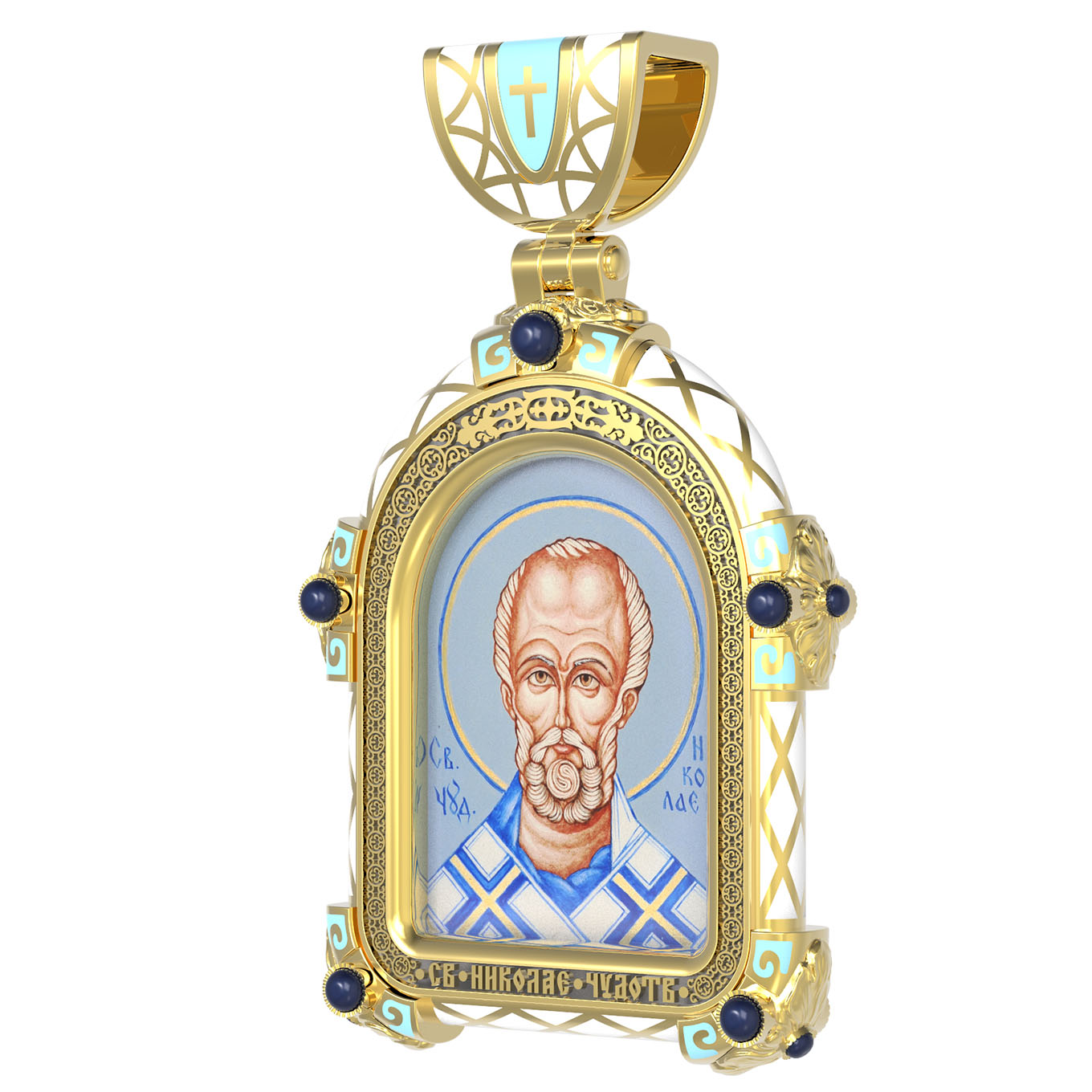 На лицевой стороне образка изображен Святитель Николай архиепископ Мир Ликийских, Чудотворец. Он является одним из самых известных на Руси святых, издревле считающийся помощником и молитвенником за всех, притекающих к нему. Чудес его исчислить невозможно. Николай Чудотворец подавал многим исцеления в болезнях и телесных недугах, обогащал бедствующих в крайней нищете, подавал голодным пищу, спасал от потопления, освобождал из плена и избавлял от смерти.