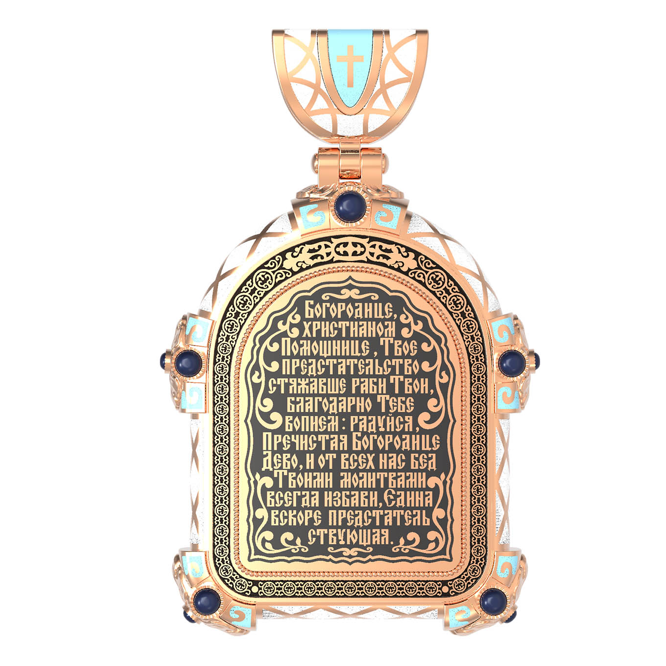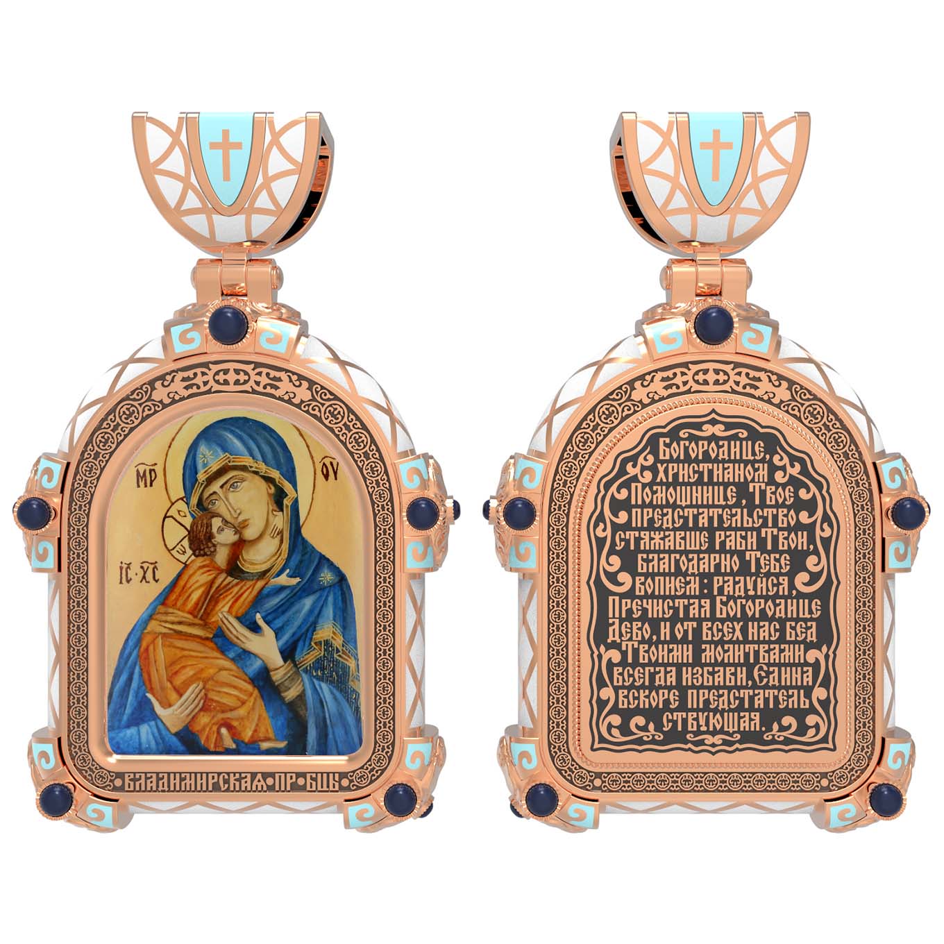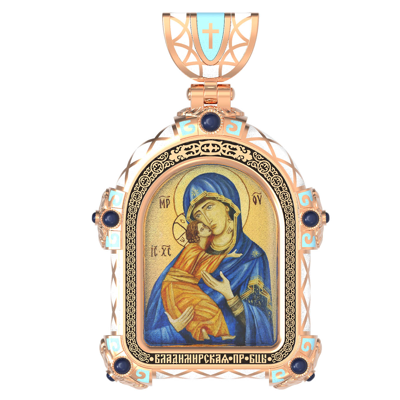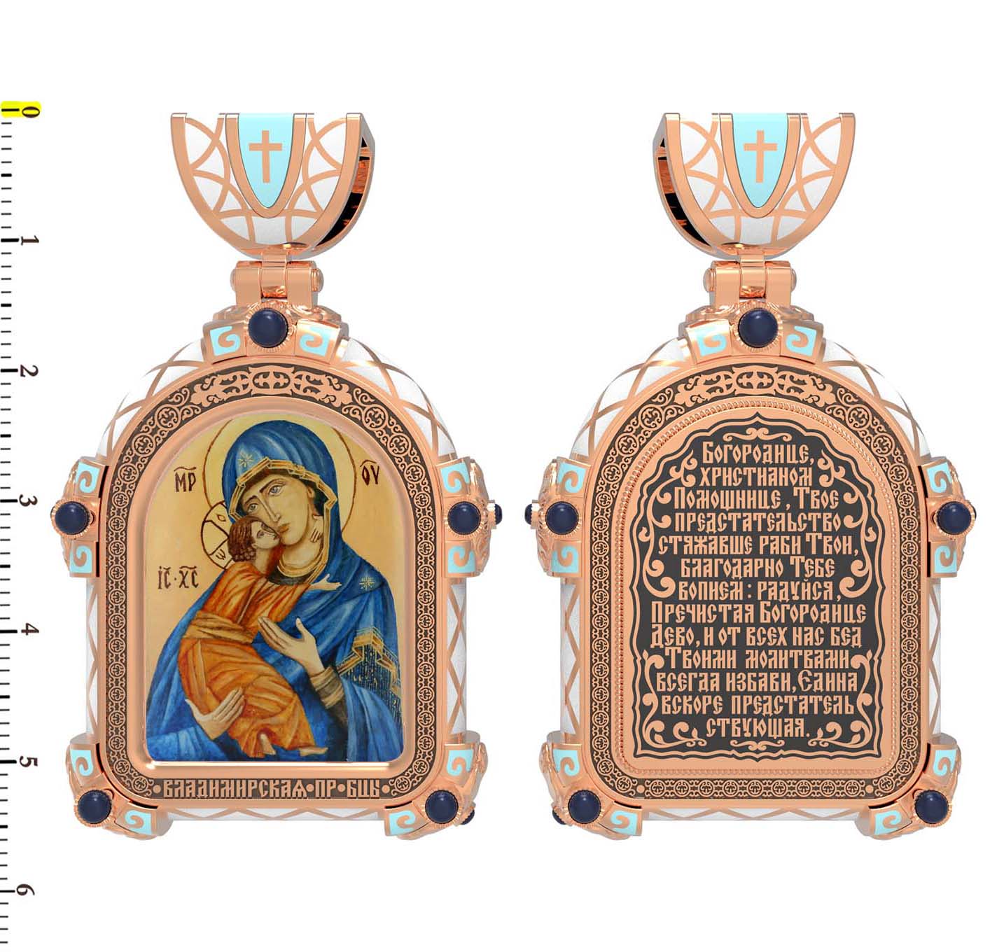На лицевой стороне образка изображена Владимирская икона Божией Матери — одна из самых чтимых святынь Русской православной церкви. По преданию, икона была написана Святым апостолом и евангелистом Лукой во время земной жизни Богородицы. Дева Мария, увидев Свое изображение, молвила: «Отныне ублажат Мя вси роди. Благодать Рождшегося от Меня и Моя с сим образом да будет». Образ написан в лирическом иконографическом типе «Умиление». Младенец припал щекой к щеке Матери и тянется к ней правой рукой, другой нежно обнимая за шею. Икона вплоть до V века находилась в Иерусалиме, затем была перевезена в Византию. На Русь икона была привезена в 1131 г. За прошедшие столетия святыня неоднократно переезжала из Владимира в Москву и обратно, не раз спасая страну от захватчиков. Русская Православная Церковь установила троекратное празднование Владимирской иконе Божьей Матери. Каждый из дней празднования связан с избавлением русского народа от порабощения иноплеменниками по молитвам ко Пресвятой Богородице. В последующие века у иконы происходили многие важные исторические события: подписание актов, принятие присяги значимых государственных деятелей и возведение на престол. На кулонном кольце изображен Спас Нерукотворный — образ Господа и Спасителя нашего Иисуса Христа, чудесно отпечатавшийся на плате, котором Христос вытер свой лик.