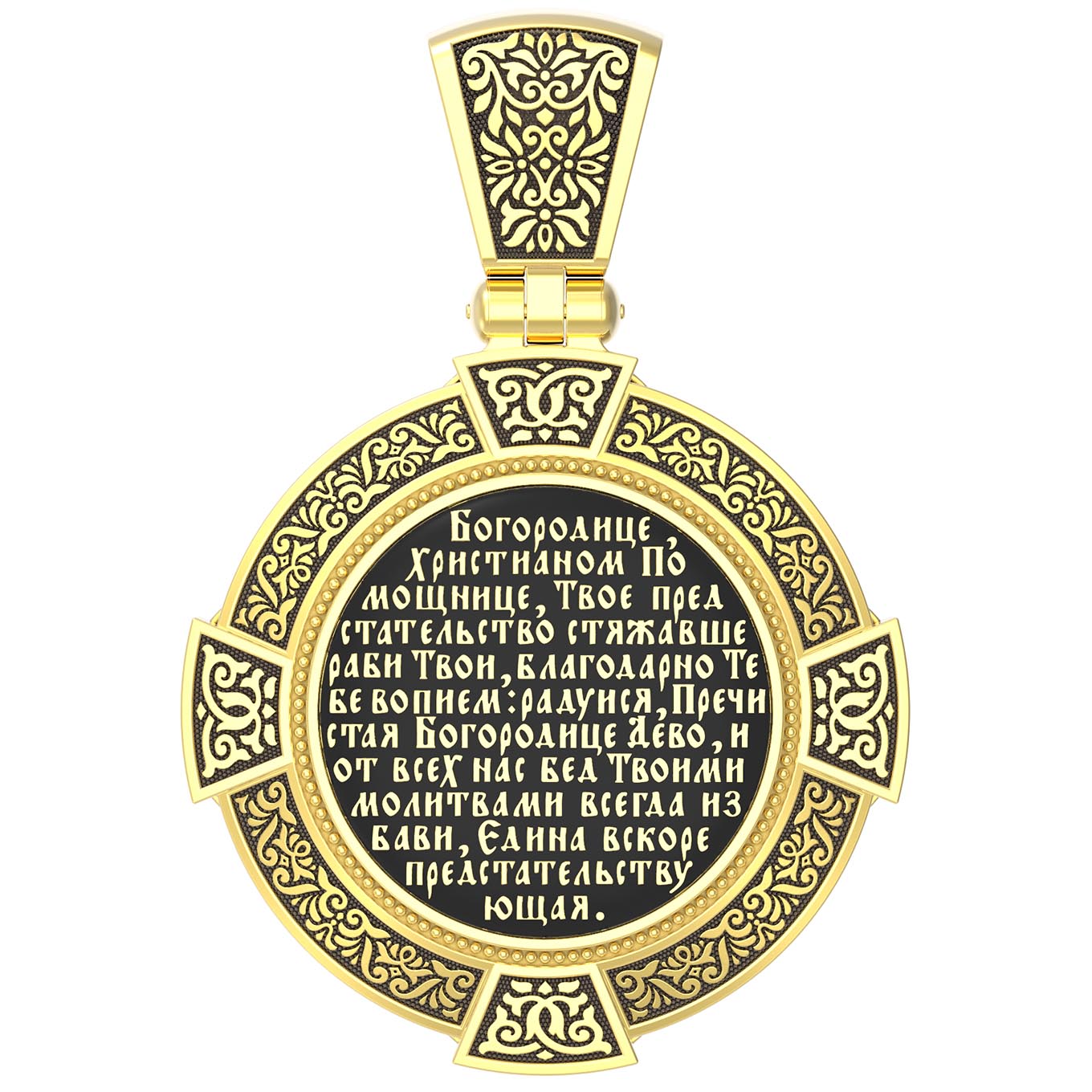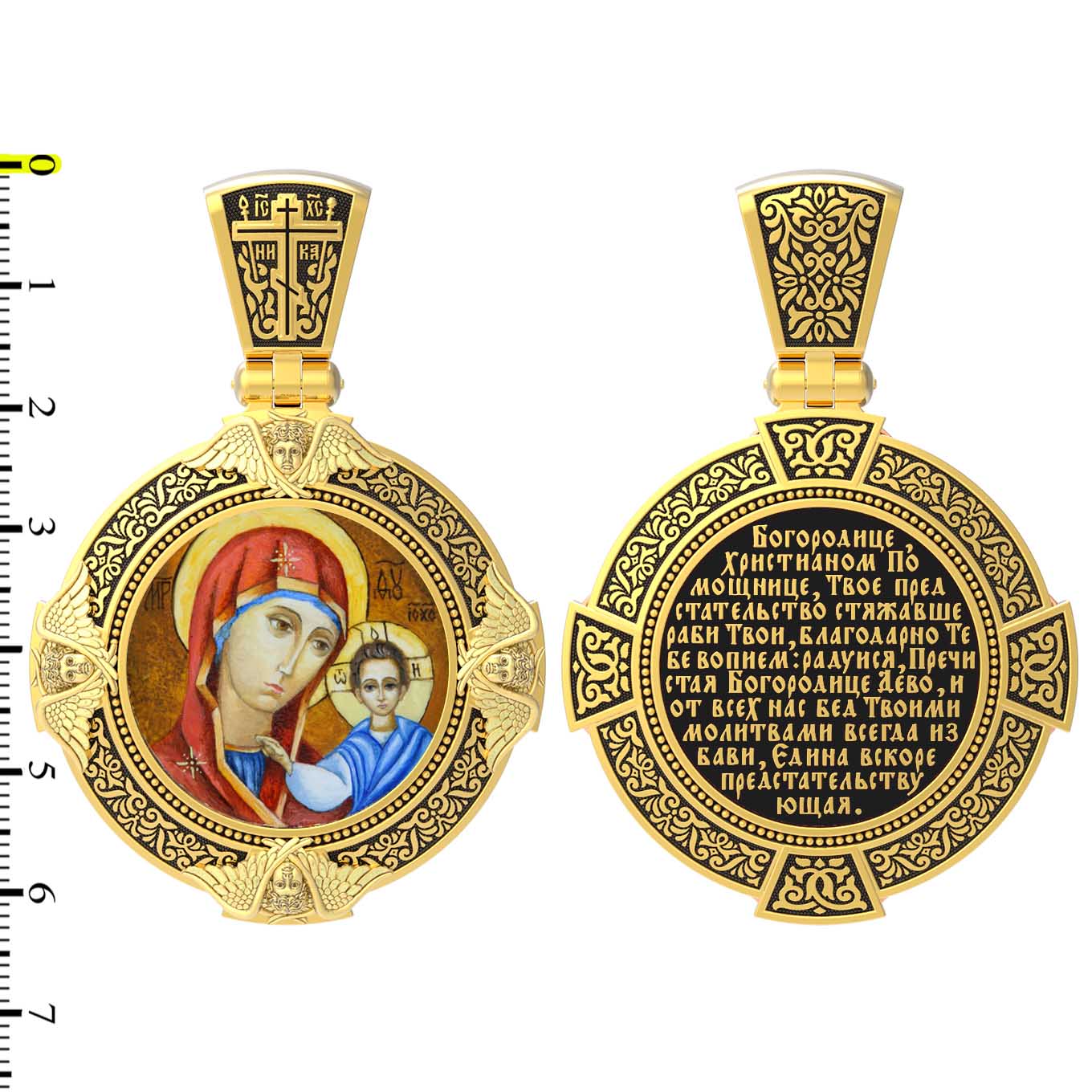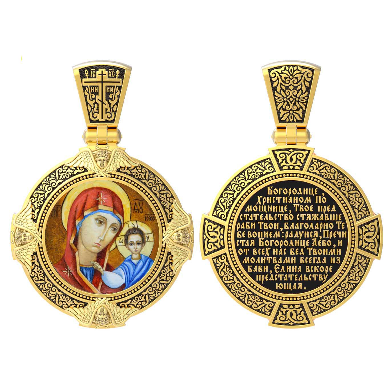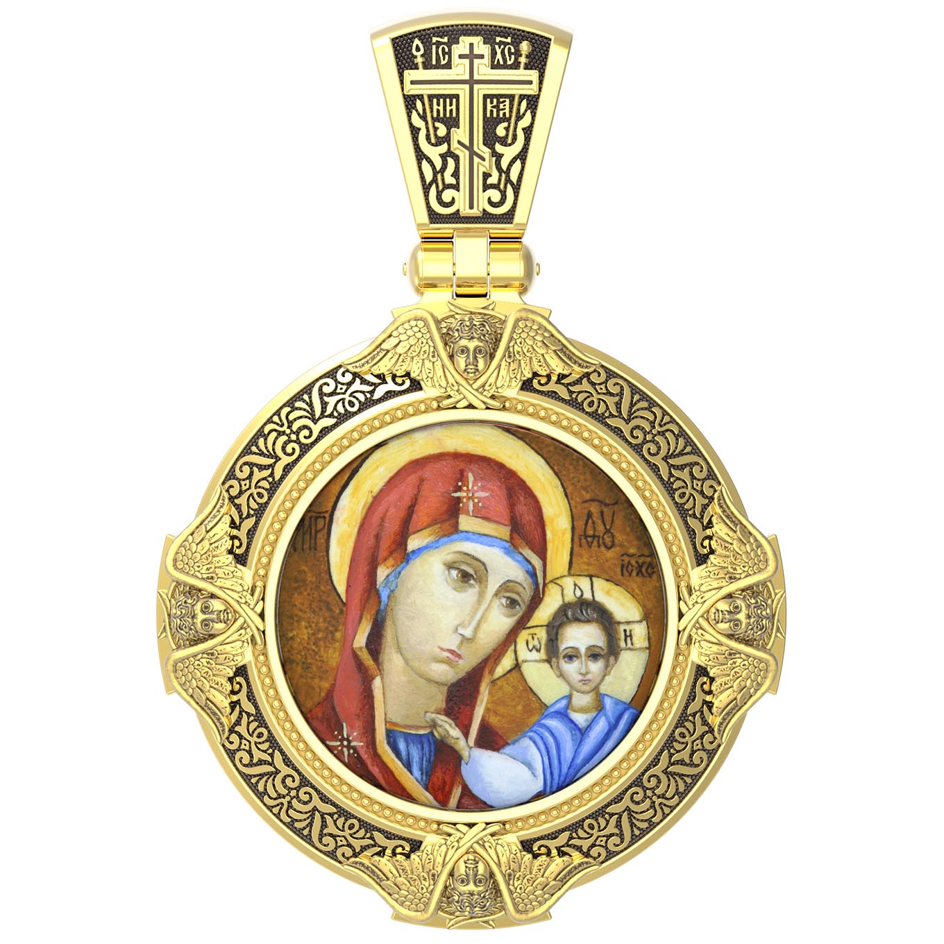 На лицевой стороне образка изображена Казанская икона Божией Матери. Пресвятая Богородица — милосердная заступница, просительница за нас перед Богом. Она стала воистину нашей Матушкой, охраняющей и поддерживающей нас от рождения до самой смерти, а Ее благодатная помощь изливается на нас по молитвам у ее чудотворных икон. Казанская икона явилась в 1579 году в Казани, вскоре после взятия Казанского царства у татар Иоанном Грозным. Этот образ Богородицы не раз сопровождал русский народ в бедствиях. Икона Божией Матери Казанская вдохновляла русских ратников в период Смутного времени при освобождении Москвы от поляков. Перед Казанской иконой в 1709 году, накануне Полтавской победы, император Петр I молился о даровании победы русскому войску. В 1812 году накануне отъезда в действующую армию перед чудотворной иконой Божией Матери молился князь Михаил Кутузов. Не только государственным мужам и дружинам указывала путь икона — по доброй традиции именно этой иконой благословляют на брак молодых родители, длинным списком чудес сопровождается этот образ Богоматери — один из самых любимых на Руси. Существует множество древних списков с этой удивительной иконы. На кулонном кольце изображен Спас Нерукотворный — образ Господа и Спасителя нашего Иисуса Христа, чудесно отпечатавшийся на плате, котором Христос вытер свой лик.