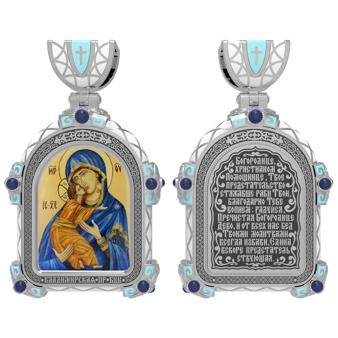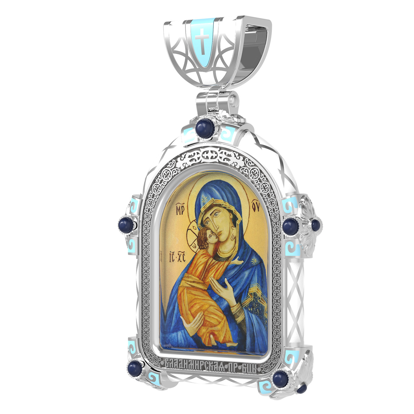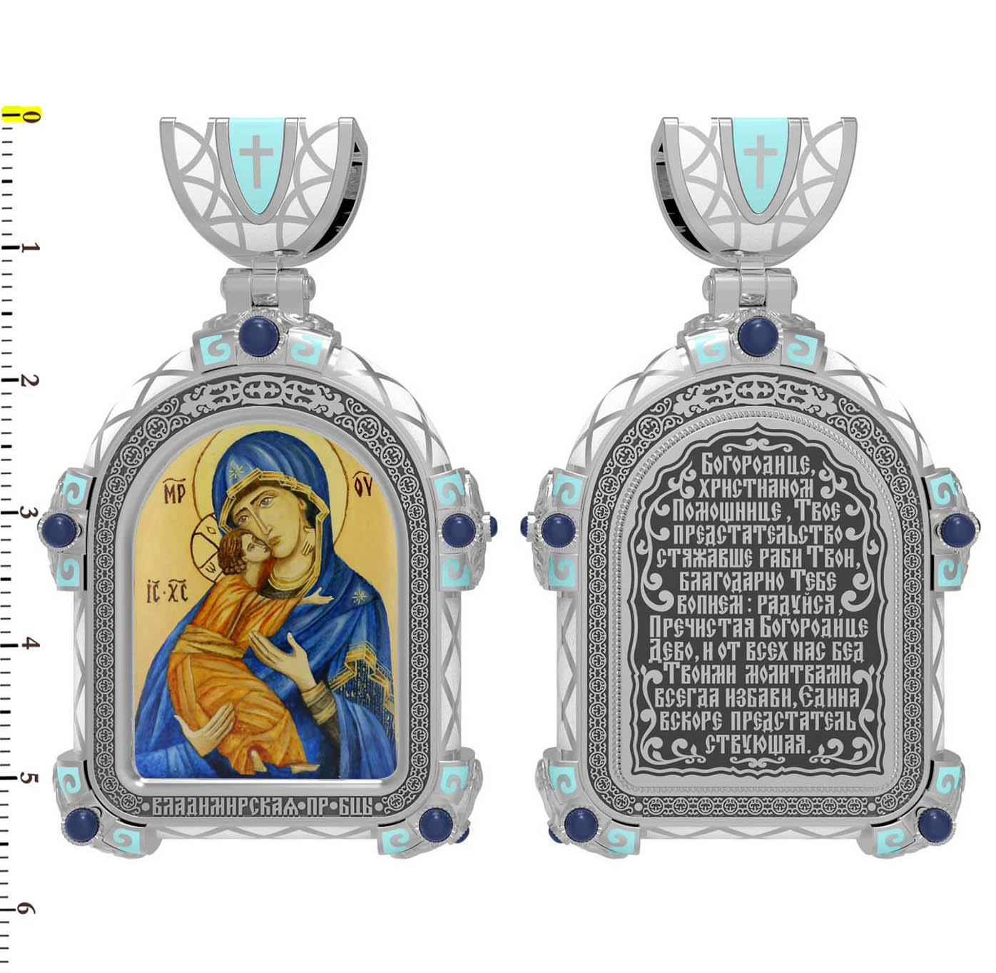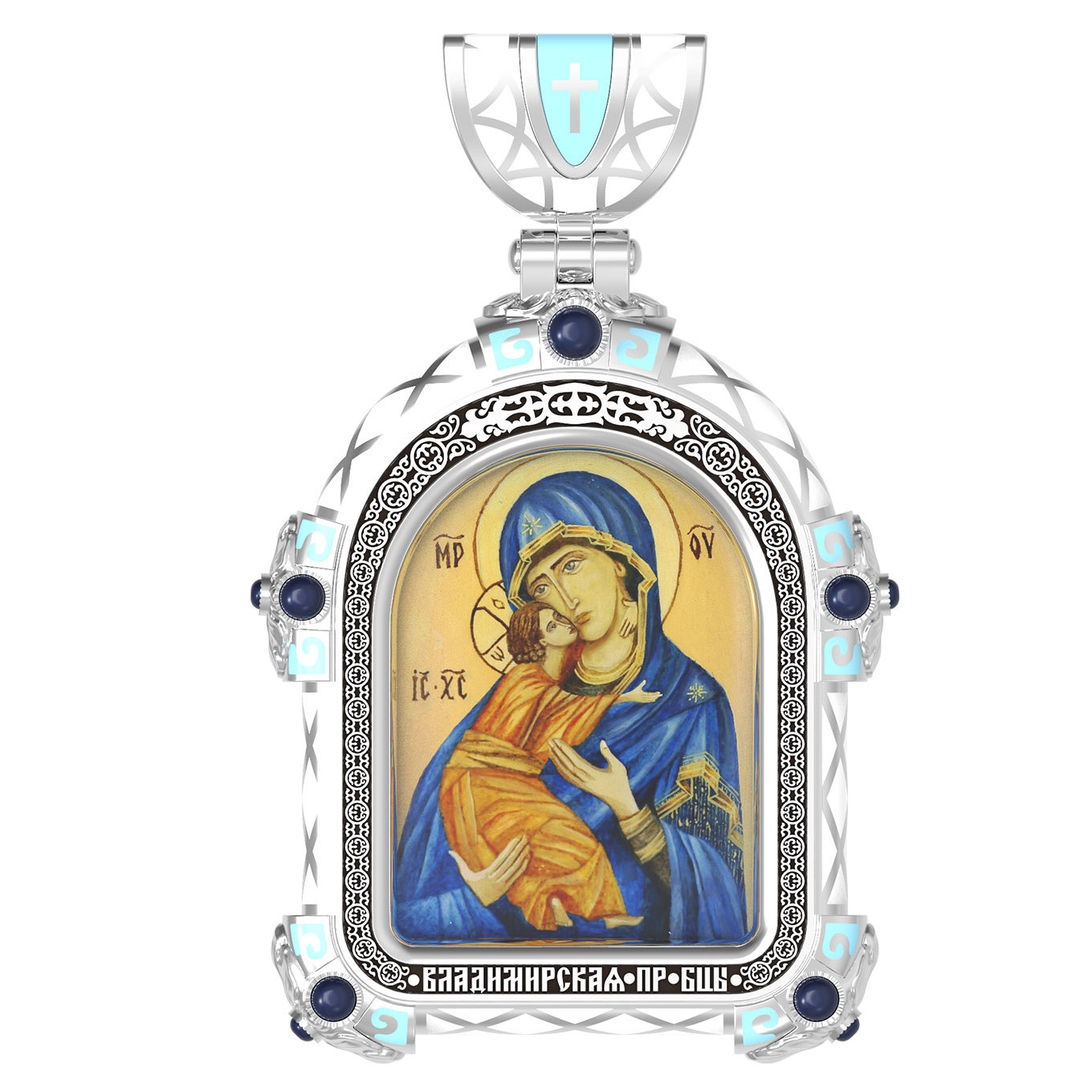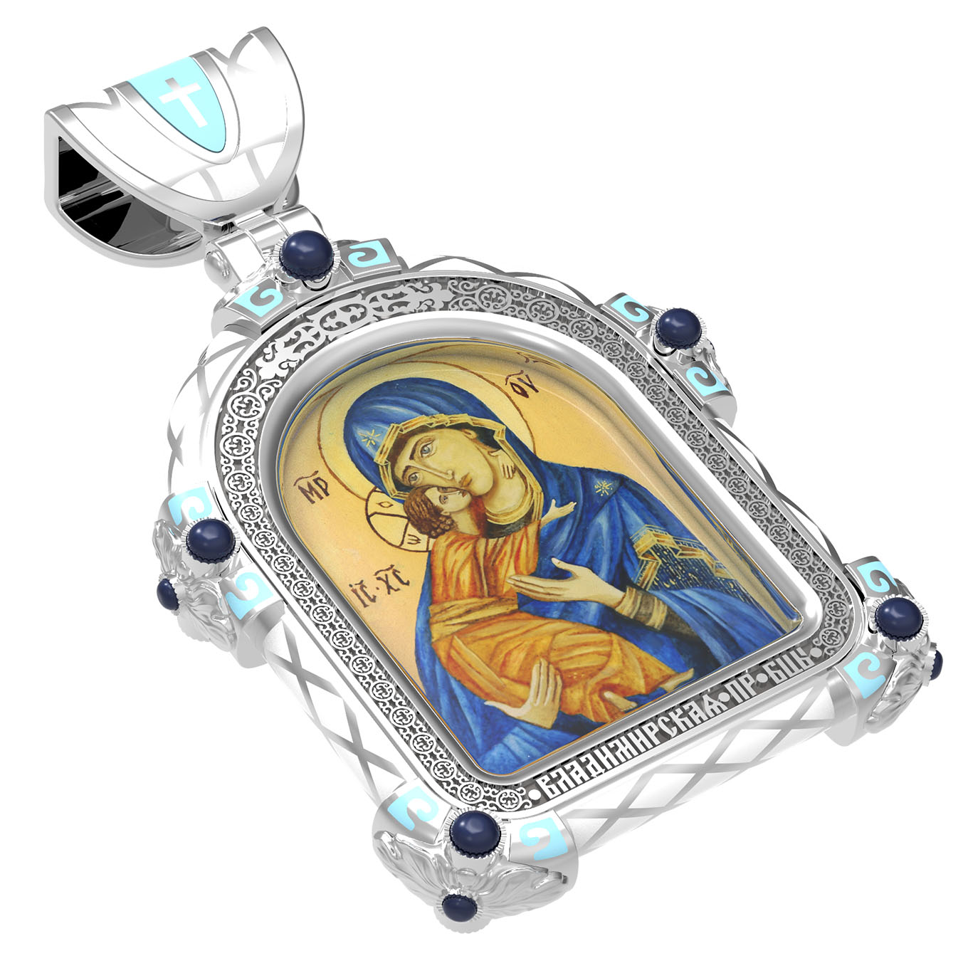 На лицевой стороне образка изображена Владимирская икона Божией Матери — одна из самых чтимых святынь Русской православной церкви. По преданию, икона была написана Святым апостолом и евангелистом Лукой во время земной жизни Богородицы. Дева Мария, увидев Свое изображение, молвила: «Отныне ублажат Мя вси роди. Благодать Рождшегося от Меня и Моя с сим образом да будет». Образ написан в лирическом иконографическом типе «Умиление». Младенец припал щекой к щеке Матери и тянется к ней правой рукой, другой нежно обнимая за шею. Икона вплоть до V века находилась в Иерусалиме, затем была перевезена в Византию. На Русь икона была привезена в 1131 г. За прошедшие столетия святыня неоднократно переезжала из Владимира в Москву и обратно, не раз спасая страну от захватчиков. Русская Православная Церковь установила троекратное празднование Владимирской иконе Божьей Матери. Каждый из дней празднования связан с избавлением русского народа от порабощения иноплеменниками по молитвам ко Пресвятой Богородице. В последующие века у иконы происходили многие важные исторические события: подписание актов, принятие присяги значимых государственных деятелей и возведение на престол. На кулонном кольце изображен Спас Нерукотворный — образ Господа и Спасителя нашего Иисуса Христа, чудесно отпечатавшийся на плате, котором Христос вытер свой лик.