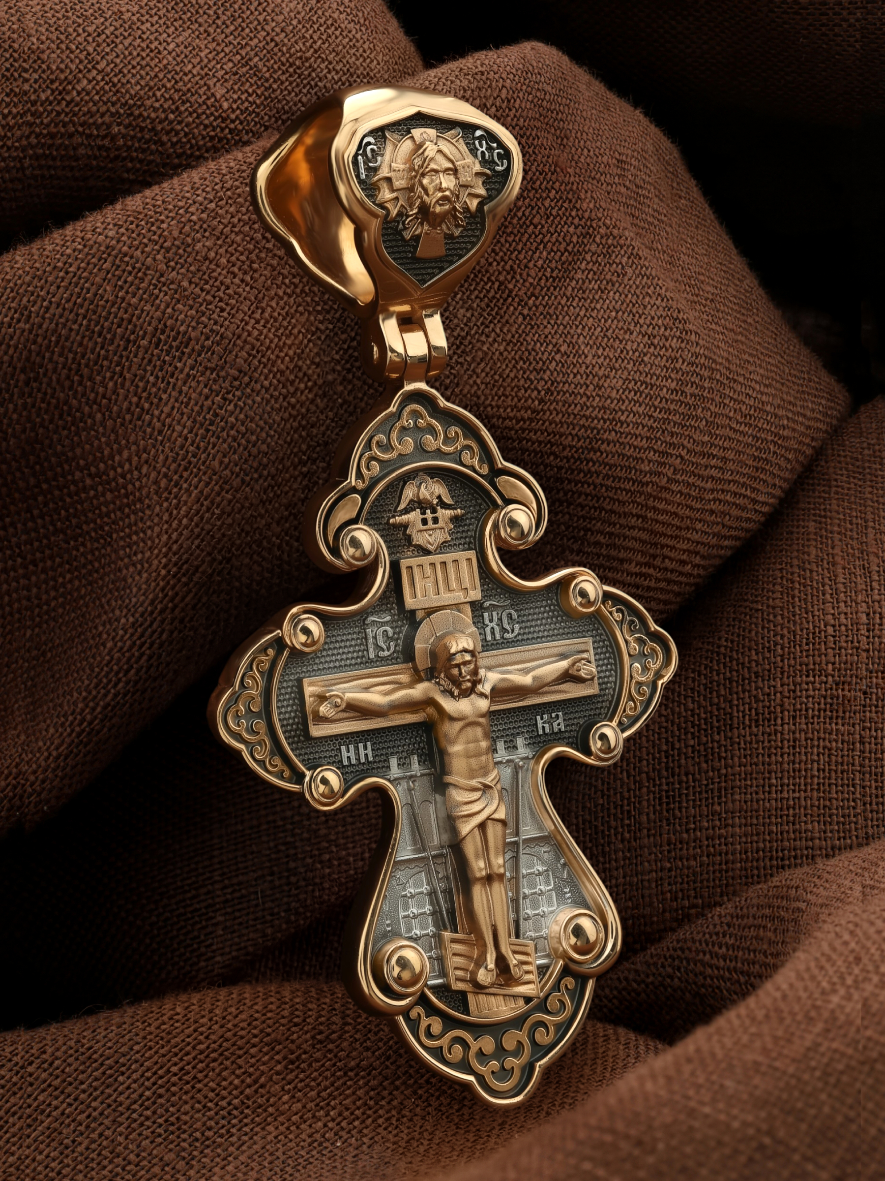 На лицевой стороне креста изображено Распятие Господа и Спасителя нашего Иисуса Христа, отдавшего Себя на смерть, для искупления грехов мира. Крест является символом жертвенной любви Всеблагого Бога к падшим людям, всепобеждающим духовным оружием христиан, основанием и средоточием церковной жизни. Господь сказал: кто хочет идти за Мною, отвергнись себя, и возьми крест свой, и следуй за Мною. (Мк. 8: 34). На верхней табличке, выше головы Иисуса, расположена надпись, составленная Понтием Пилатом — «IНЦI». Она означает «Иисус Назорей, Царь Иудейский». Надпись «IC» «ХC», означает Иисус Христос, помещается на разных сторонах поперечной перекладины креста. Рядом — слово «НИКА», что означает «победитель». За крестом высится Иерусалимская стена, в знак того, что Господь был распят вне стен города. На кулонном кольце изображен Нерукотворный образ Господа и Спасителя нашего Иисуса Христа, чудесно отпечатавшийся на плате, котором Христос вытер свой лик.