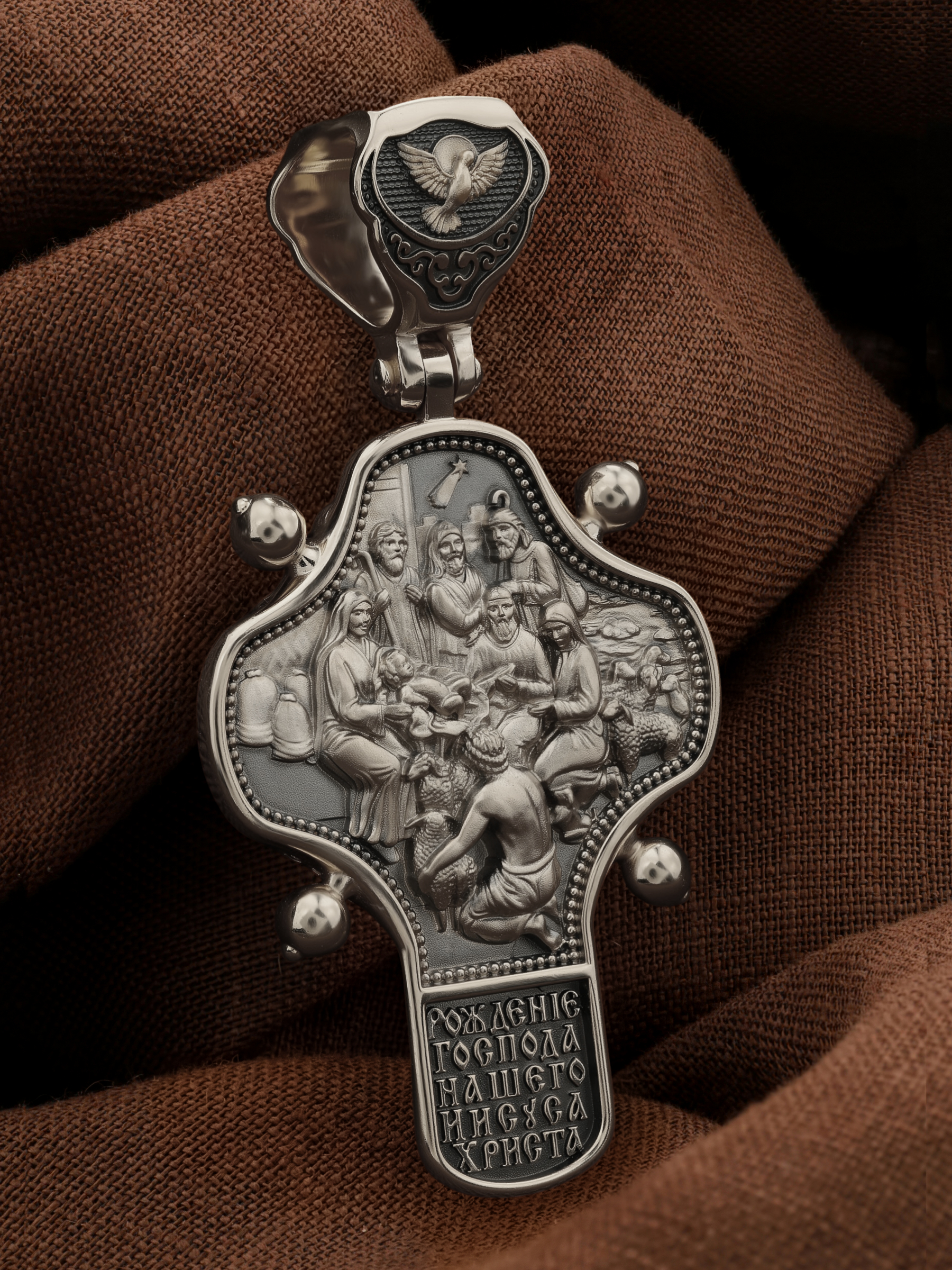 На оборотной стороне креста помещено изображение иконы «Рождество Христово». Господь Иисус Христос родился от Пресвятой Девы Марии в царствование императора Августа в городе Вифлееме. Как раз в это время Август повелел сделать всенародную перепись по всей своей империи, согласно которой каждый житель Палестины должен был идти в тот город, к которому испокон веков принадлежал его род. Пресвятая Богородица и праведный Иосиф, как происходившие от рода Давидова, должны были идти в Вифлеем (город Давида), чтобы внести свои имена в список подданных кесаря: «Пошел также и Иосиф из Галилеи, из города Назарета, в Иудею, в город Давидов, называемый Вифлеем, потому что он был из дома и рода Давидова, записаться с Мариею, обрученною ему женою, которая была беременна. Когда же они были там, наступило время родить Ей; и родила Сына своего Первенца, и спеленала Его, и положила Его в ясли, потому что не было им места в гостинице» (Лк.2:4−7).После рождения Спасителя на поле близ Вифлеема простым пастухам явились ангелы, благовествовавшие о пришествии в мир Христа песней славословия Господу: «Слава в вышних Богу, и на земли мир, в человецех благоволение!». Они повелели пастырям идти поклониться Младенцу. В это же время к Рожденному с дарами из дальних стран — златом, ливаном и смирной — пришли волхвы, которых к яслям Богомладенца привела воссиявшая в небе новая звезда. На кулонном кольце изображен Дух Святой в виде голубя сходящего с небес.