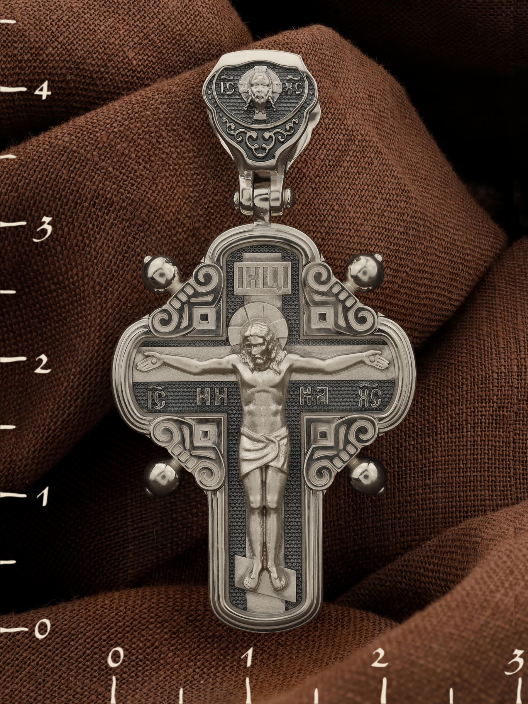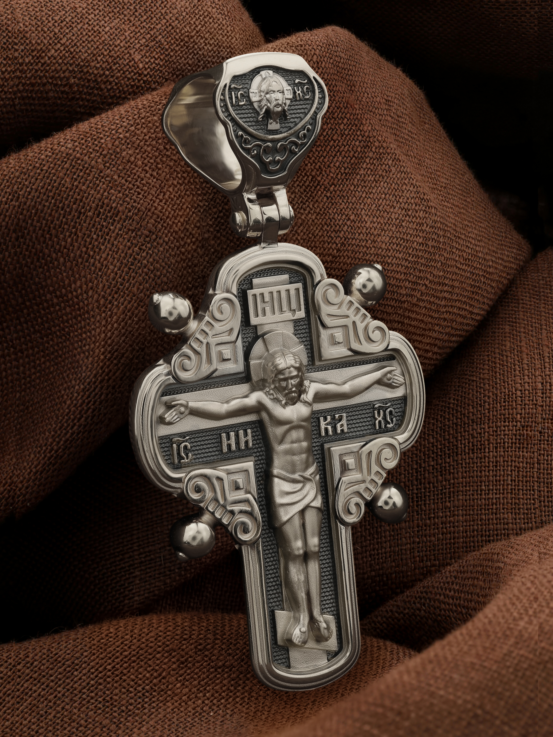 На лицевой стороне креста изображено Распятие Господа и Спасителя нашего Иисуса Христа, отдавшего Себя на смерть, для искупления грехов мира. Крест является символом жертвенной любви Всеблагого Бога к падшим людям, всепобеждающим духовным оружием христиан, основанием и средоточием церковной жизни. Господь сказал: кто хочет идти за Мною, отвергнись себя, и возьми крест свой, и следуй за Мною. (Мк. 8: 34). На верхней табличке, выше головы Иисуса, расположена надпись, составленная Понтием Пилатом — «IНЦI». Она означает «Иисус Назорей, Царь Иудейский». Надпись «IC» «ХC», означает Иисус Христос, помещается на разных сторонах поперечной перекладины креста. Рядом — слово «НИКА», что означает «победитель». На кулонном кольце изображен Нерукотворный образ Господа и Спасителя нашего Иисуса Христа, чудесно отпечатавшийся на плате, котором Христос вытер свой лик.
