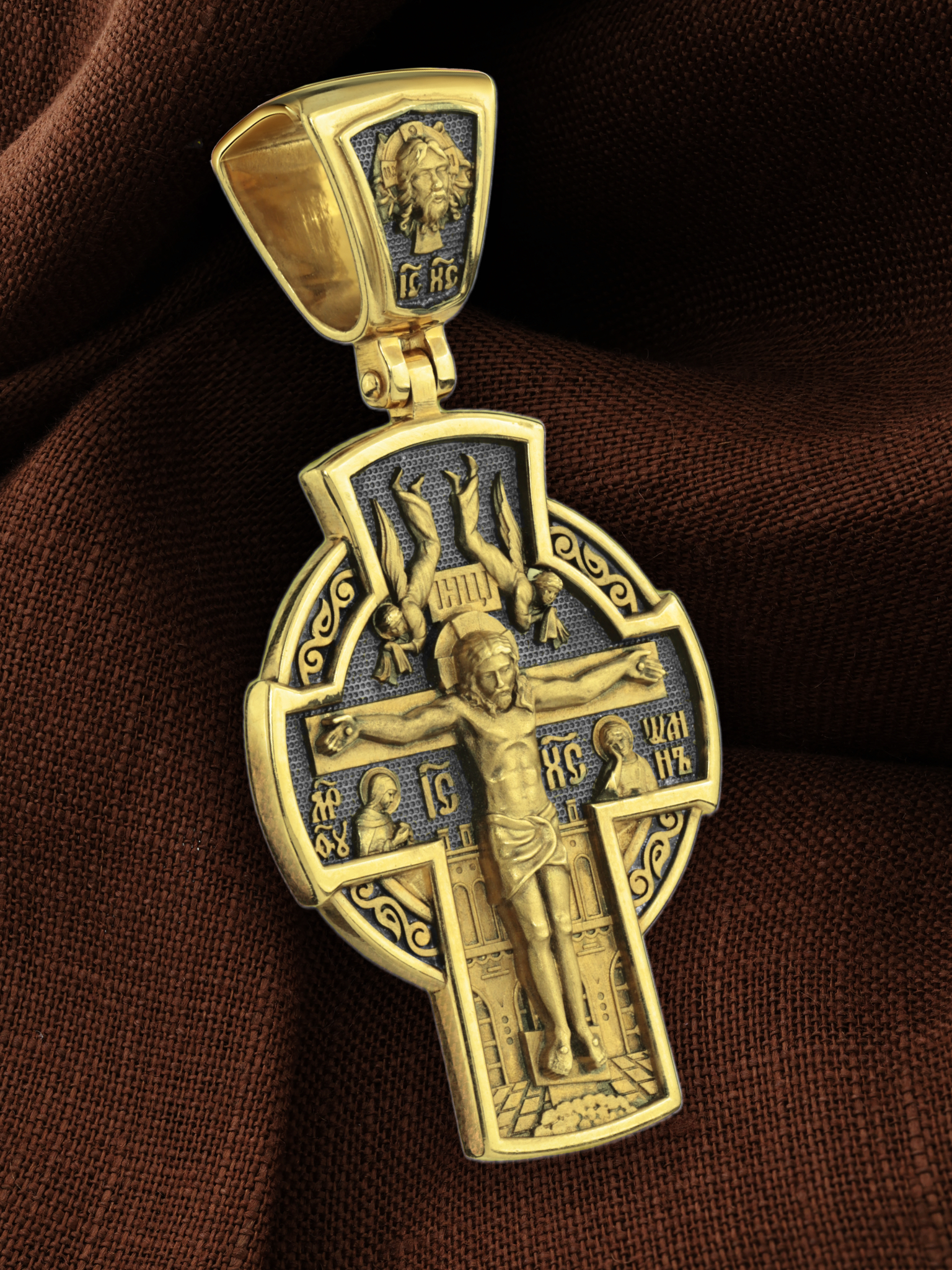 На лицевой стороне креста изображено Распятие Господа и Спасителя нашего Иисуса Христа, отдавшего Себя на смерть, для искупления грехов мира. Крест является символом жертвенной любви всеблагого Бога к падшим людям, всепобеждающим духовным оружием христиан, основанием и средоточием церковной жизни. Верхняя перекладина символизирует титло — табличку, на которой, согласно Евангелию, было начертано: Иисус Назорей Царь Иудейский (IНЦI). Надпись «IC» «ХC», означает Иисус Христос, помещается ниже поперечной перекладины креста. Слева от Распятия изображена Пресвятая Богородица, справа — апостол и евангелист Иоанн Богослов, один из ближайших учеников Иисуса Христа. За крестом высится Иерусалимская стена, в знак того, что Господь был распят вне стен города. Возвышение, на котором стоит Крест, символизирует гору Голгофу, на которой произошло Распятие. На кулонном кольце изображен Нерукотворный образ Господа и Спасителя нашего Иисуса Христа, чудесно отпечатавшийся на плате, которым Христос вытер свой лик.