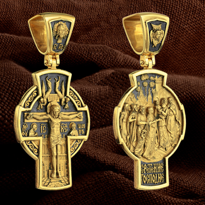 На оборотной стороне креста изображена икона Сретение Господне. В сороковой день по рождении Богомладенец был принесен в Иерусалимский храм. В это время жил в Иерусалиме праведный старец Симеон. Ему было откровение, что он не умрет, пока не увидит Христа Спасителя. По внушению свыше благочестивый старец пришел в храм в то время, когда Пресвятая Богородица и праведный Иосиф принесли туда Младенца Иисуса, чтобы исполнить законный обряд. Богоприимец Симеон взял Богомладенца на руки и, благословив Бога, изрек пророчество о Спасителе мира: «Ныне отпускаешь раба Твоего, Владыка, по слову Твоему, с миром, ибо видели очи мои спасение Твое, которое Ты уготовал пред лицем всех народов, свет к просвещению язычников и славу народа Твоего Израиля» (Лк. 2: 29–32). Пресвятой Деве праведный Симеон сказал: «Се, лежит Сей на падение и на восстание многих в Израиле и в предмет пререканий, и Тебе Самой оружие пройдет душу, да откроются помышления многих сердец». В храме была также 84-летняя вдовица Анна, пророчица, дочь Фануилова, которая постом и молитвой служила Богу в храме день и ночь. Она «славила Господа и говорила о Богомладенце всем, ожидавшим избавления в Иерусалиме». На кулонном кольце изображен шестикрылый Ангел — Серафим.