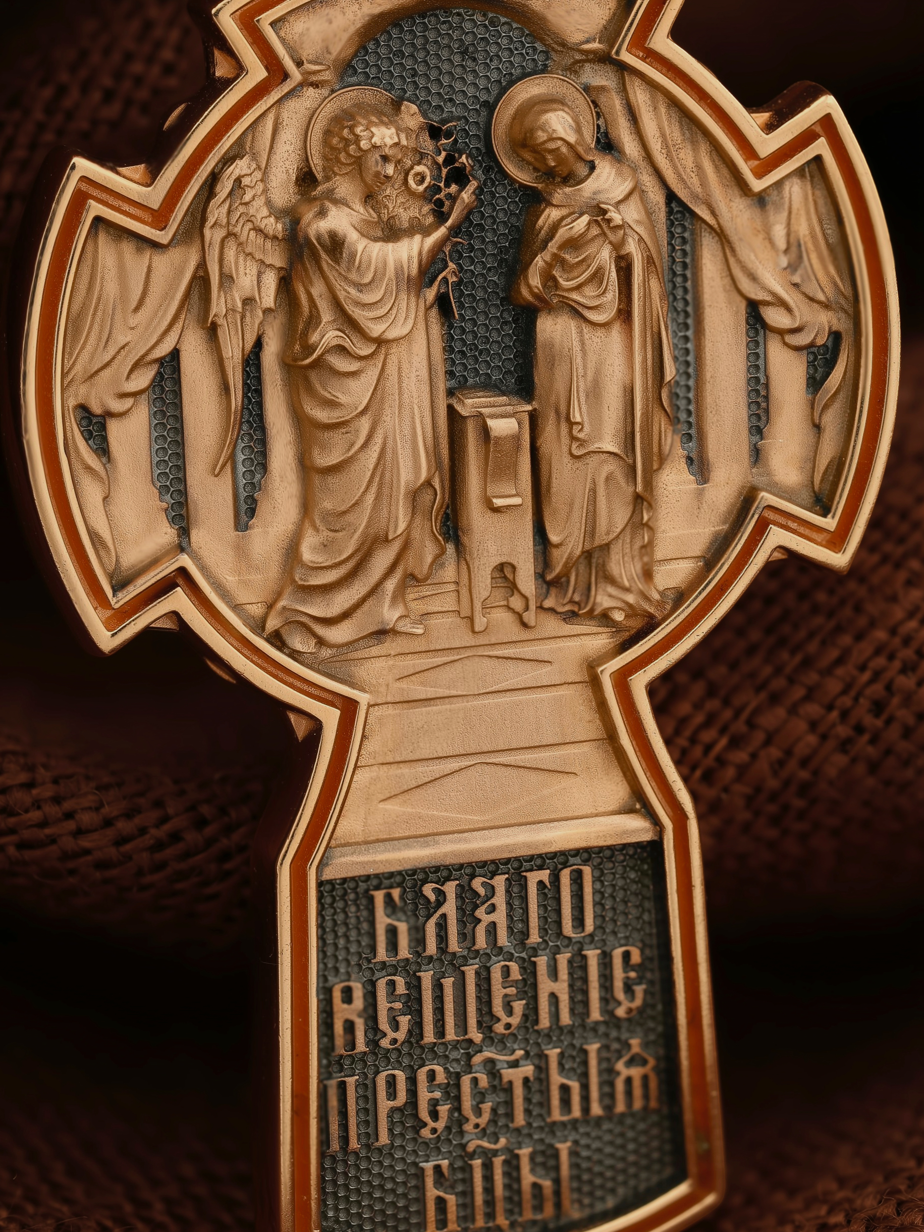 На оборотной стороне креста изображена икона «Благовещение Пресвятой Богородицы». Как нам повествует Священное Писание, Архангел Гавриил послан был от Бога в город Назарет к Пресвятой Деве Марии с радостной вестью, что Господь избрал Ее быть Матерью Спасителя мира. Ангел сказал: «Радуйся благодатная! Господь с Тобою! Благословенна Ты между женами». Мария cмутилась от слов Ангела и думала: что значит это приветствие? Ангел же продолжал говорить Ей: «не бойся, Мария, ибо Ты обрела благодать у Бога. И вот, Ты родишь Сына и наречешь имя Ему Иисус. Он будет велик, и назовется сыном Всевышнего, и Царству Его не будет конца…» На кулонном кольце изображен Ангел Серафим.